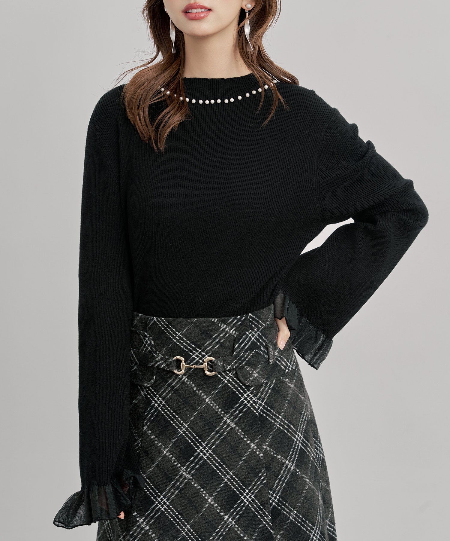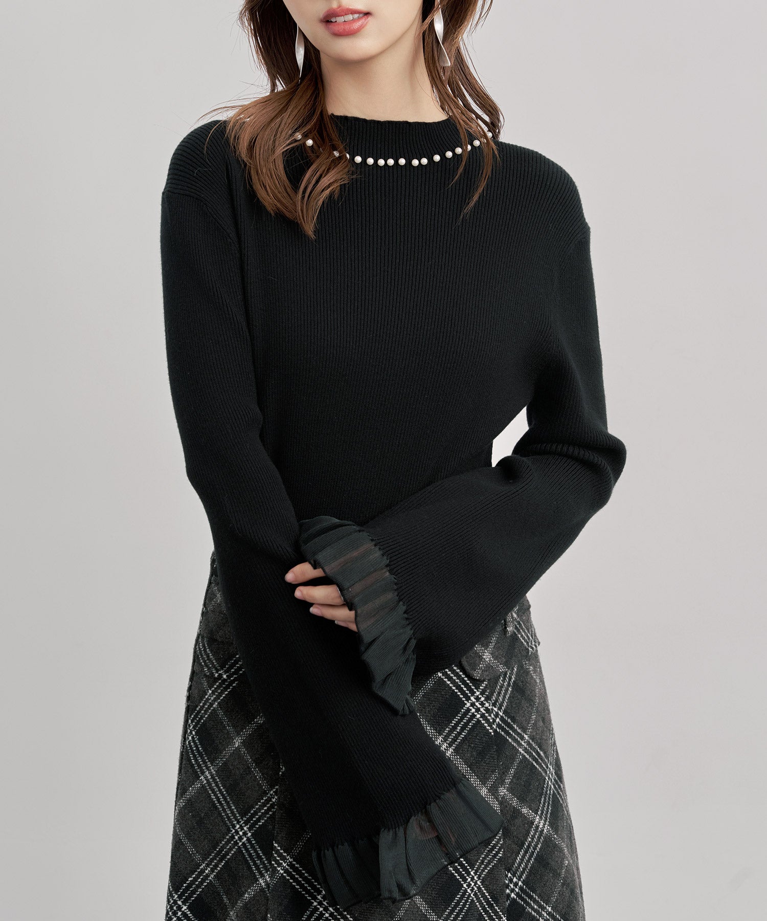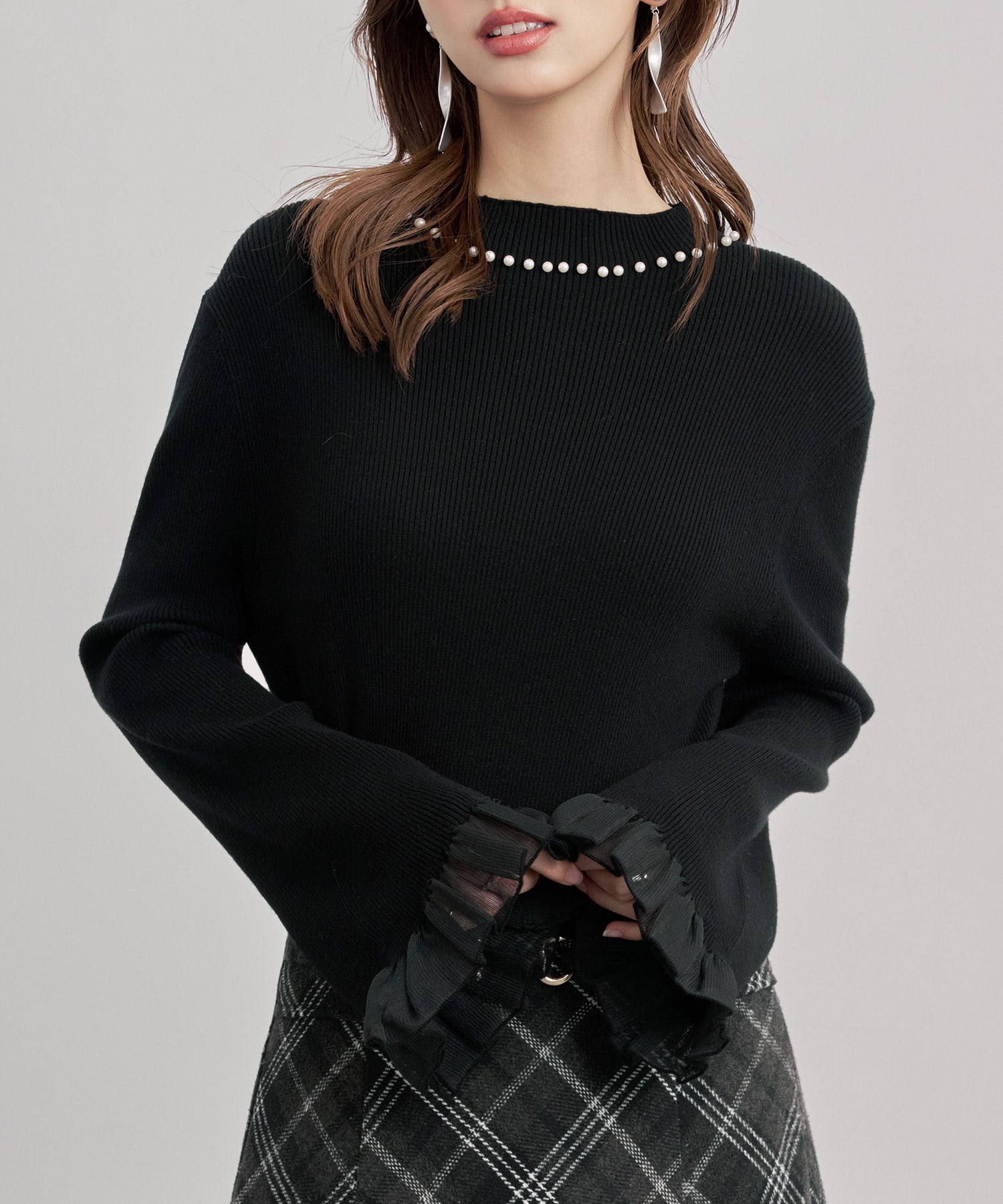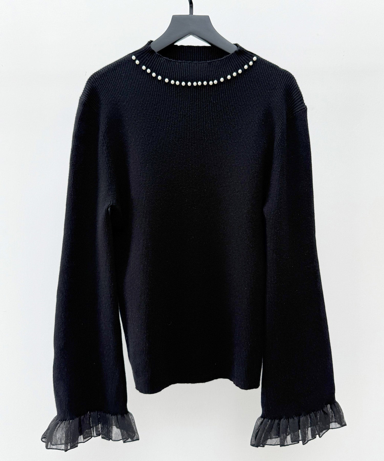 襟パールとシア素材フリルが女性らしさ満点の襟パール付リブ編みニットトップス。