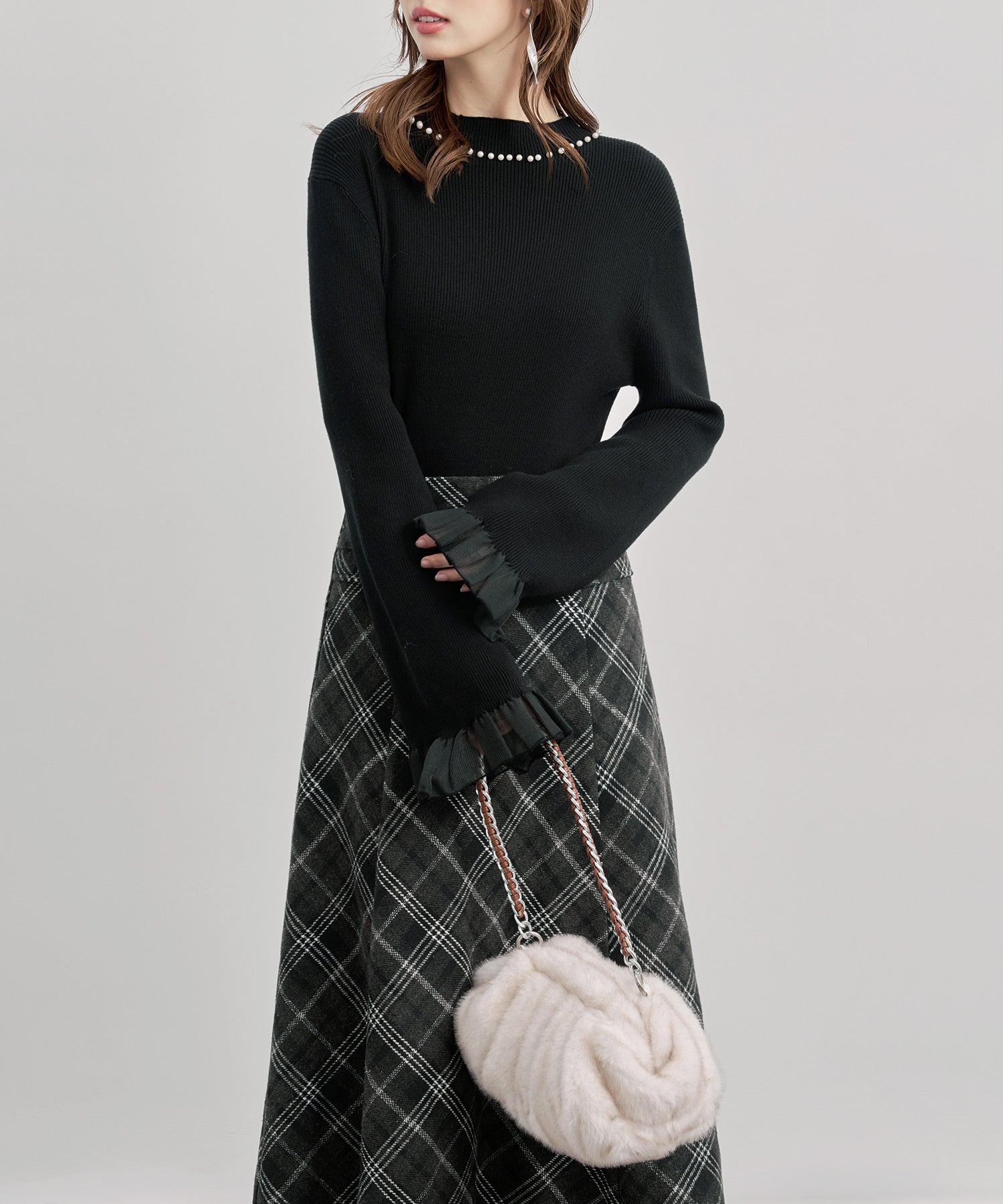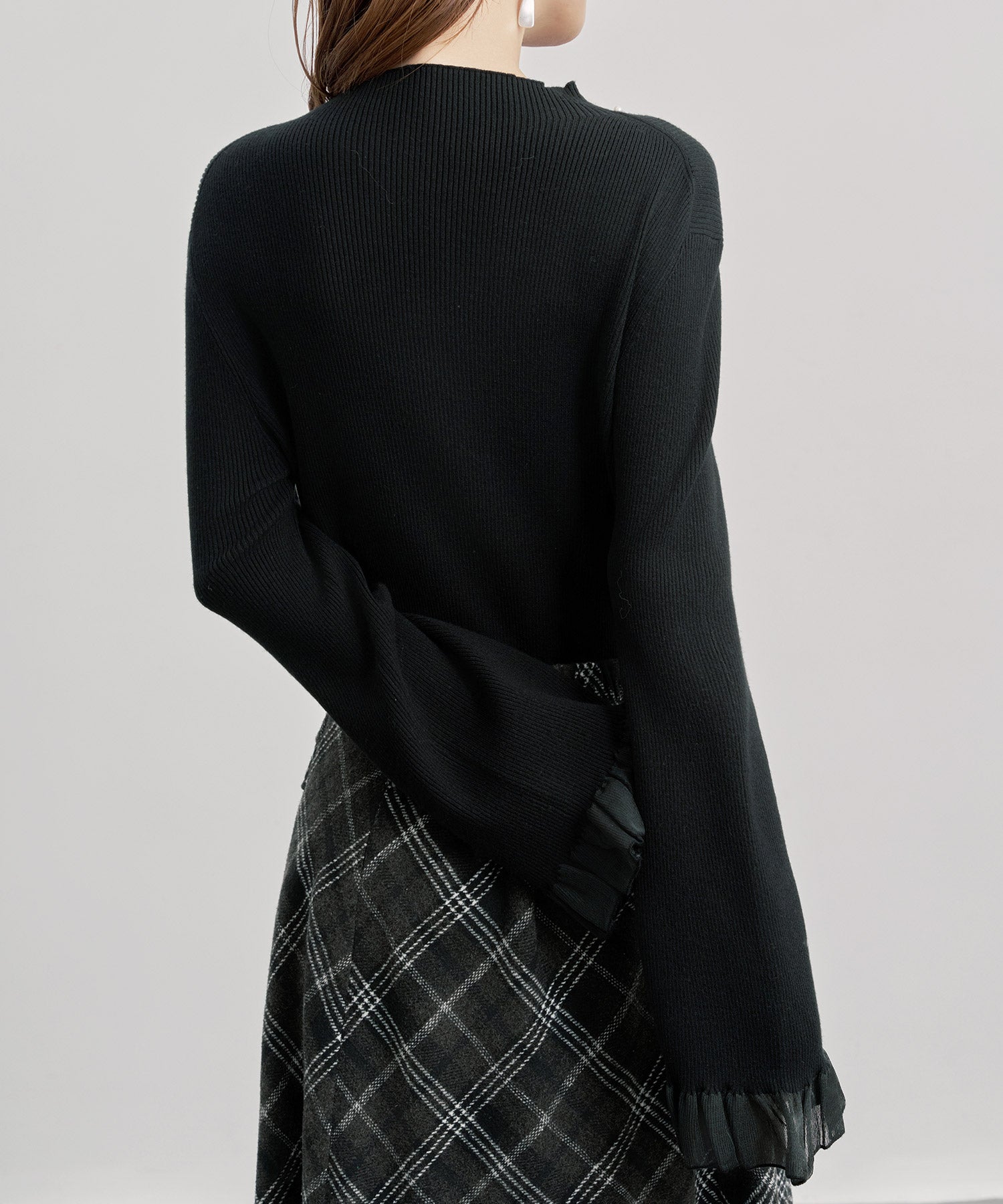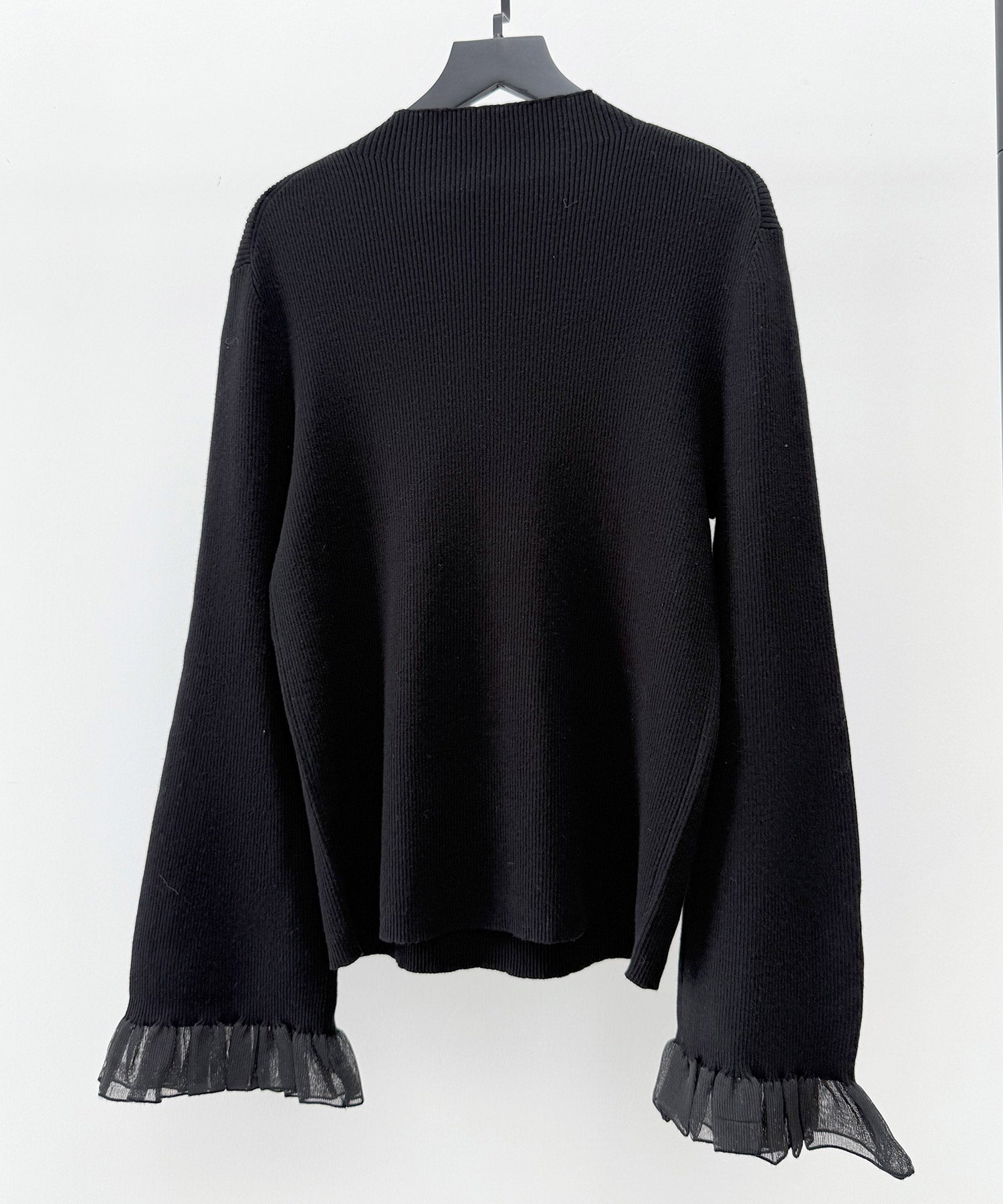 サーキュラー袖口にシアー素材のフリルを切り替えたデザインです。やや厚手のニットに軽さと華やかさを加えてくれます。