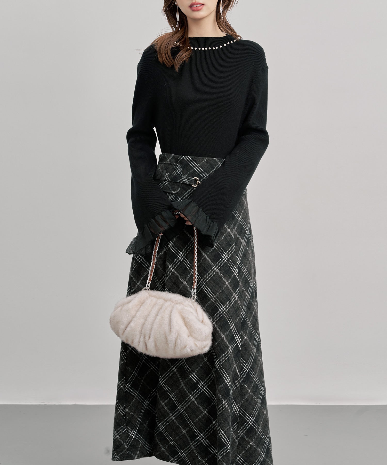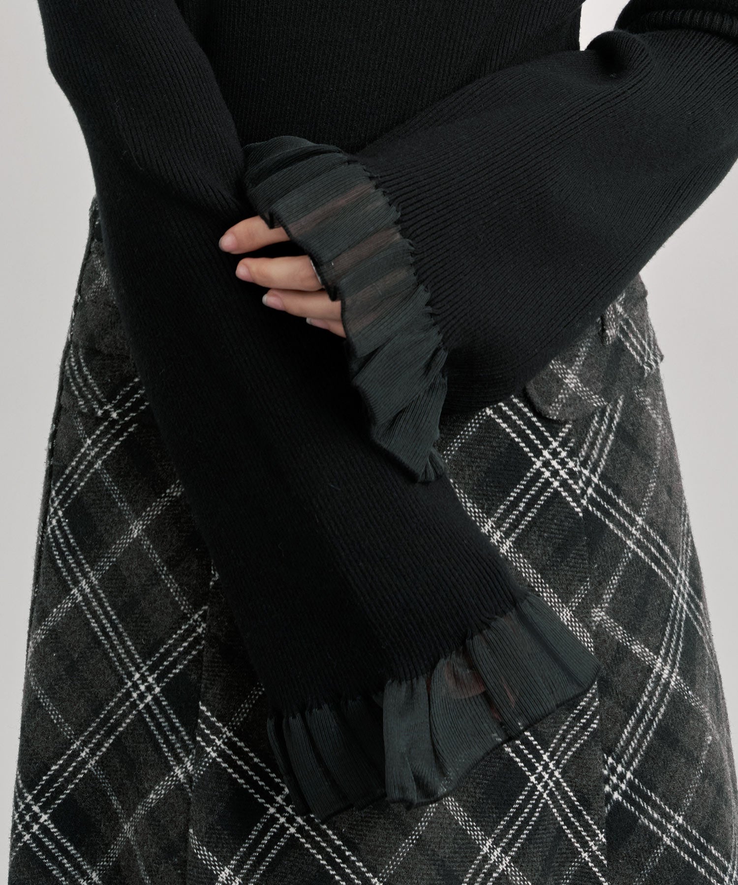 袖は長めが旬。手の甲まですっぽり隠すデザインで腕の長さも強調。フリルが揺れて可愛げのある袖口を演出できます。