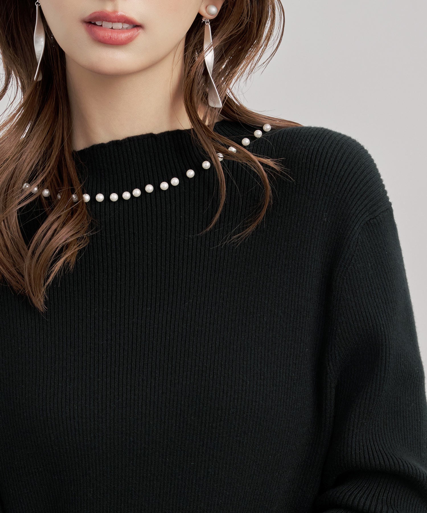 襟パール付リブ編みニットトップス sdp8069 ブラック