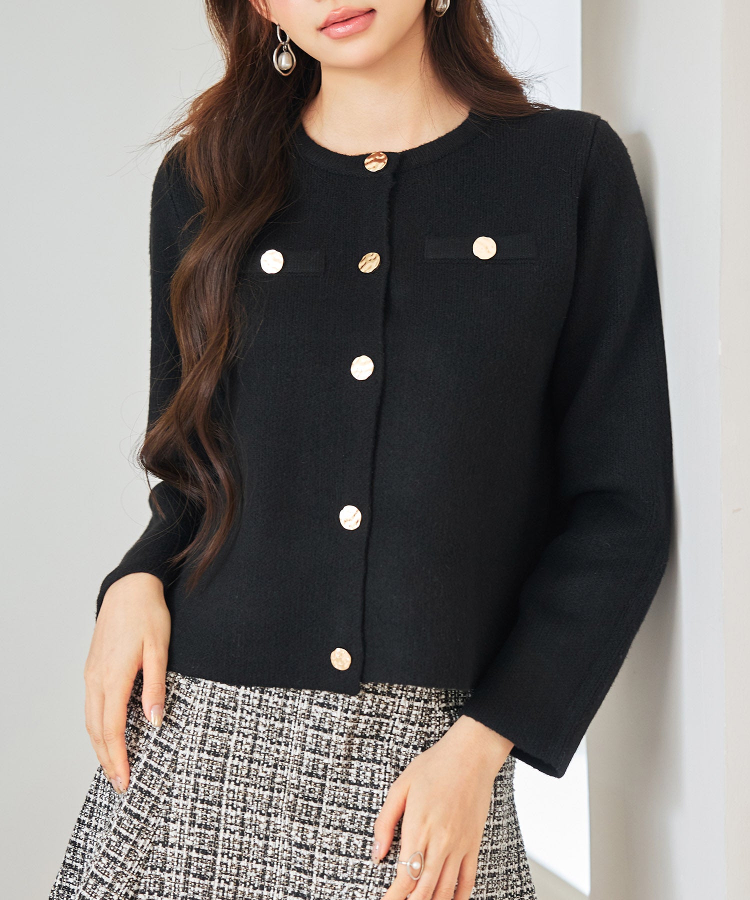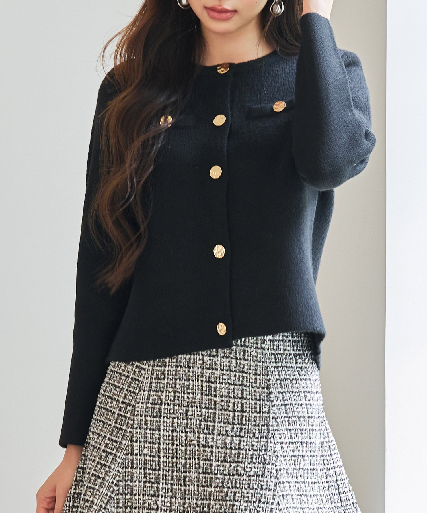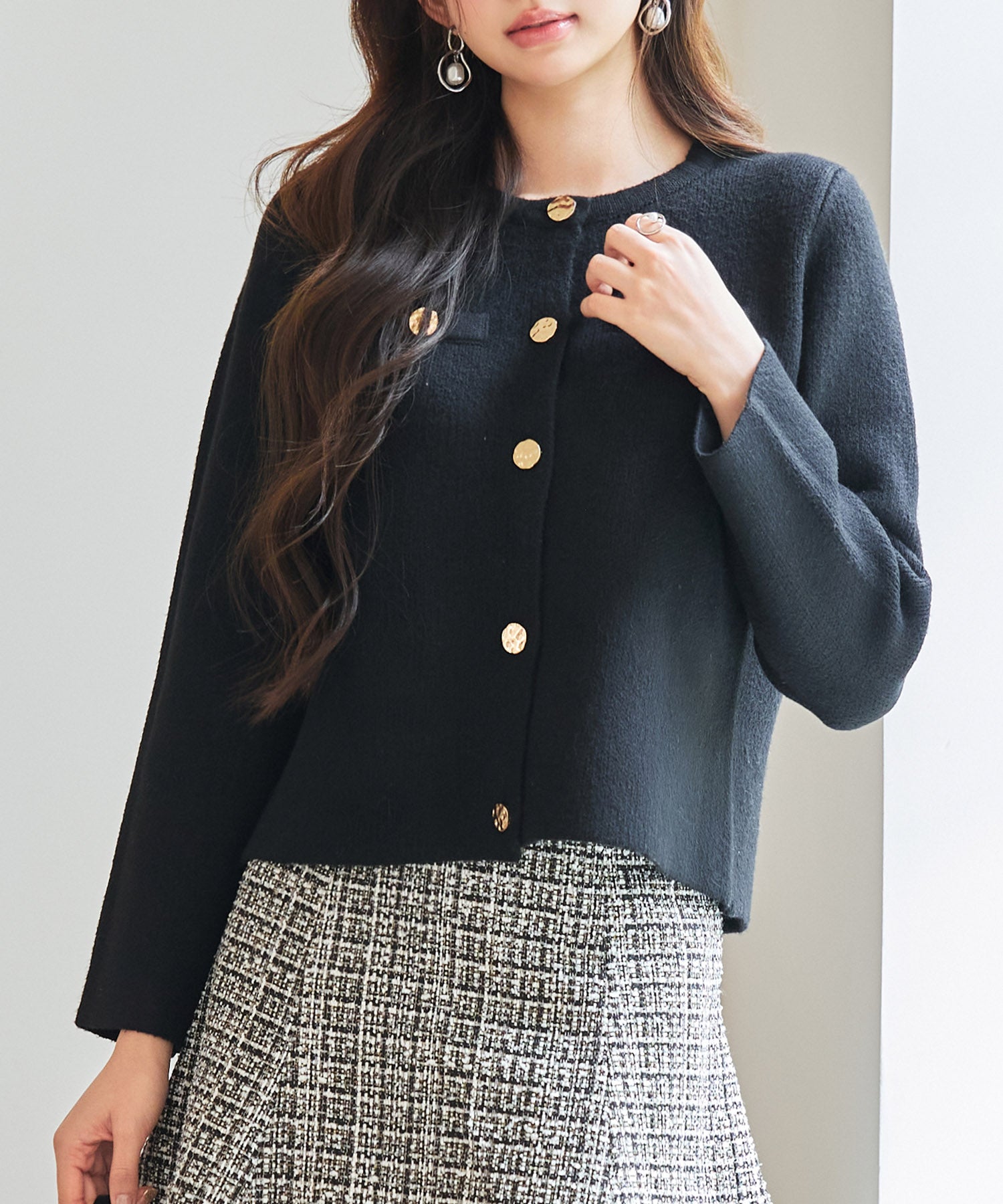 フロントボタンは存在感のあるゴールドのボタンで華やかに。ディテールのデザインがスタイル全体の高見えに一役買います。