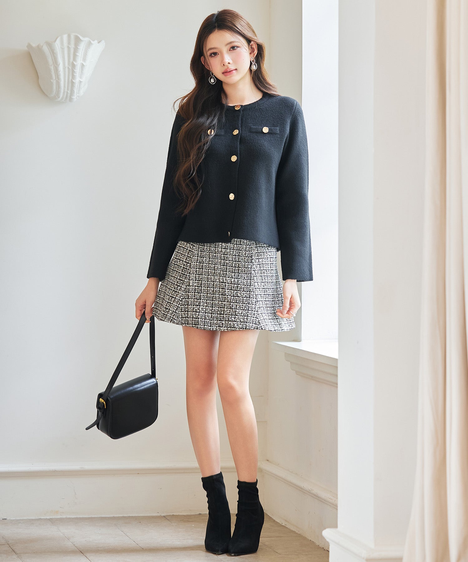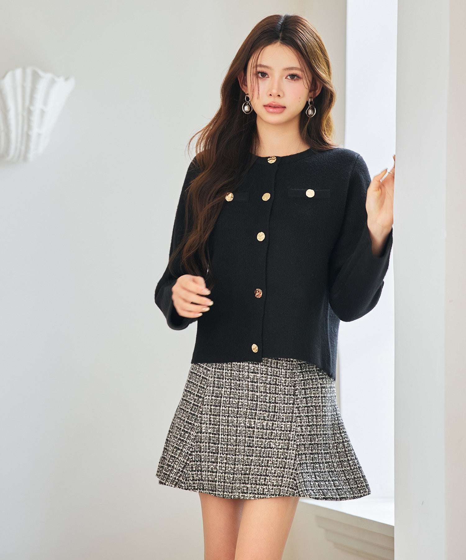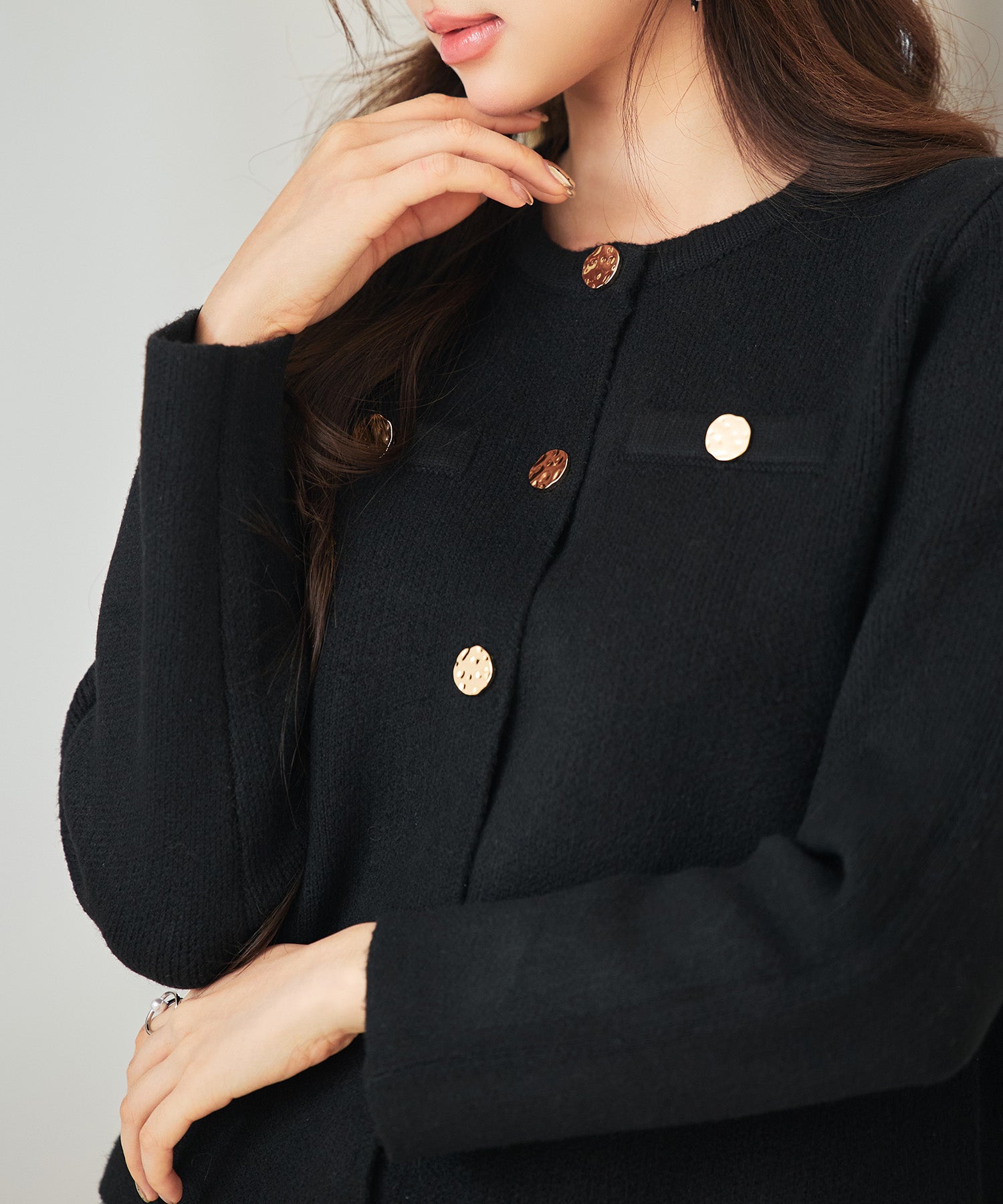 フロントボタンは存在感のあるゴールドのボタンで華やかに。ディテールのデザインがスタイル全体の高見えに一役買います。