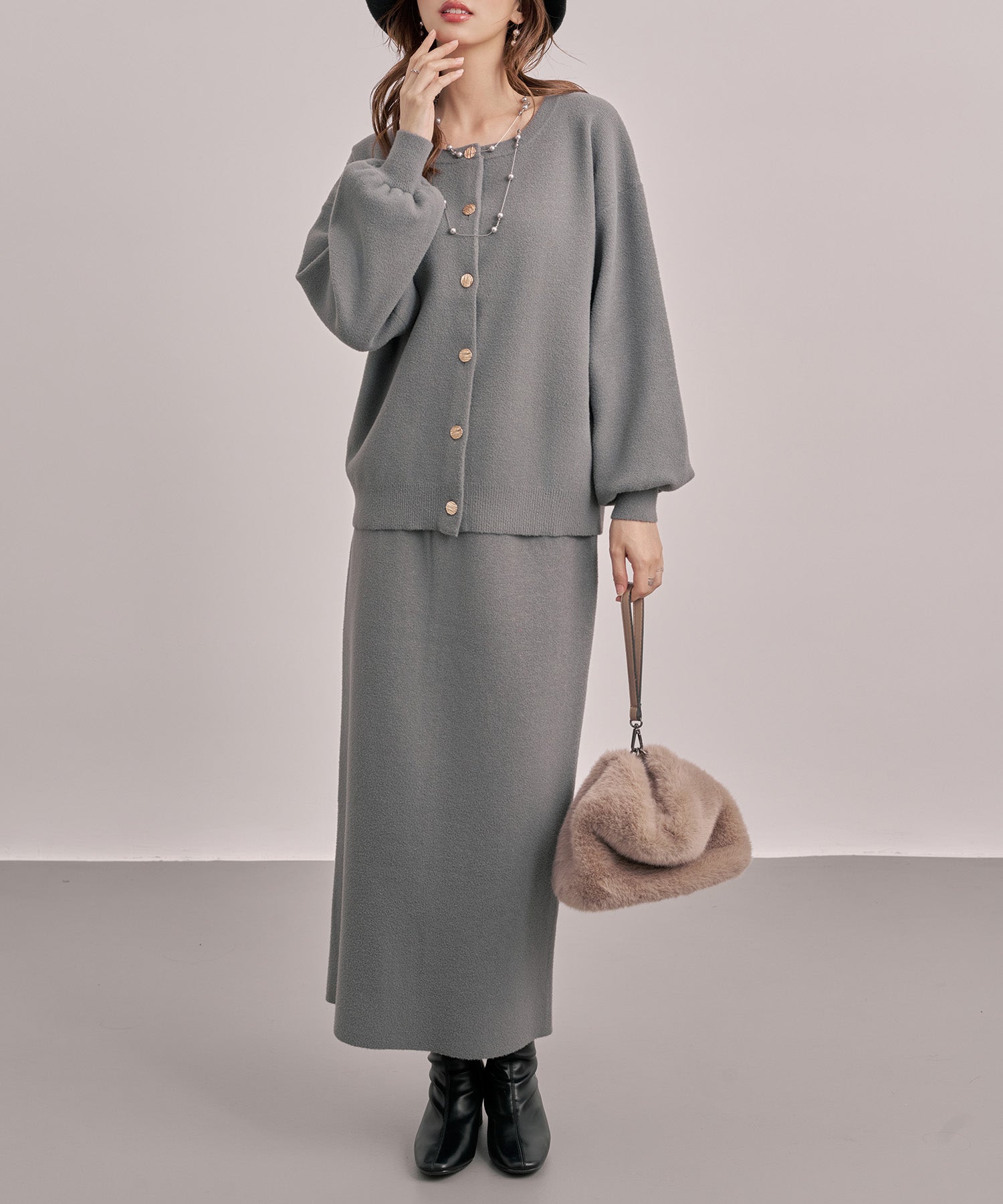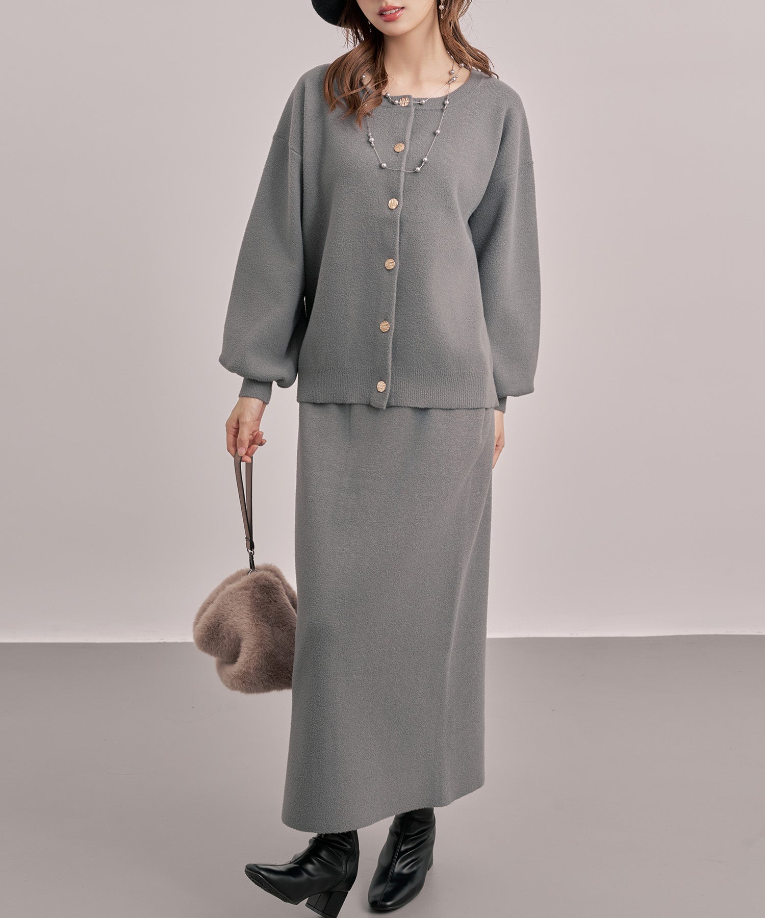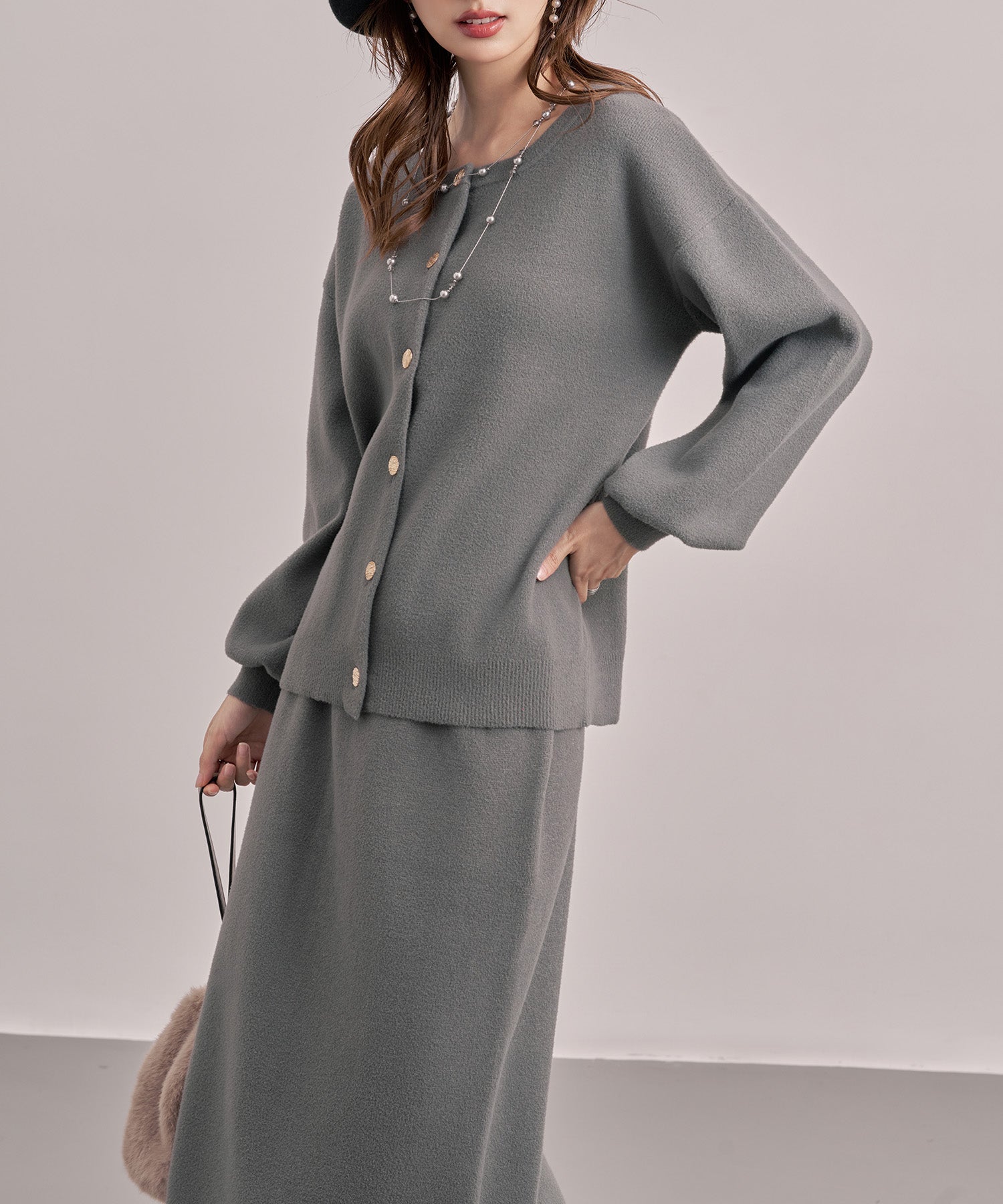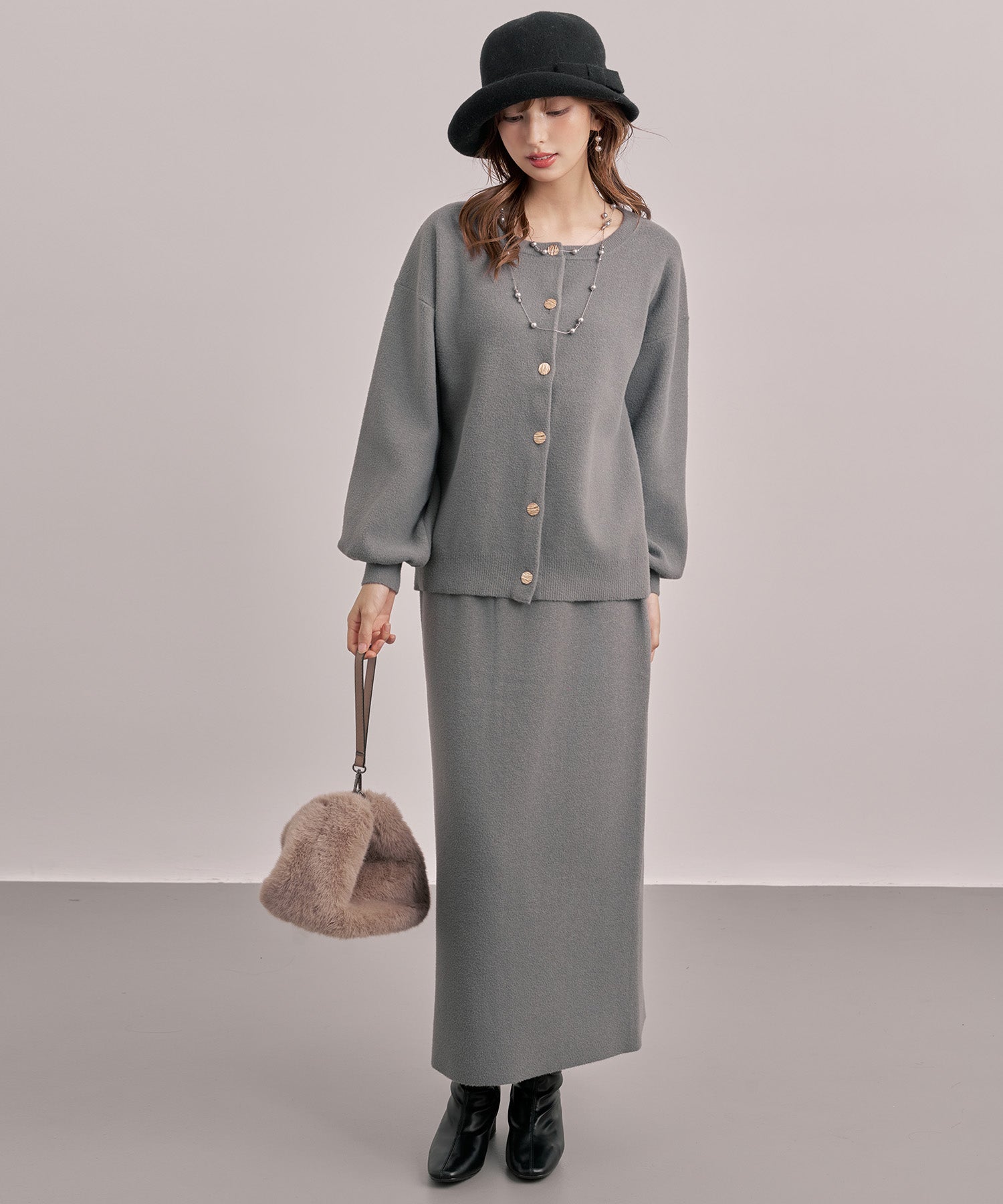 カーディガンとスカートで単品使いができる万能卯セットアップ。どちらもシンプルニットなので手持ちのアイテムと着回し抜群です。
