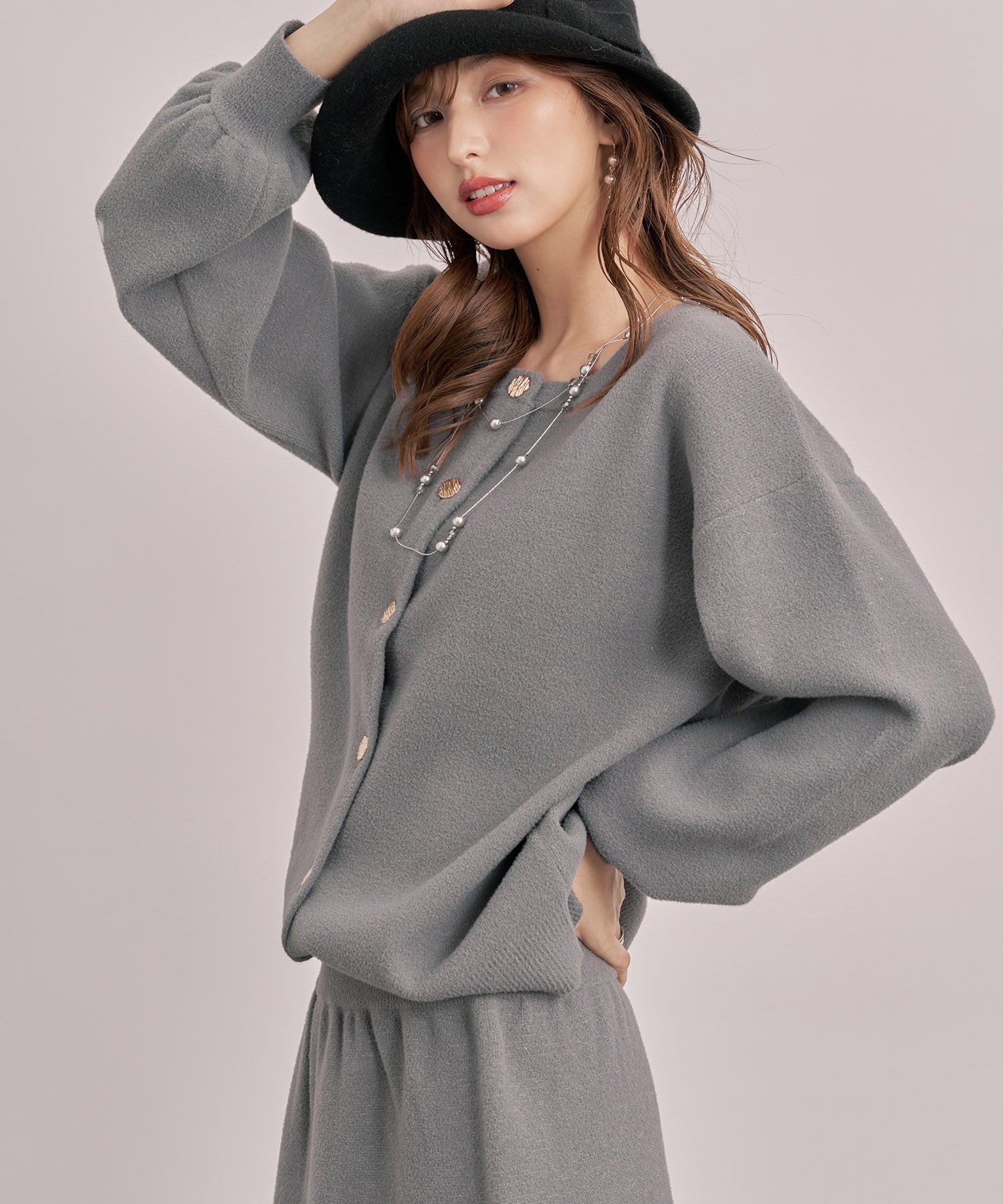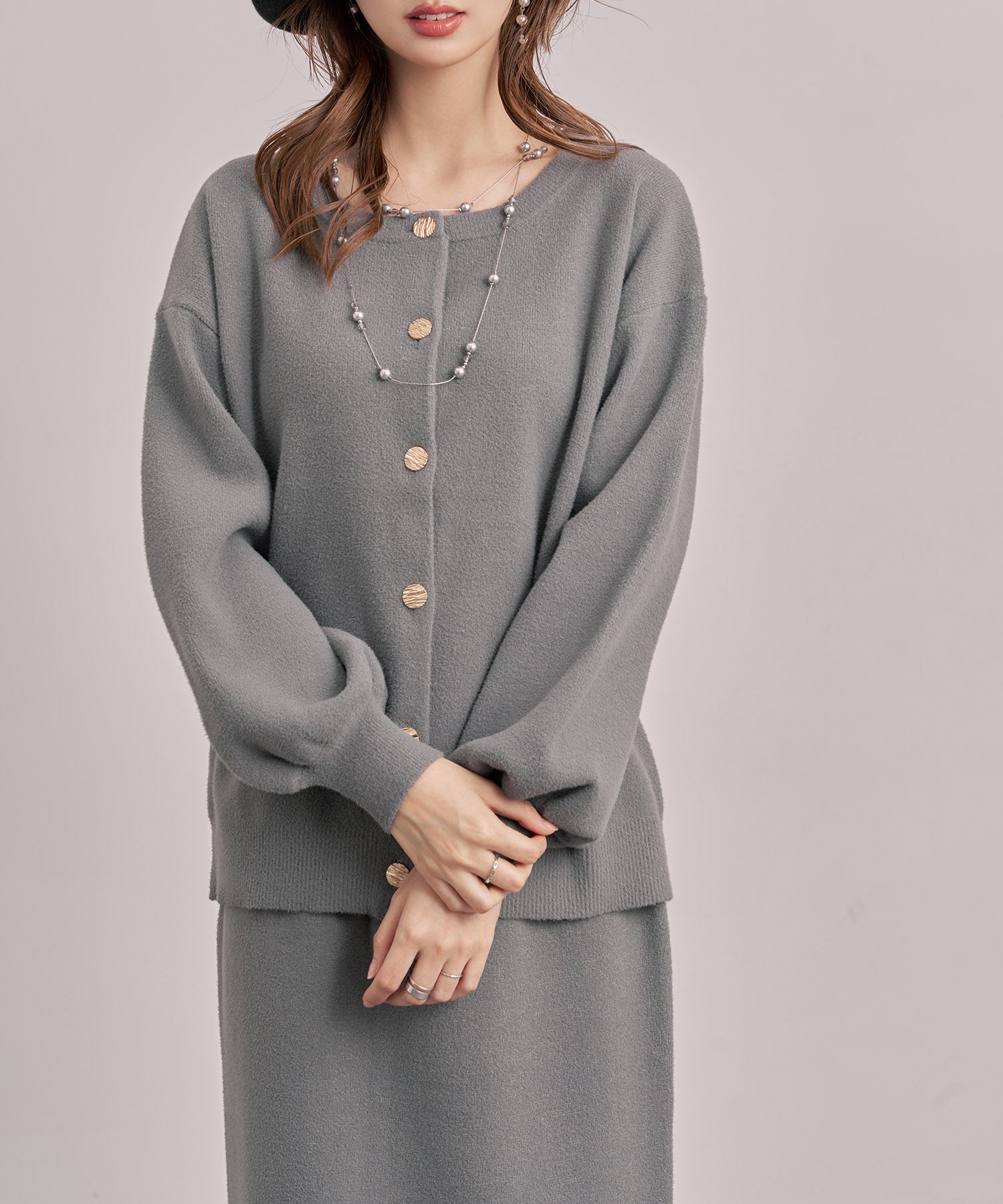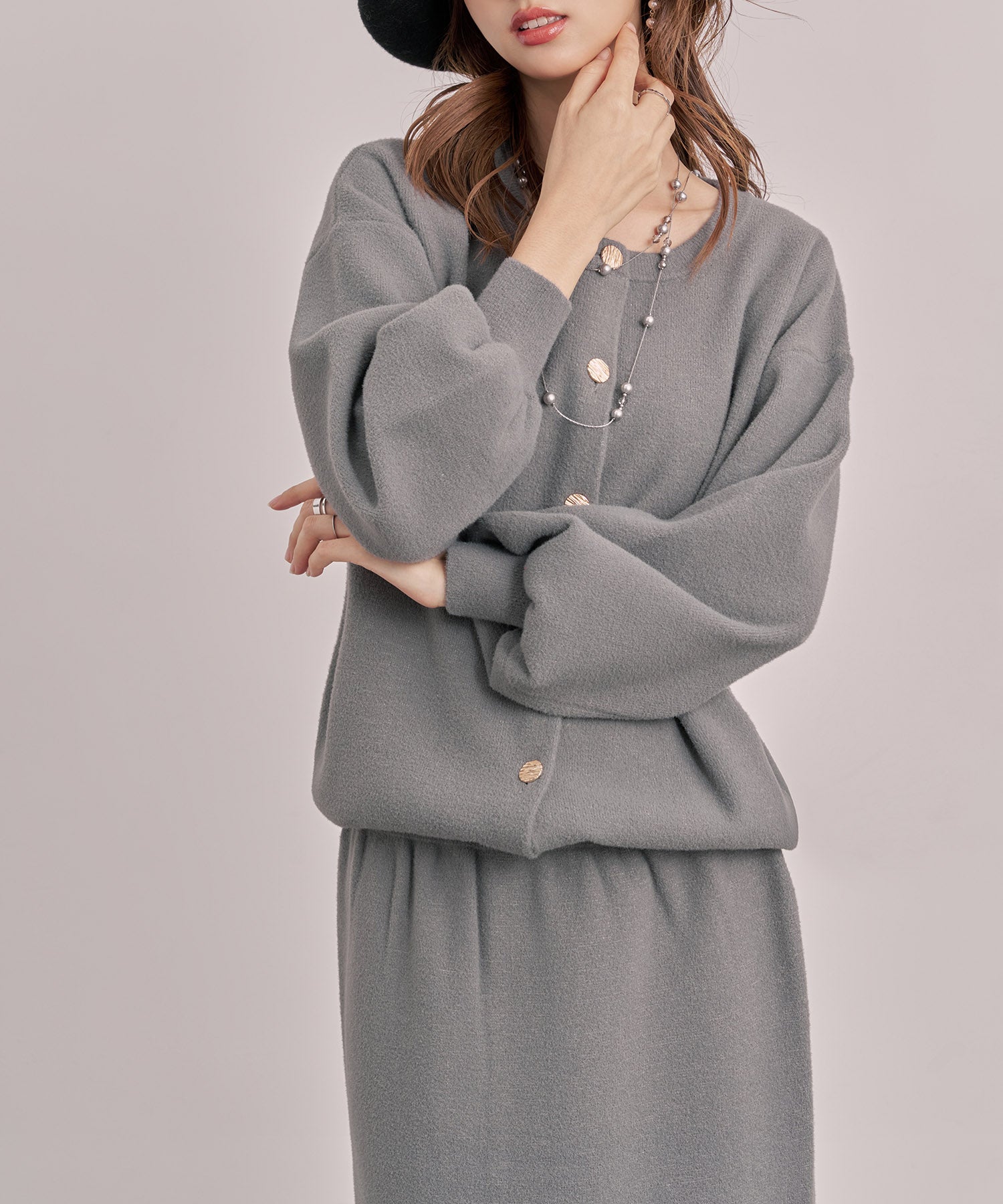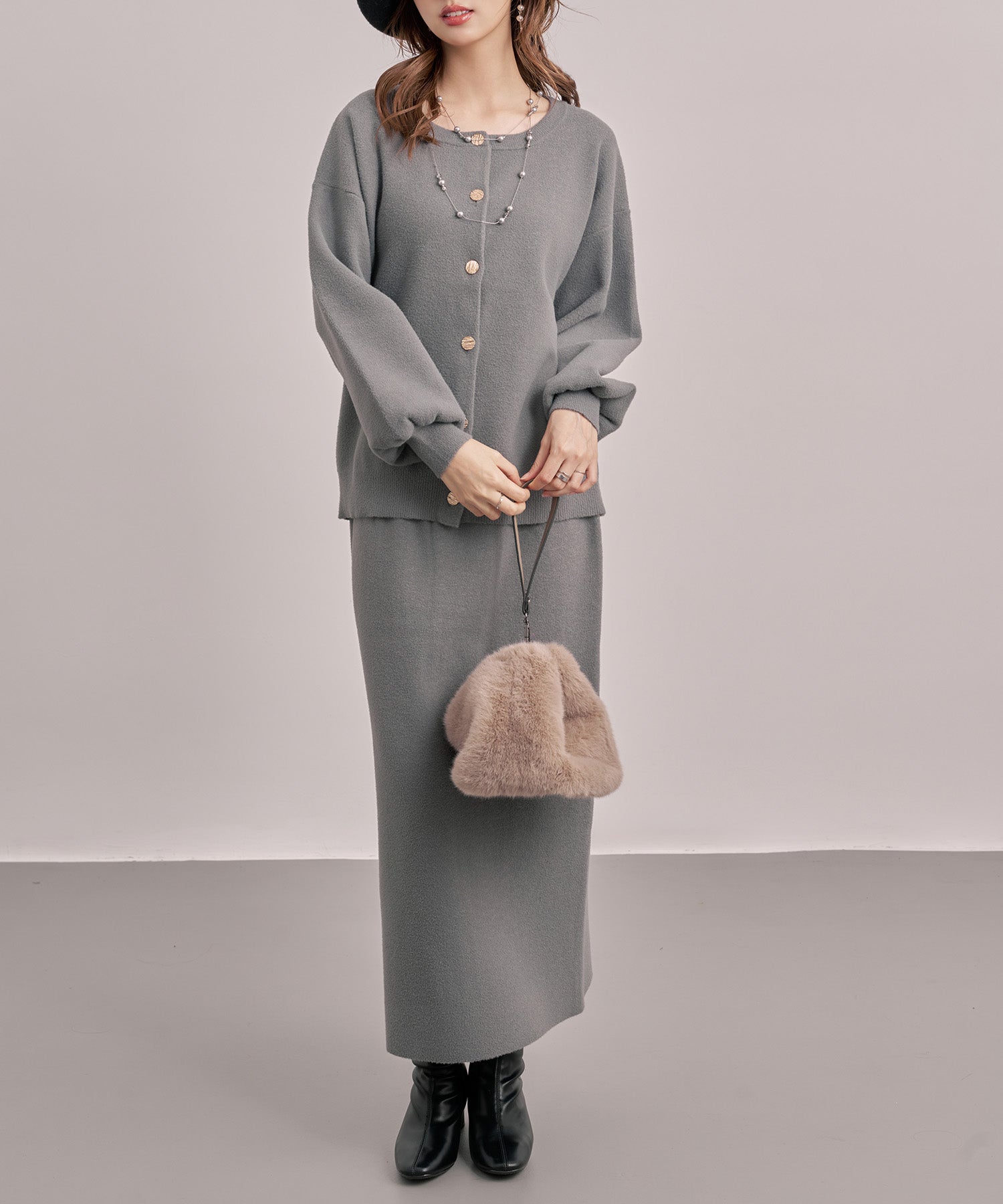 カーディガンとスカートで単品使いができる万能卯セットアップ。どちらもシンプルニットなので手持ちのアイテムと着回し抜群です。