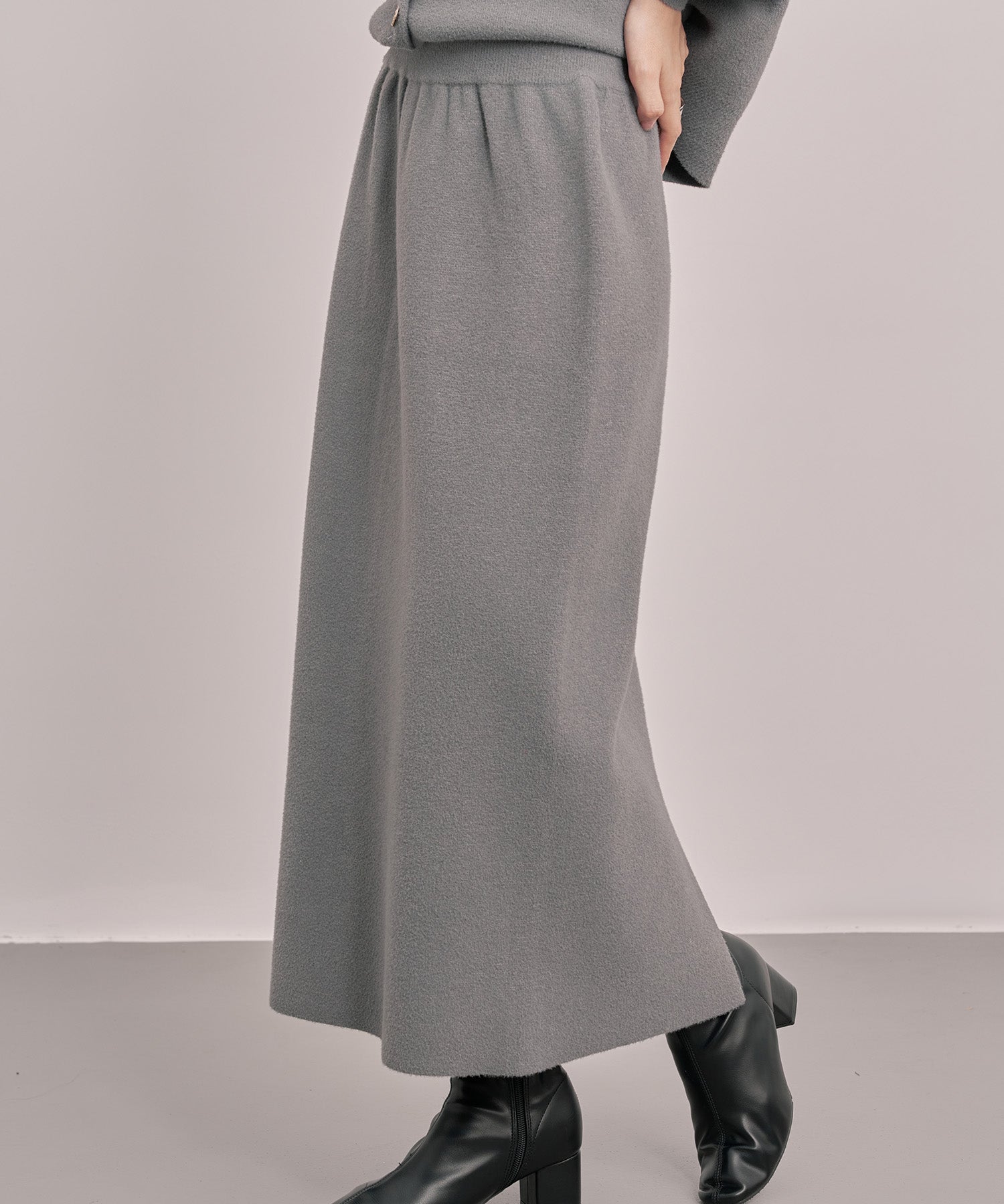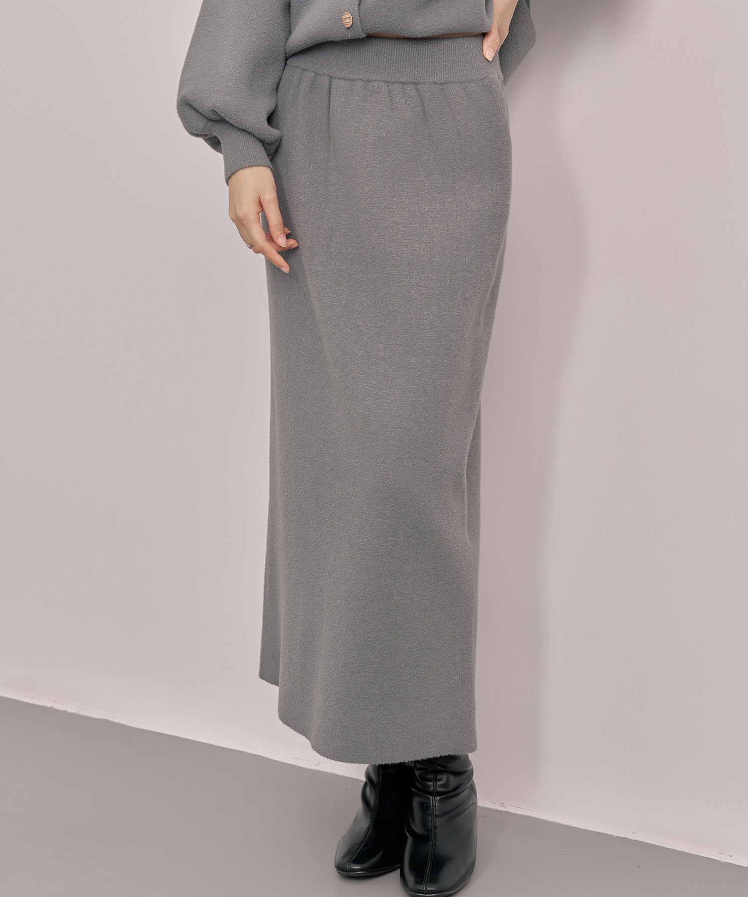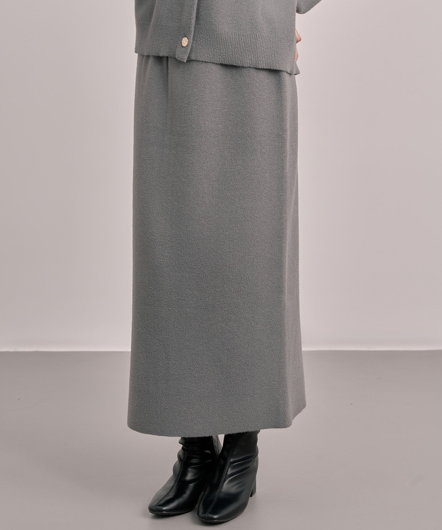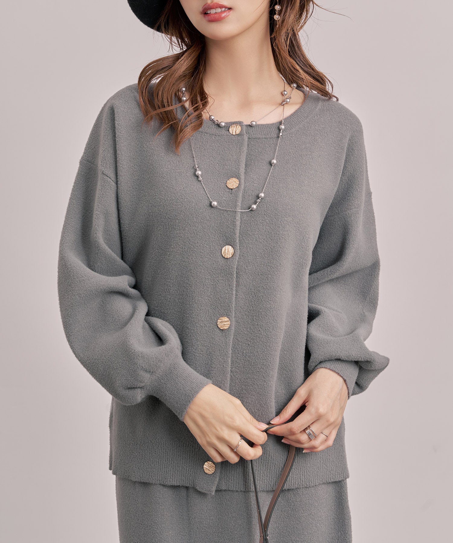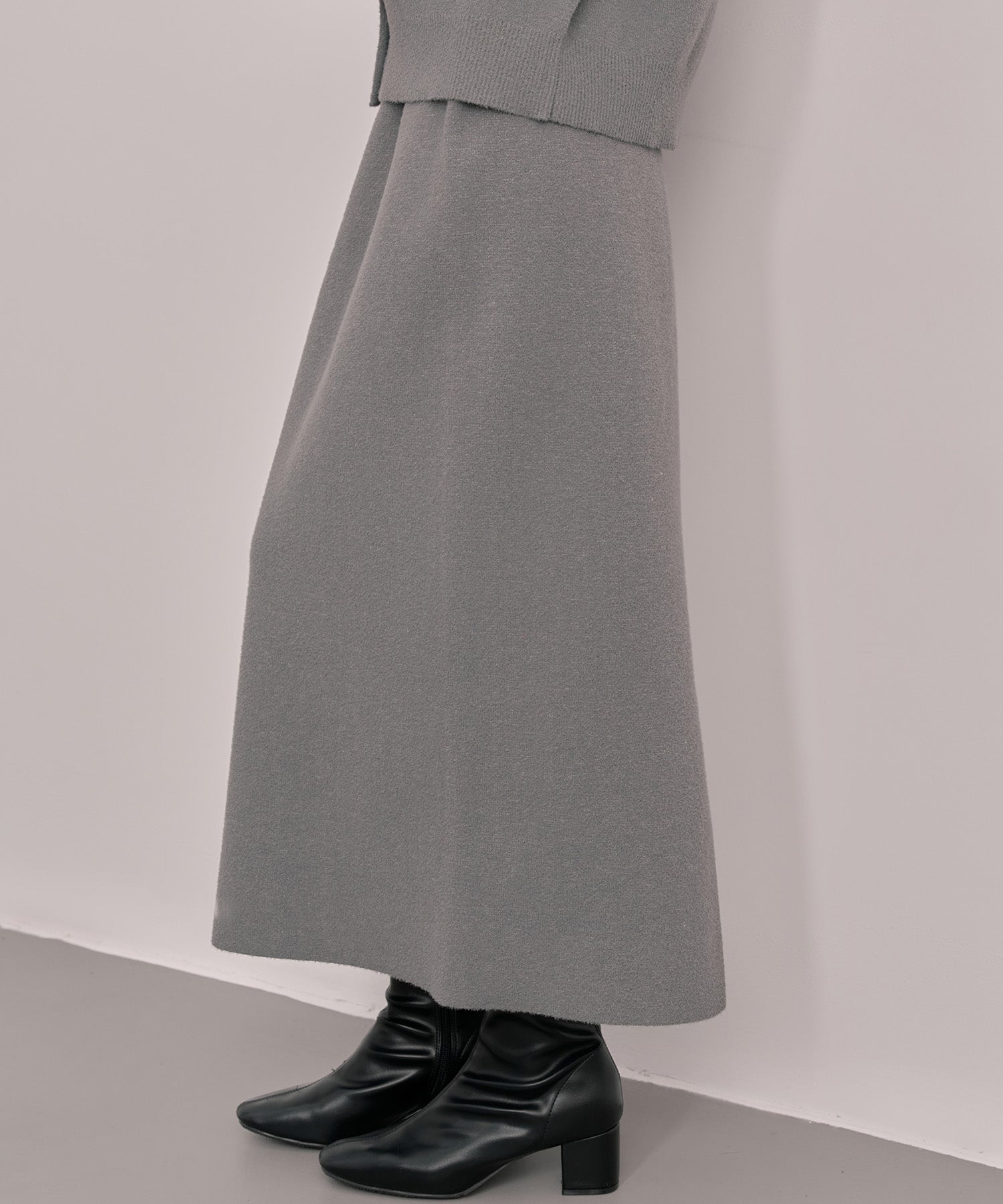 カーディガンとスカートで単品使いができる万能卯セットアップ。どちらもシンプルニットなので手持ちのアイテムと着回し抜群です。