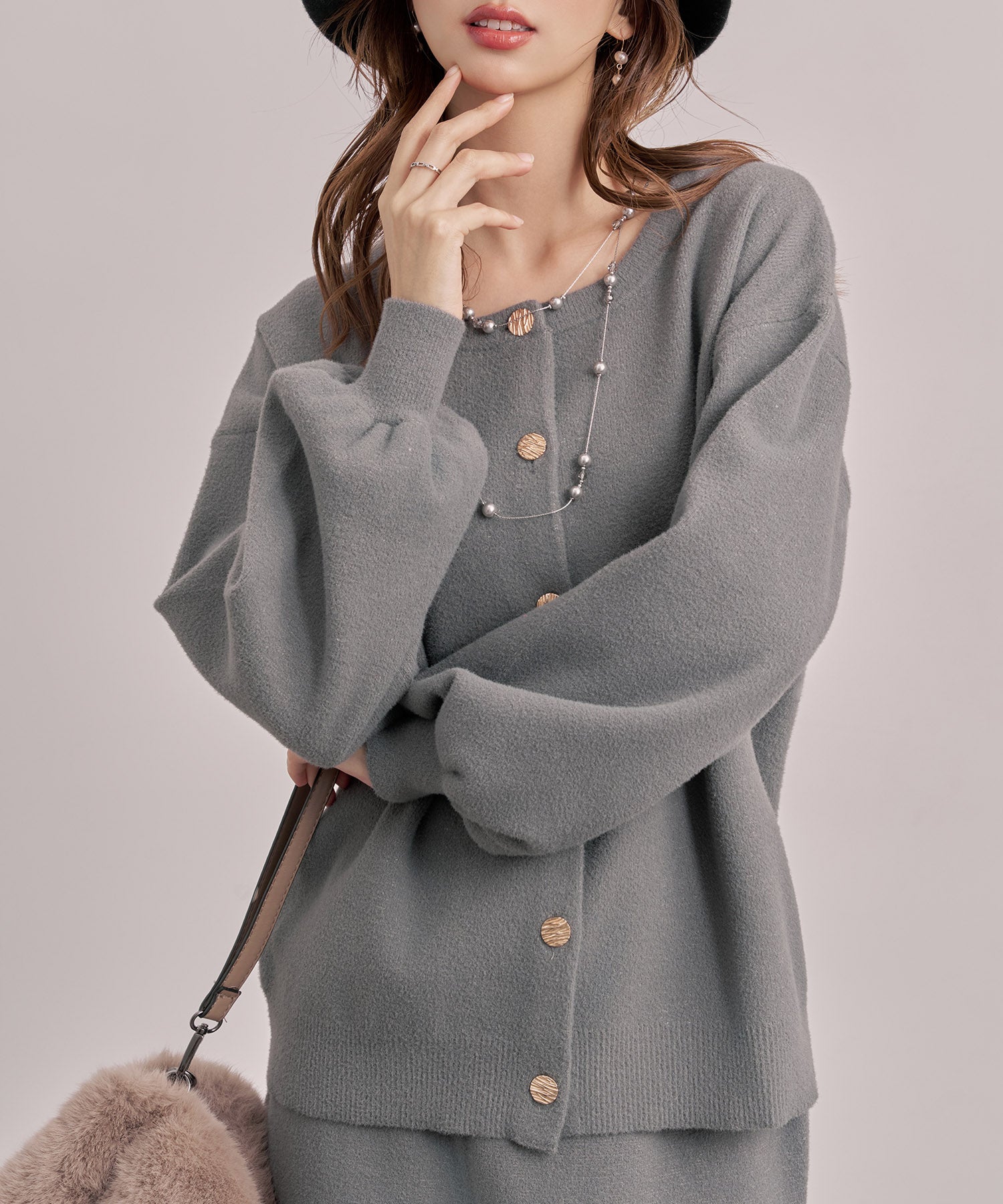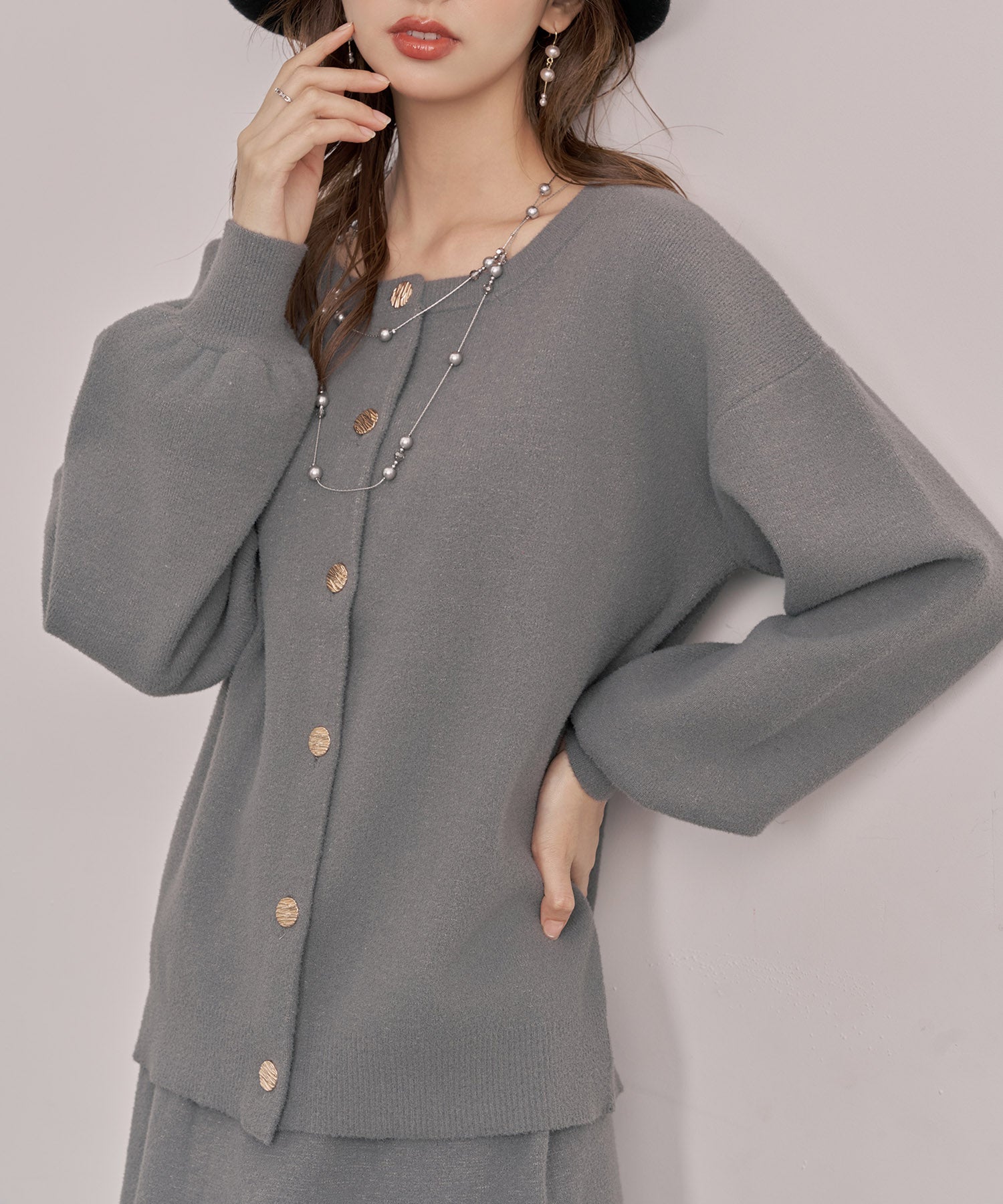 カーディガンには金ボタンが施されています。ニットオンリーな着こなしにもエレガントさが光ります。