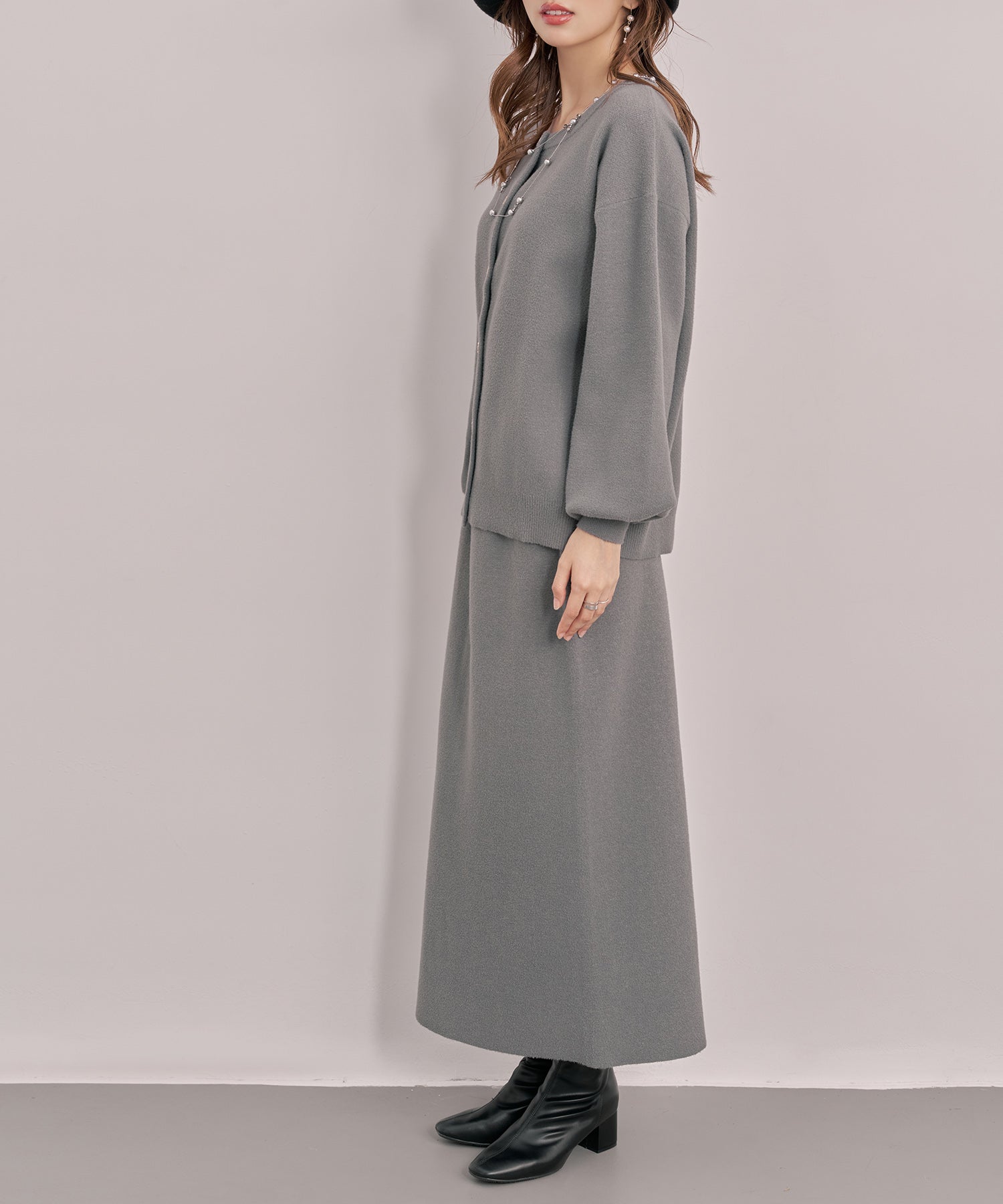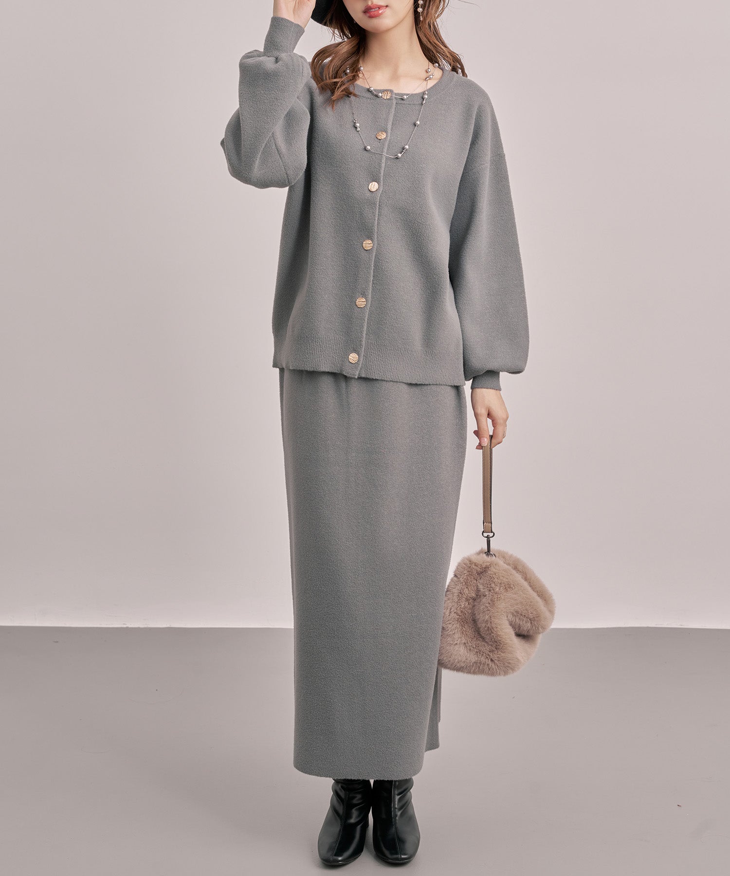 きれいめシルエットのカーディガン×スカートニットセットアップ。
