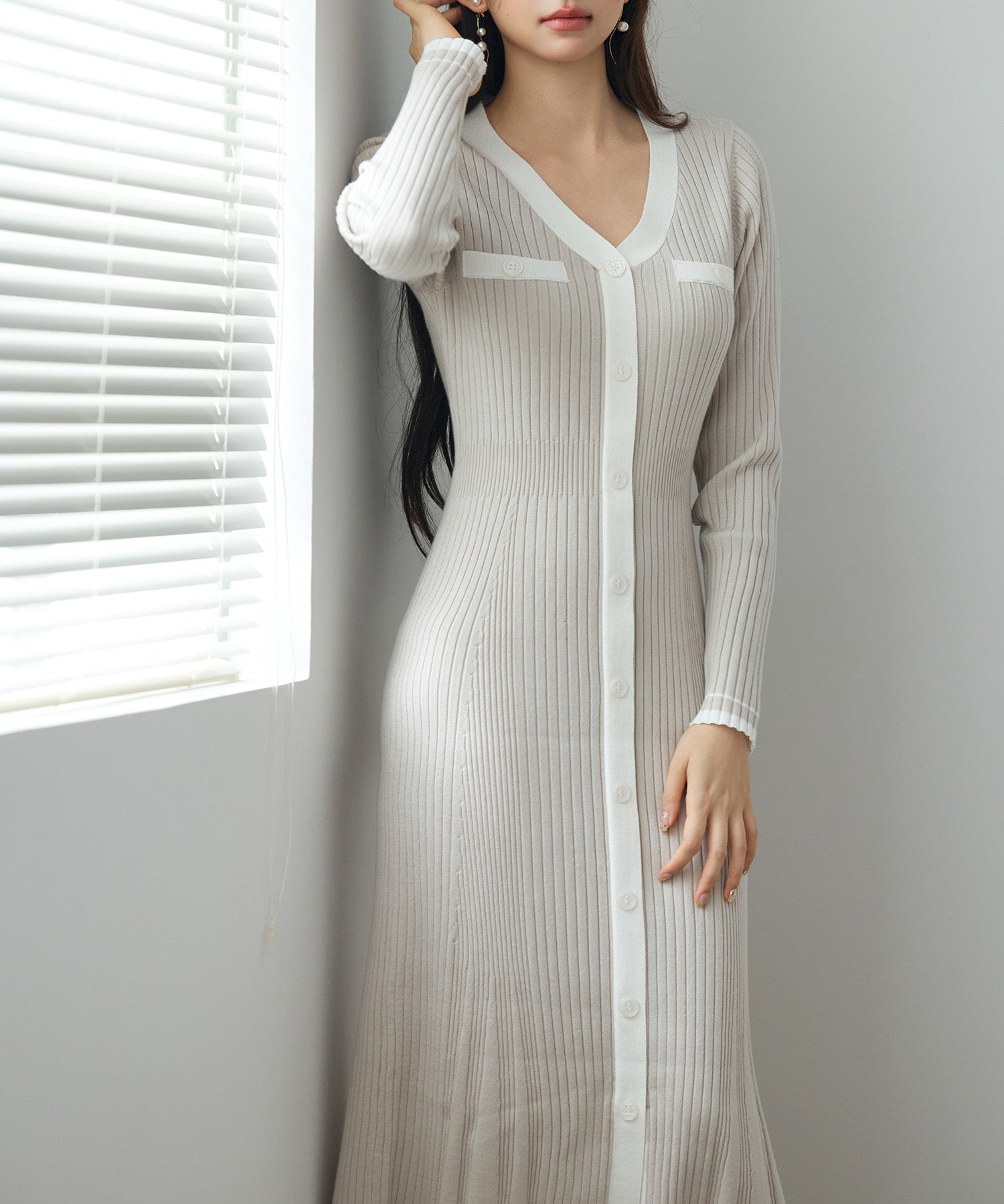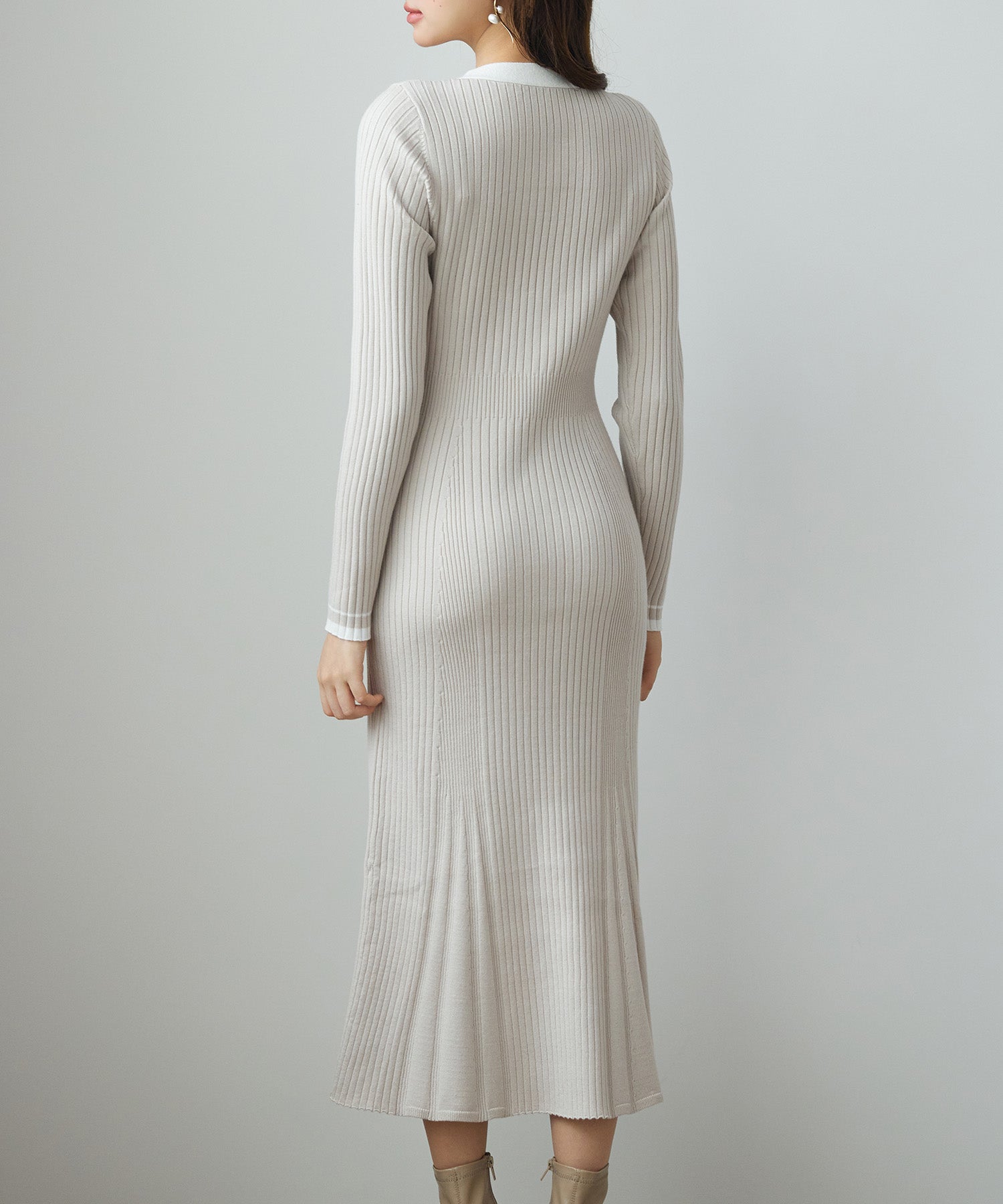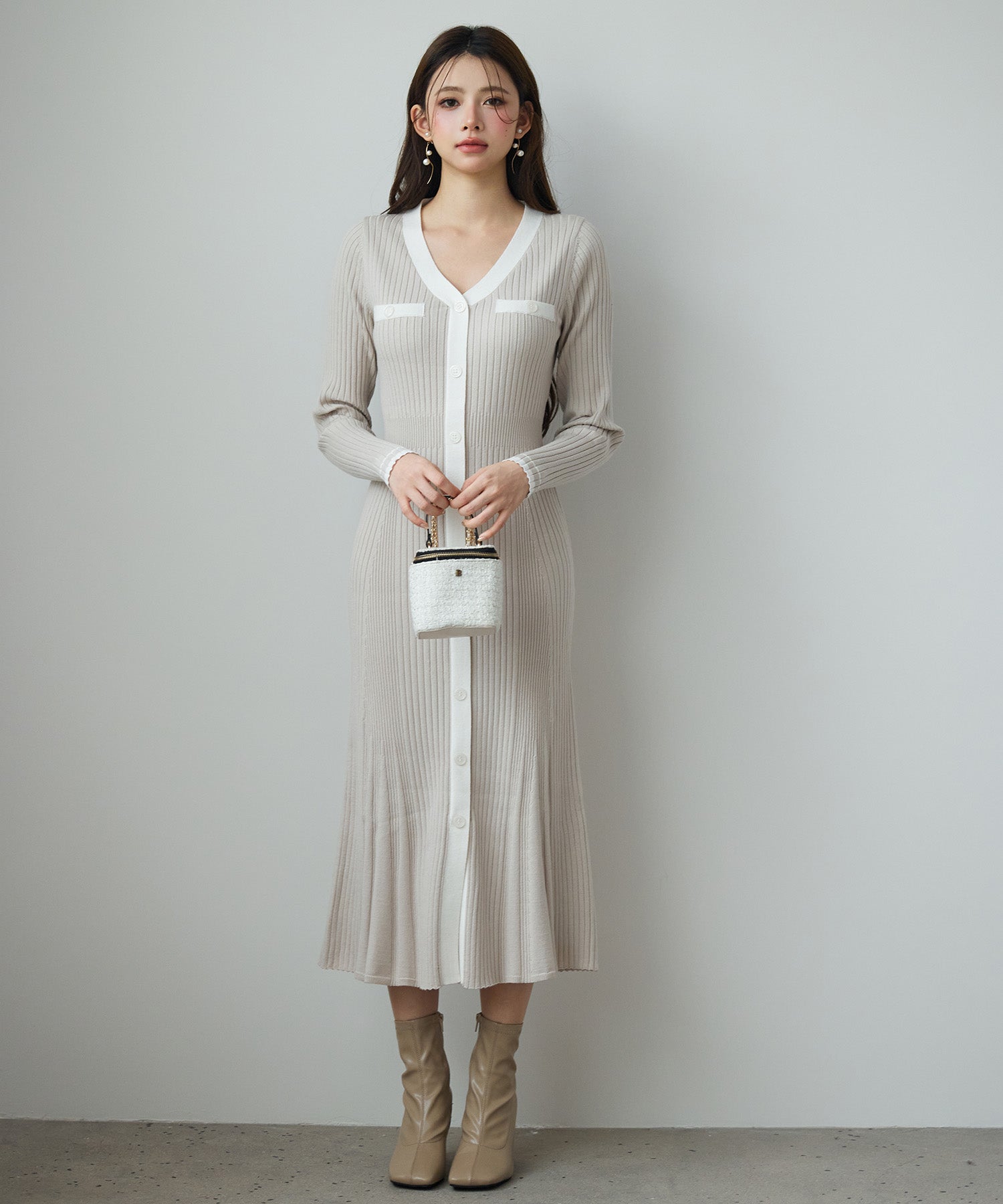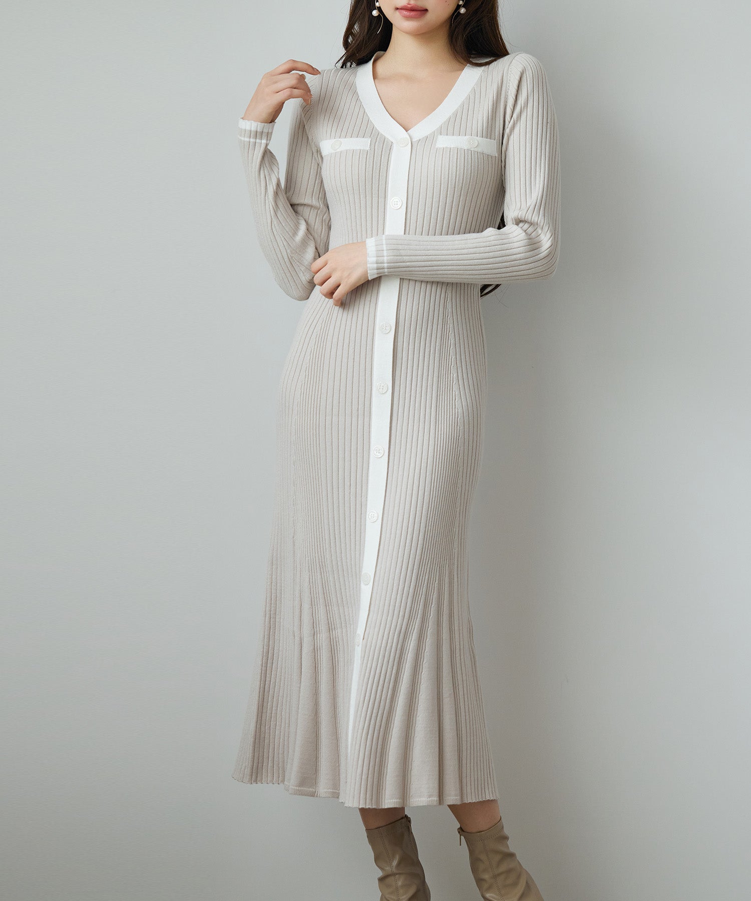 配色リブ編みニットミディ丈ワンピースsdp8116 ベージュ