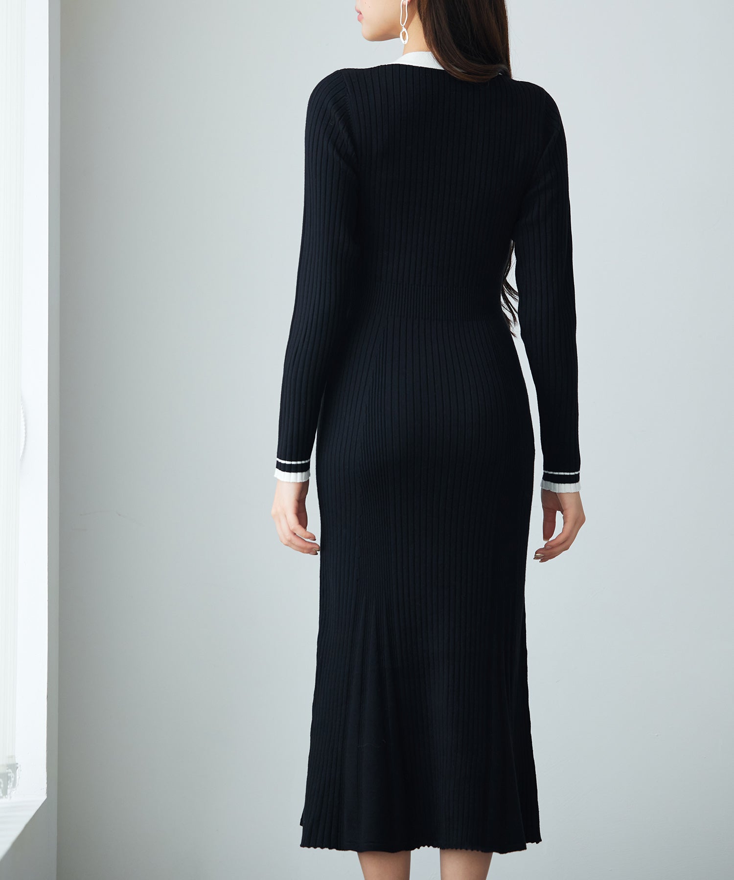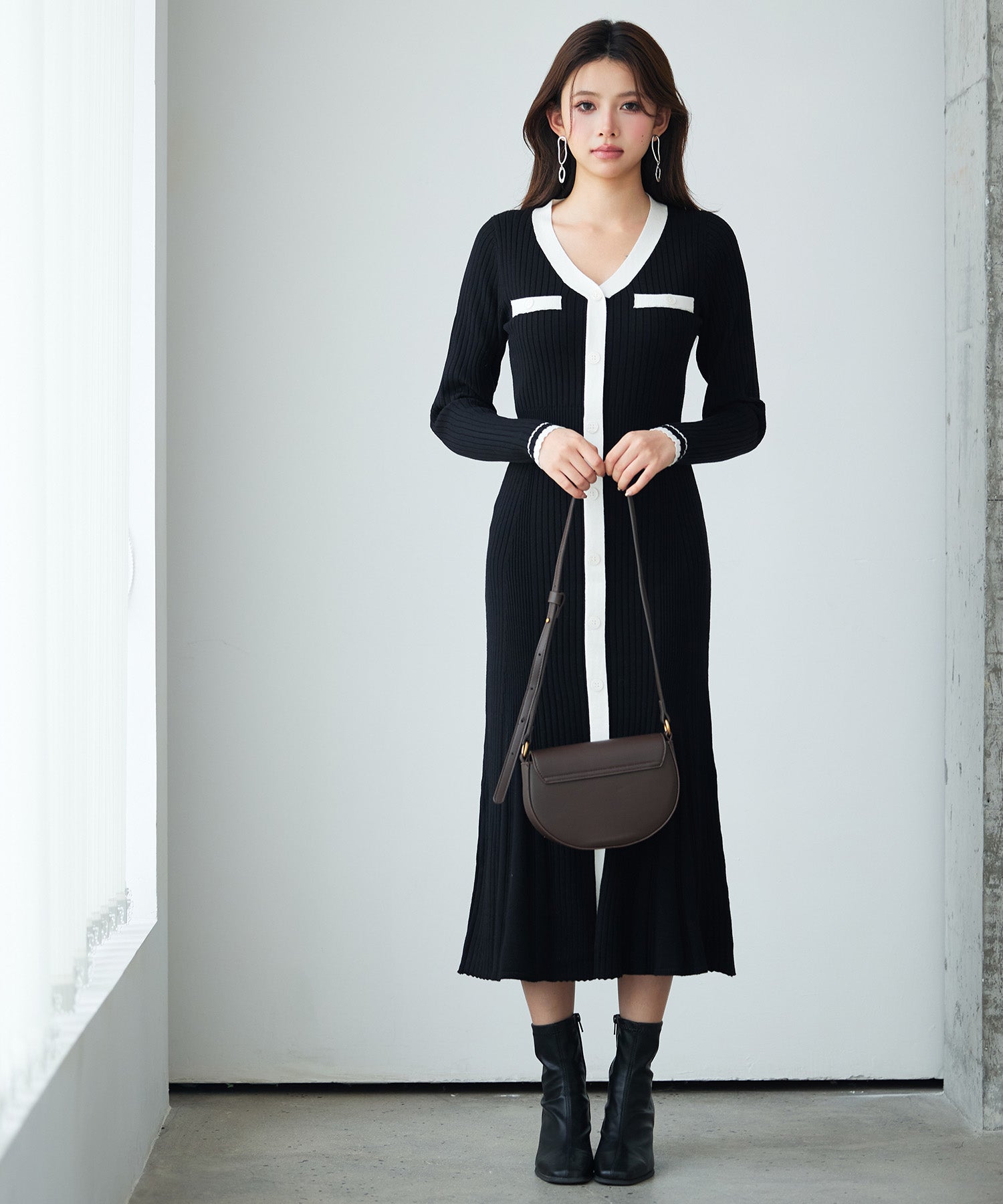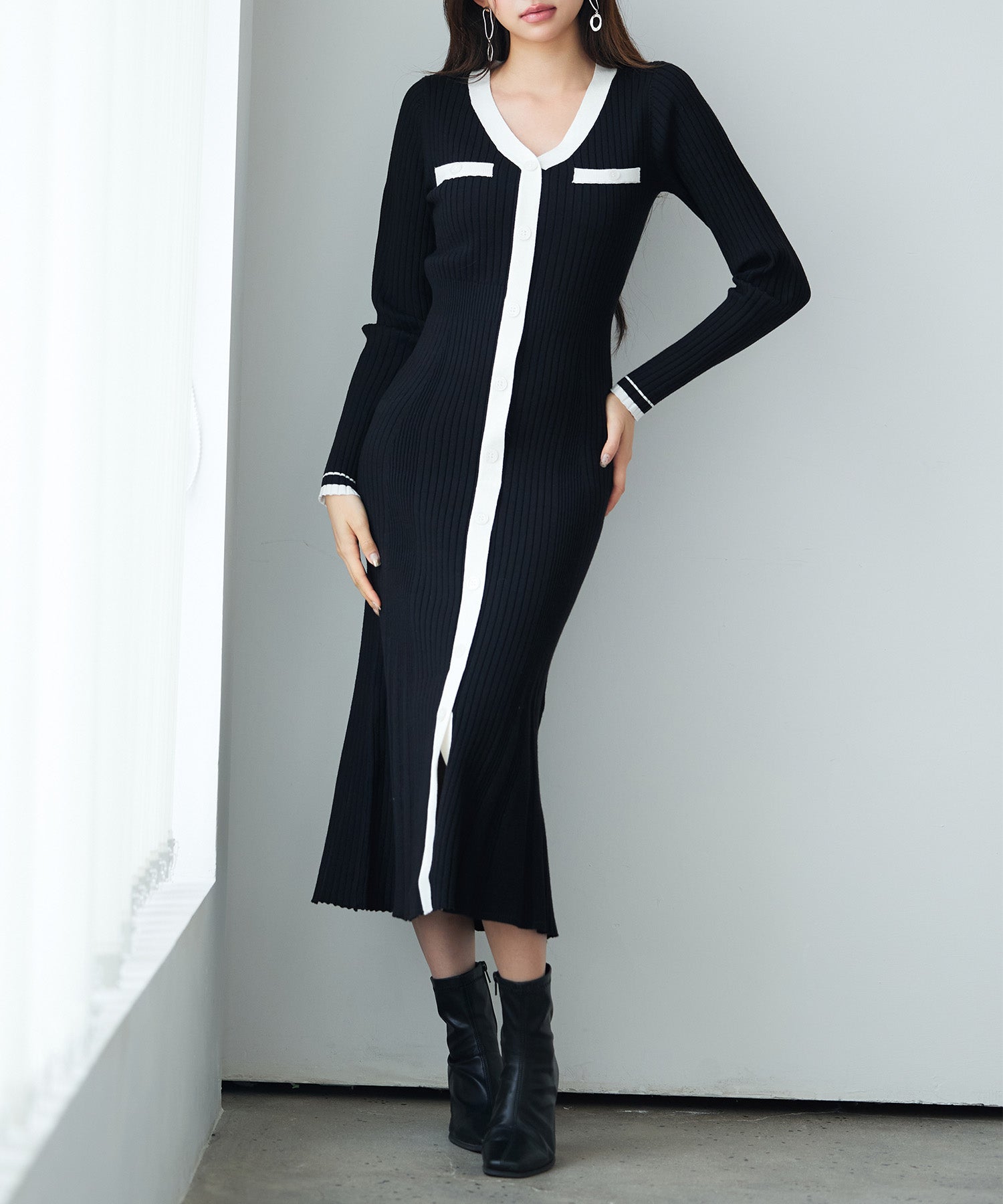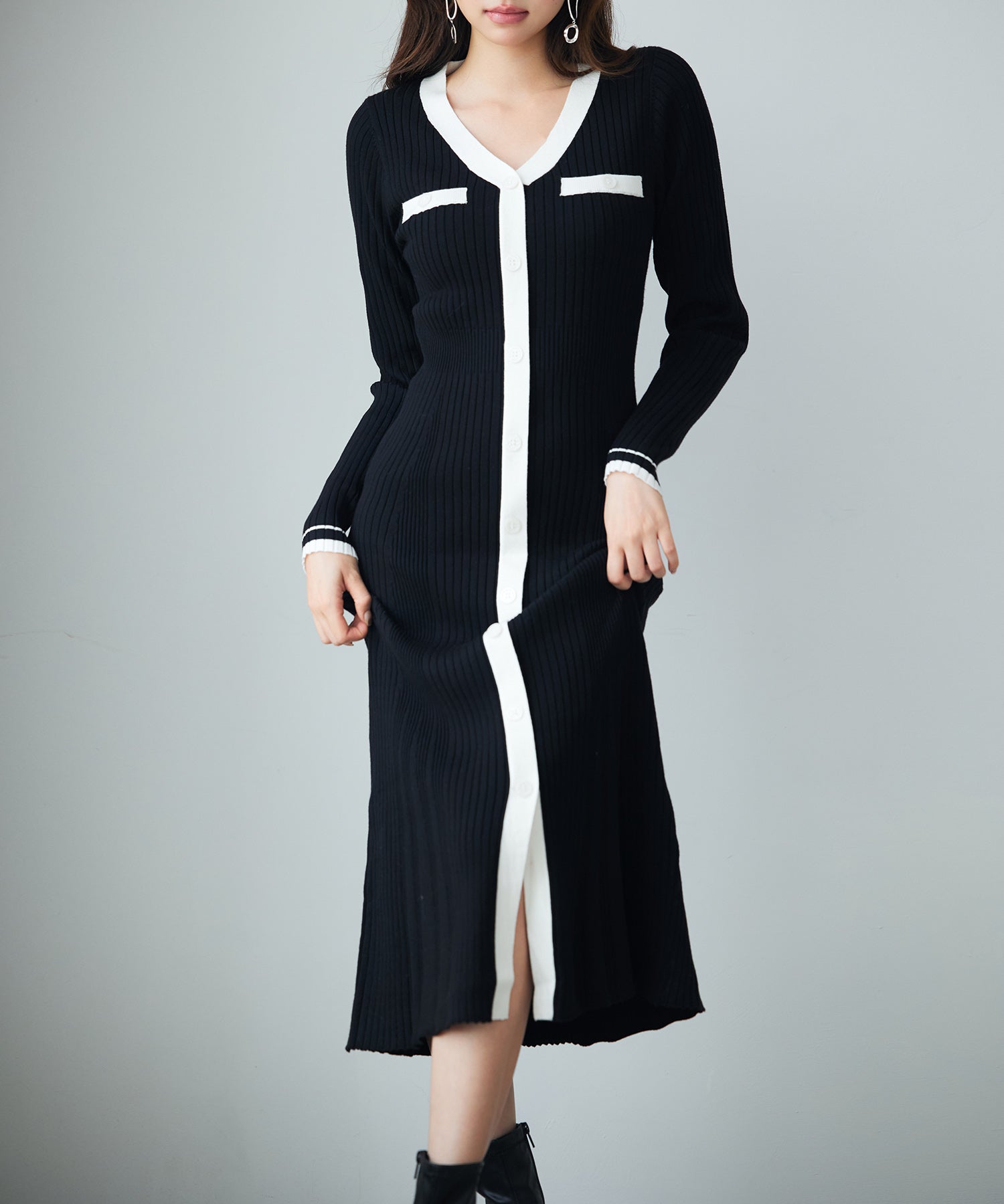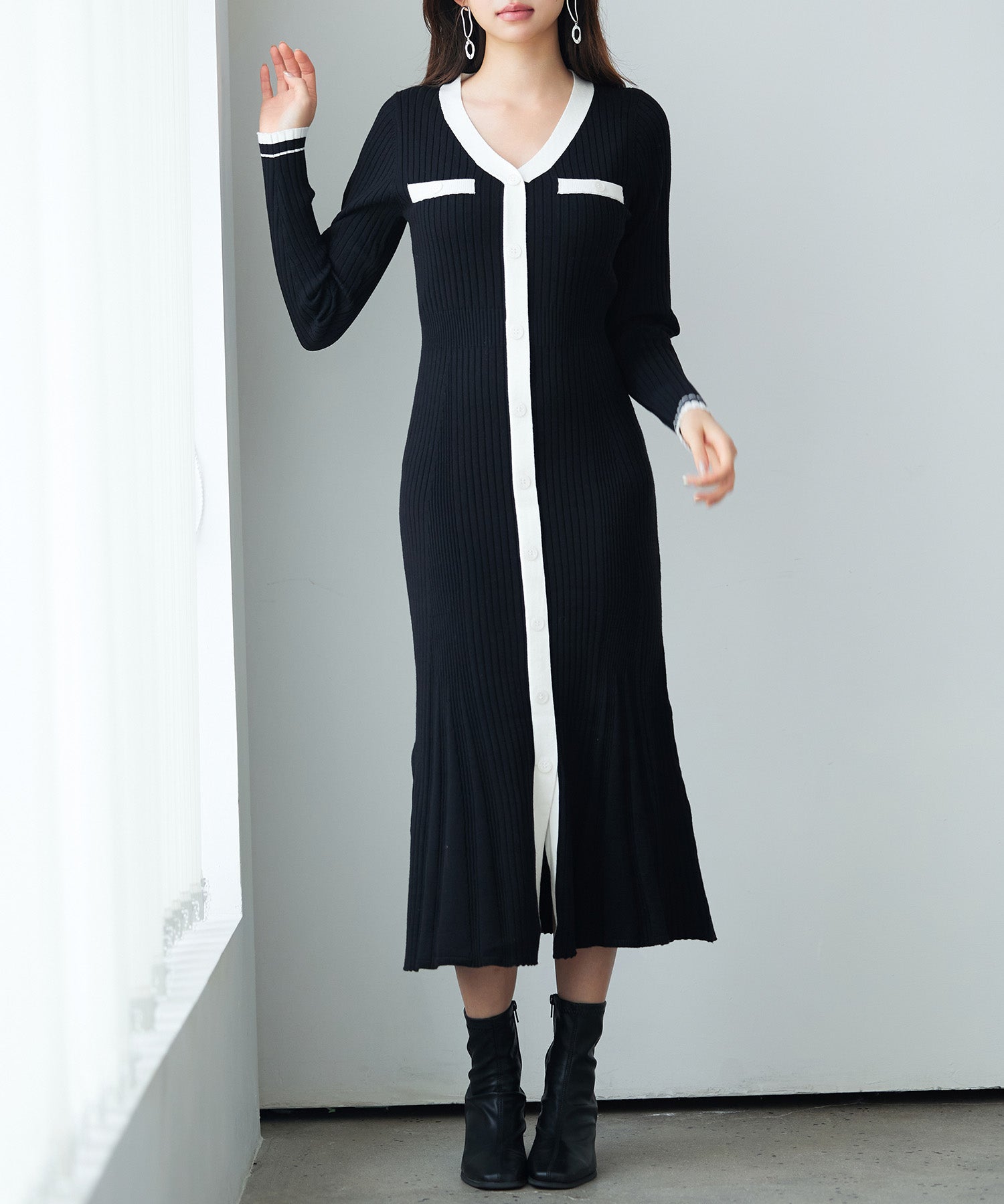 配色リブ編みニットミディ丈ワンピースsdp8116 ブラック