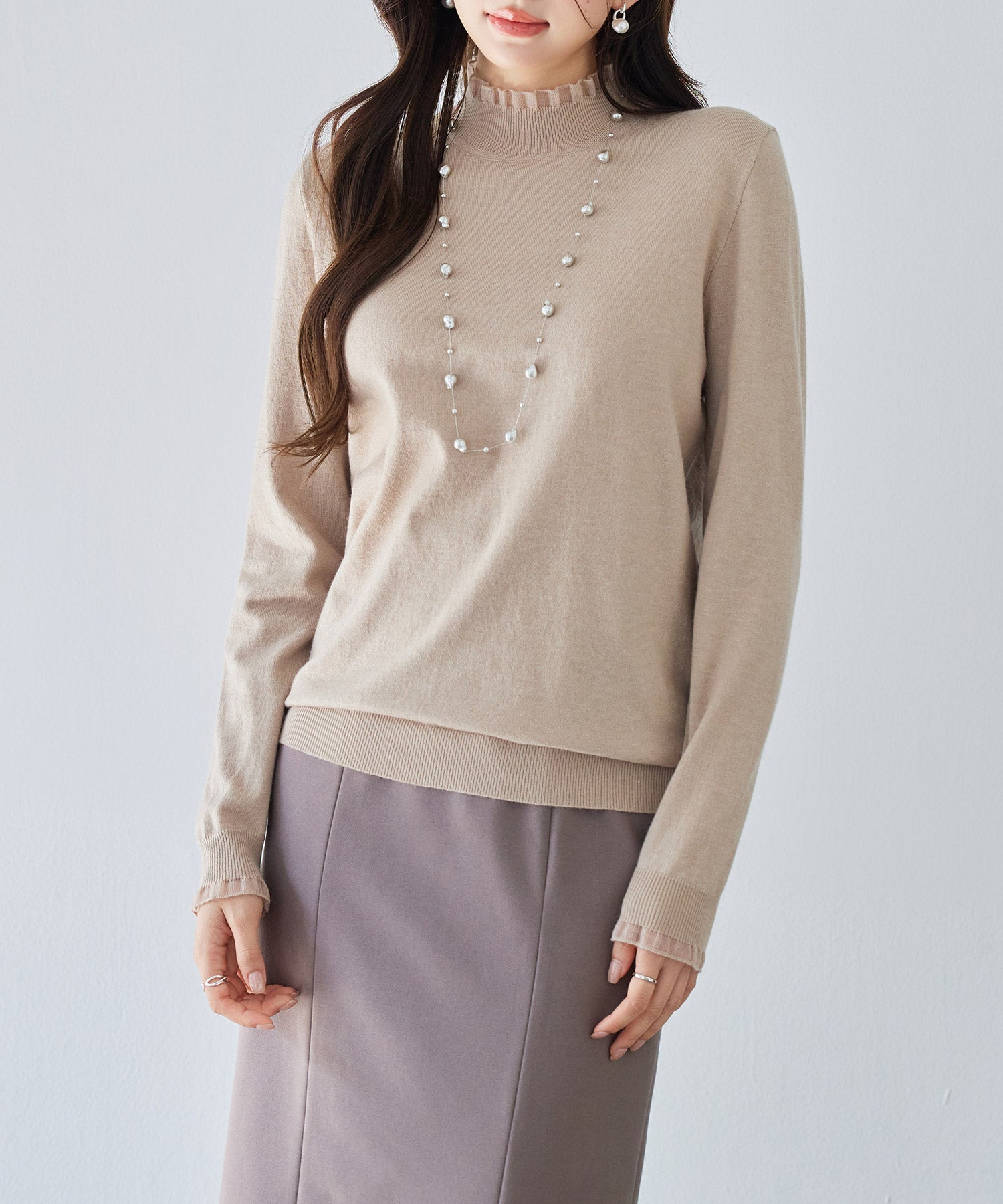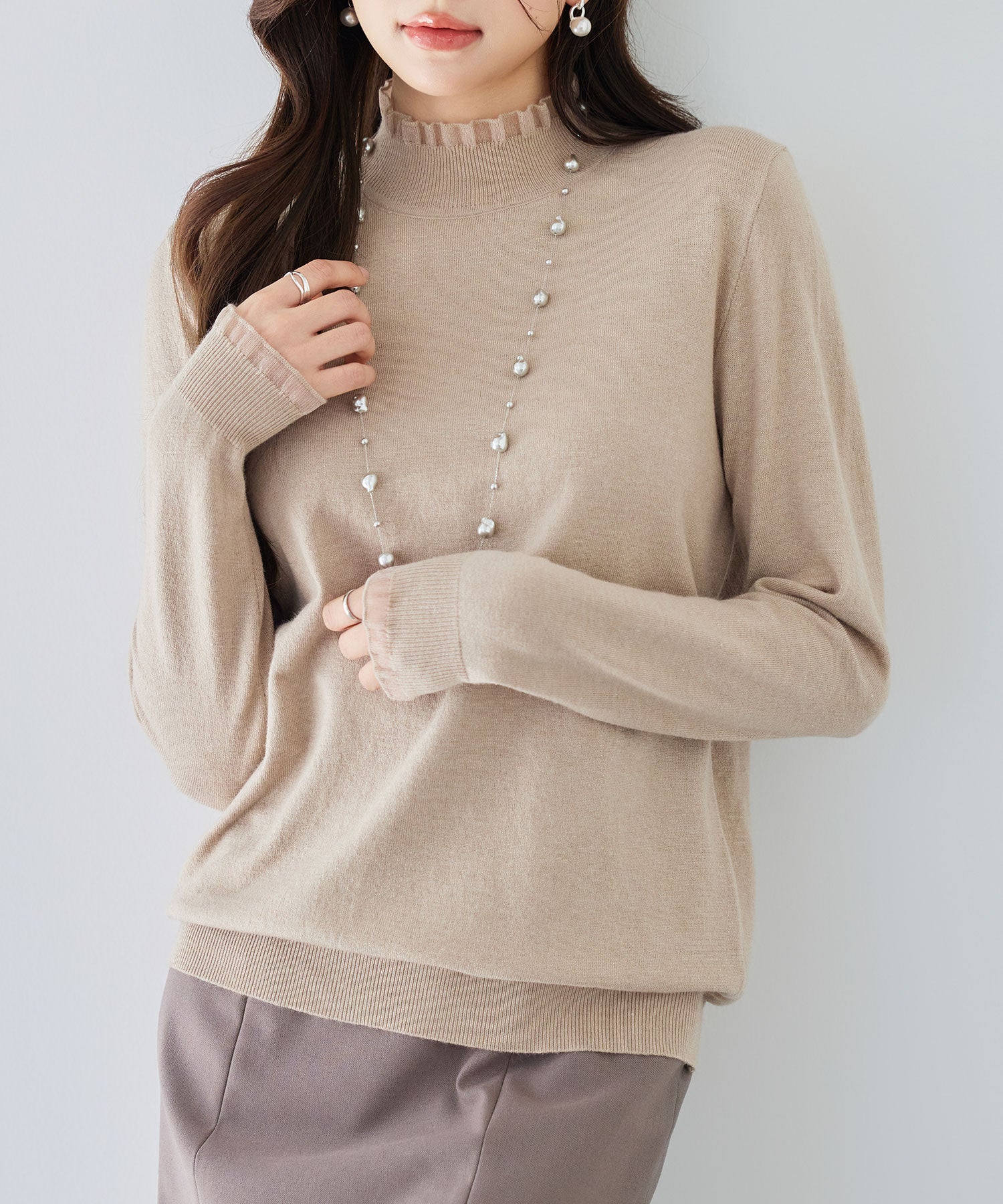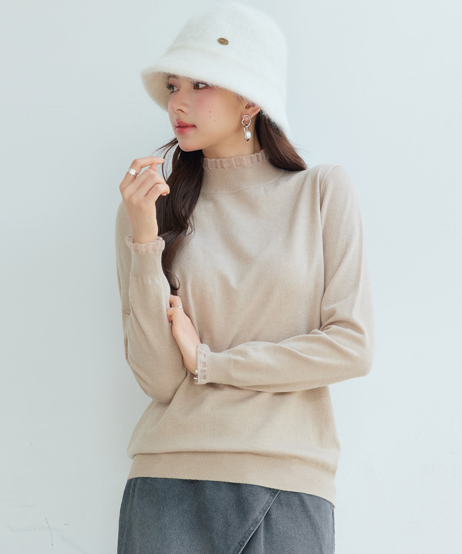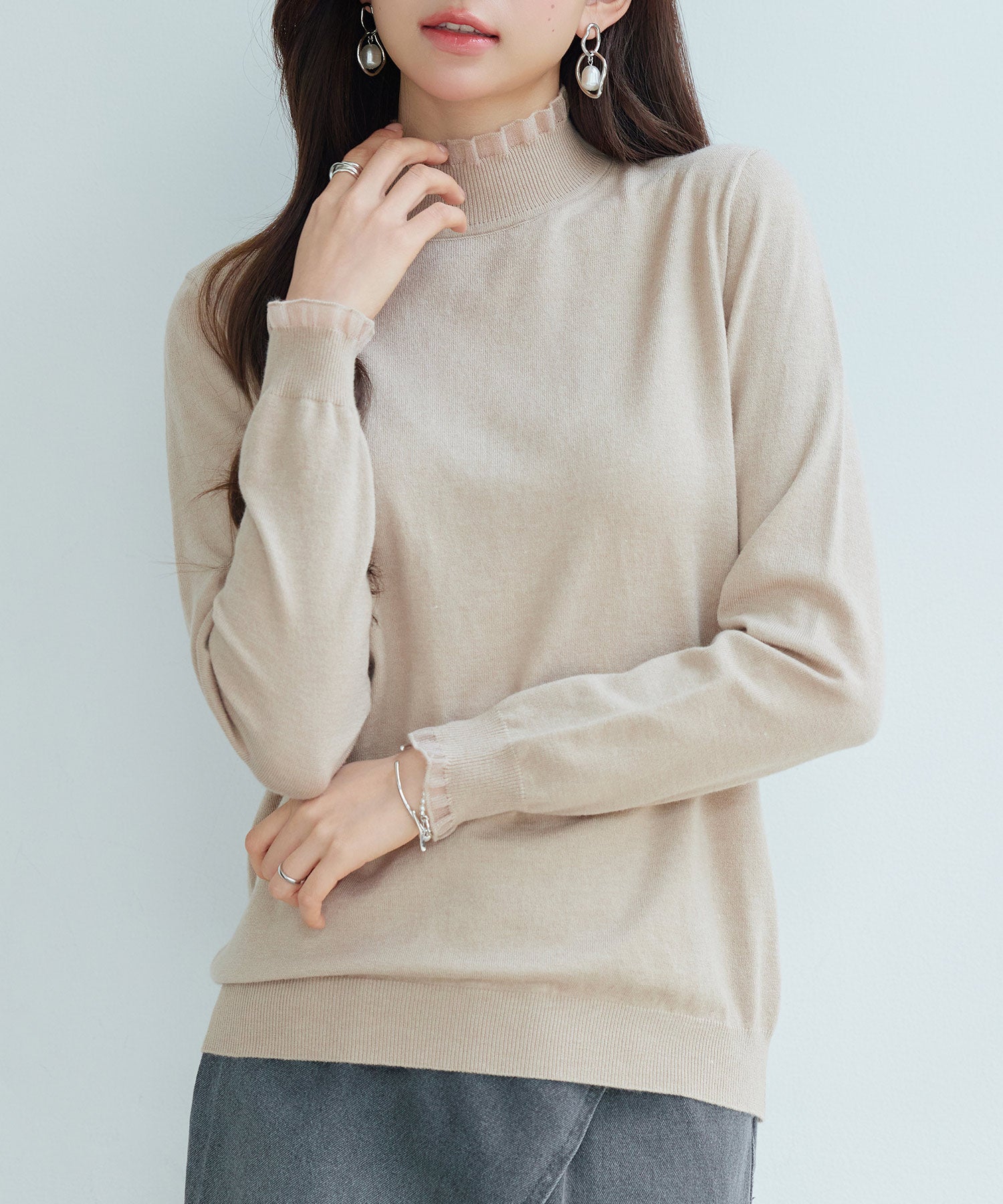 襟口と袖口のシアーフリルをドッキングした一枚でこなれ感を演出するハイネックニット。
