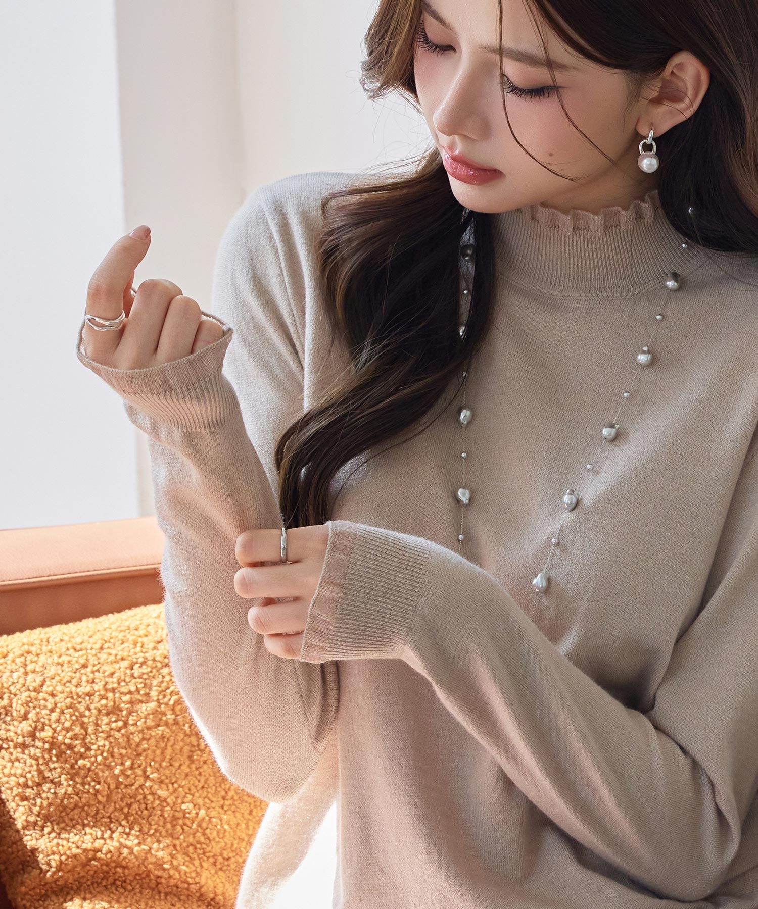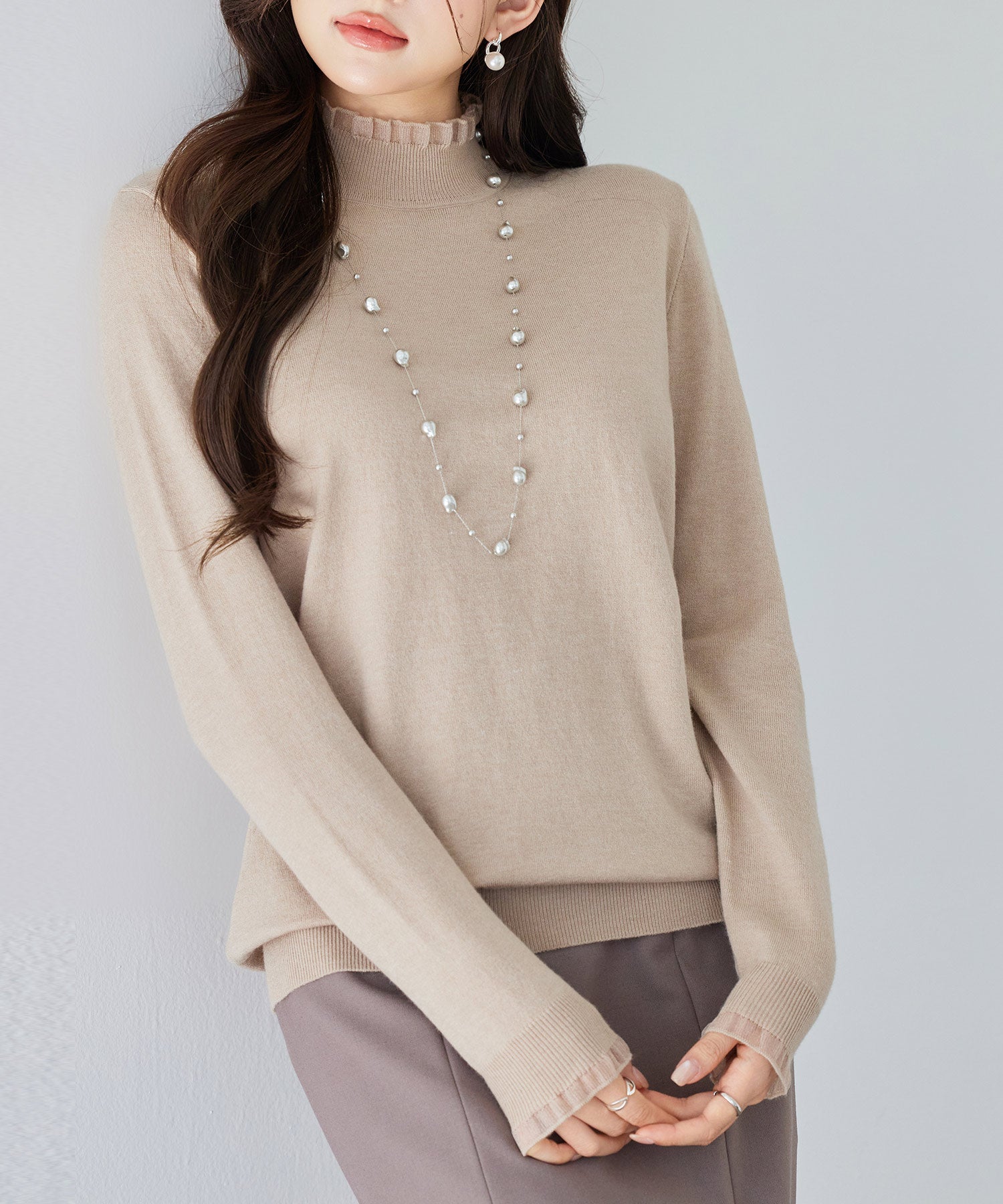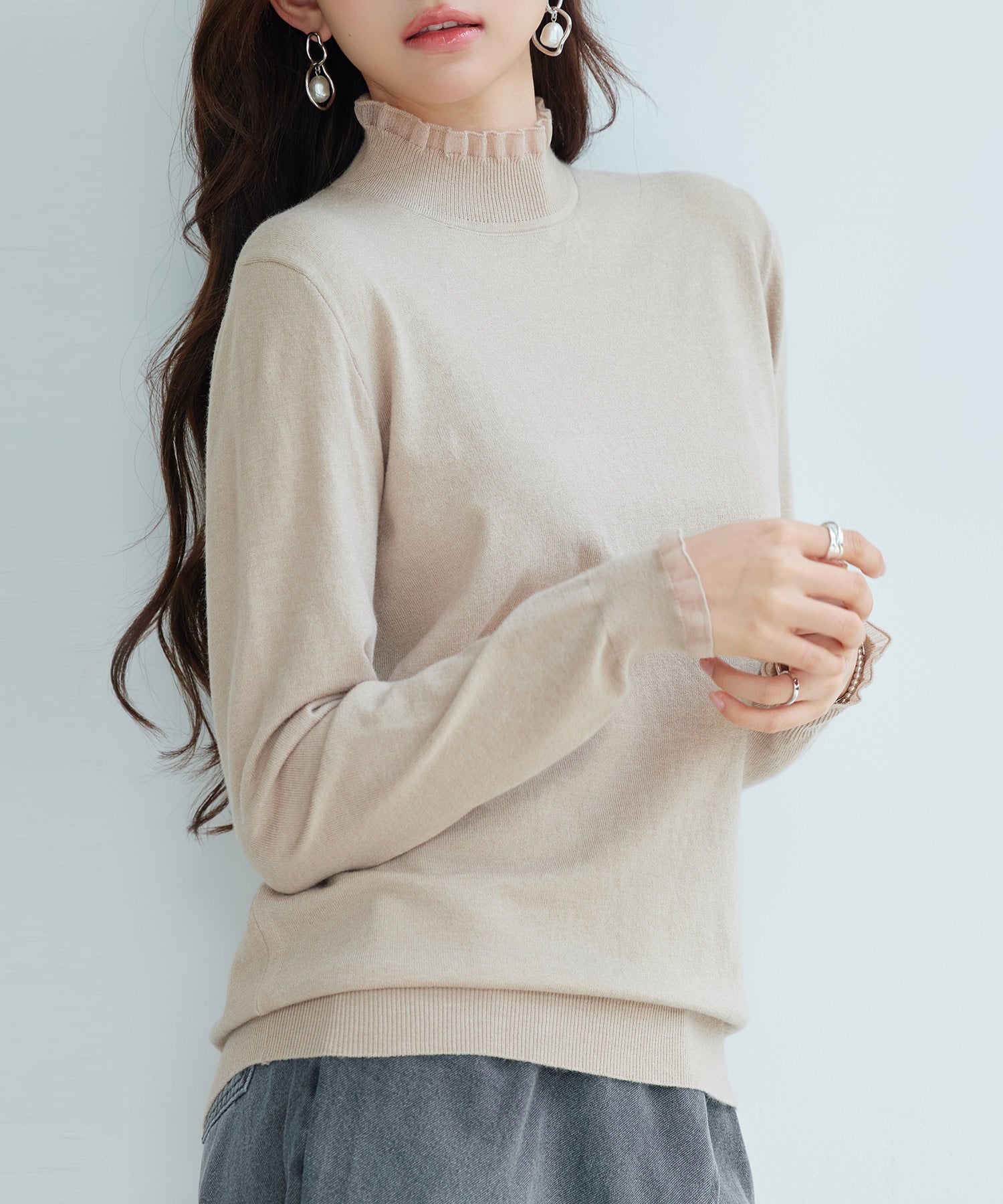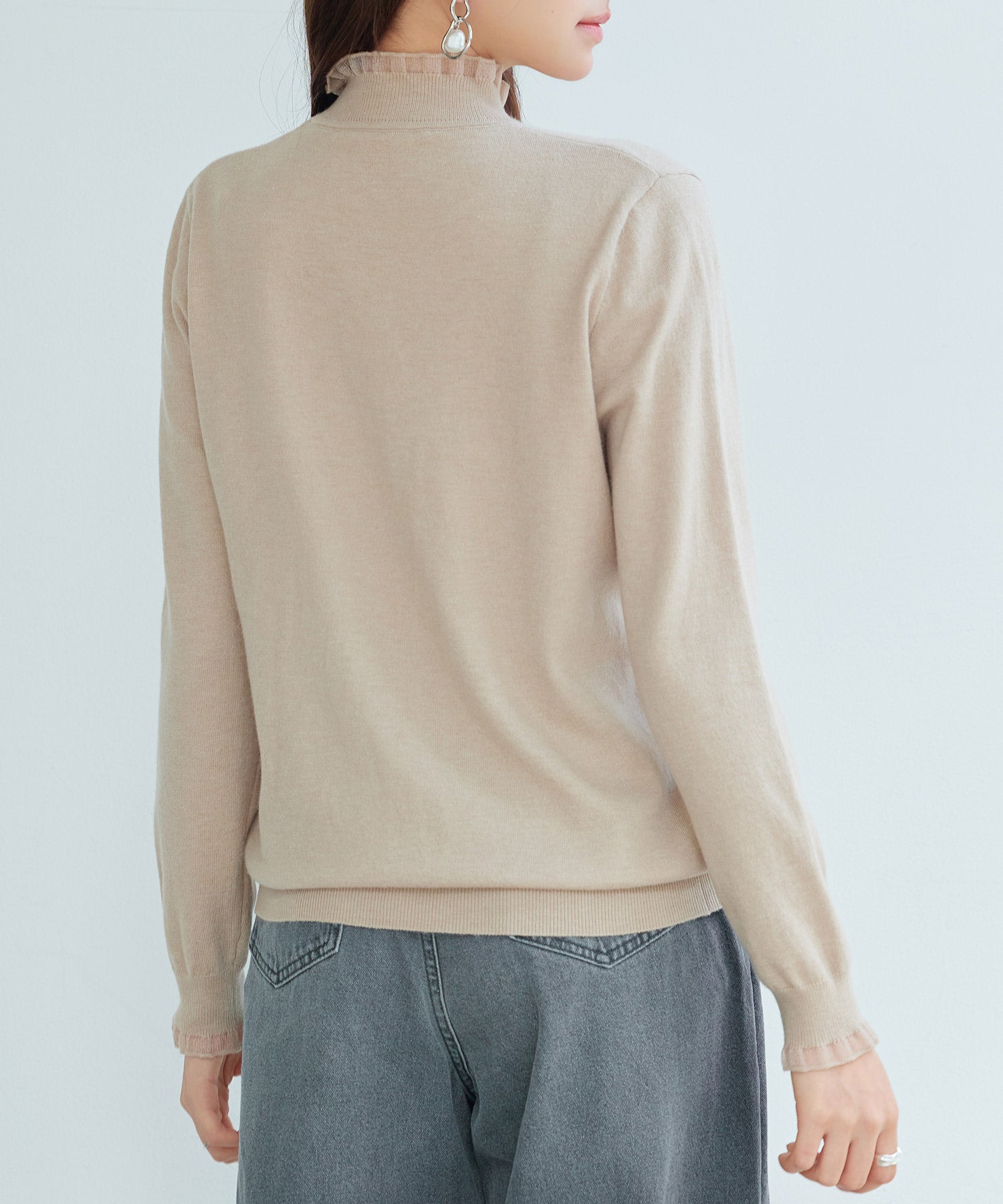 襟口と袖口のシアーフリルをドッキングした一枚でこなれ感を演出するハイネックニット。