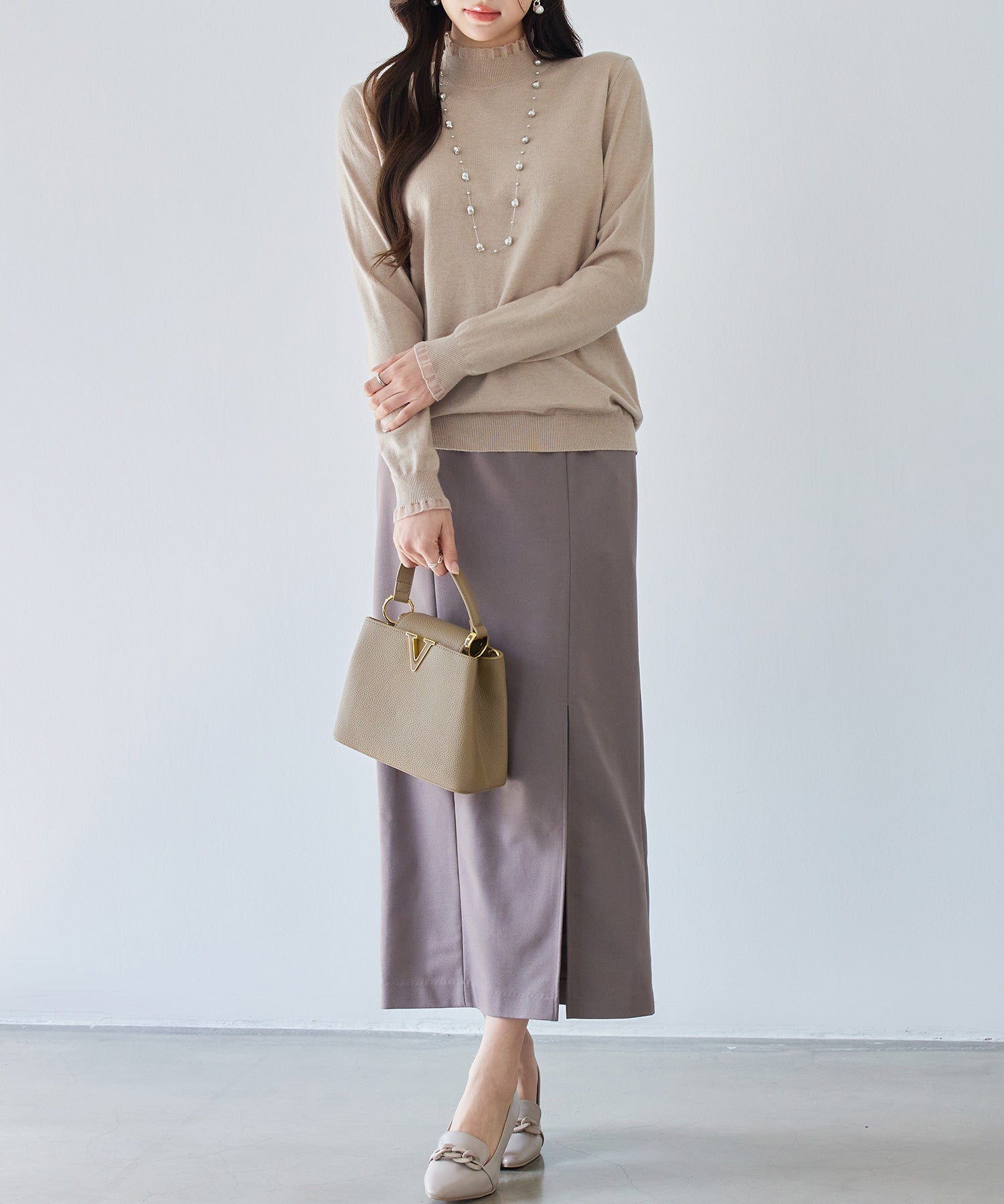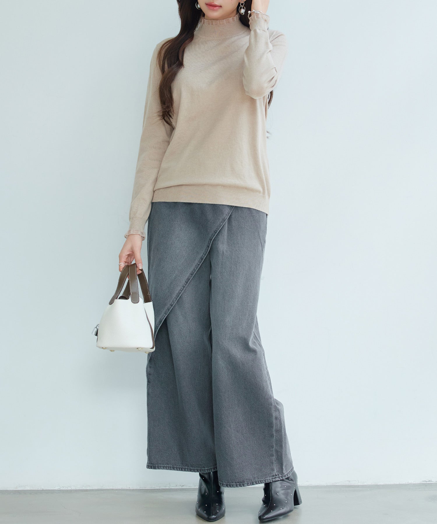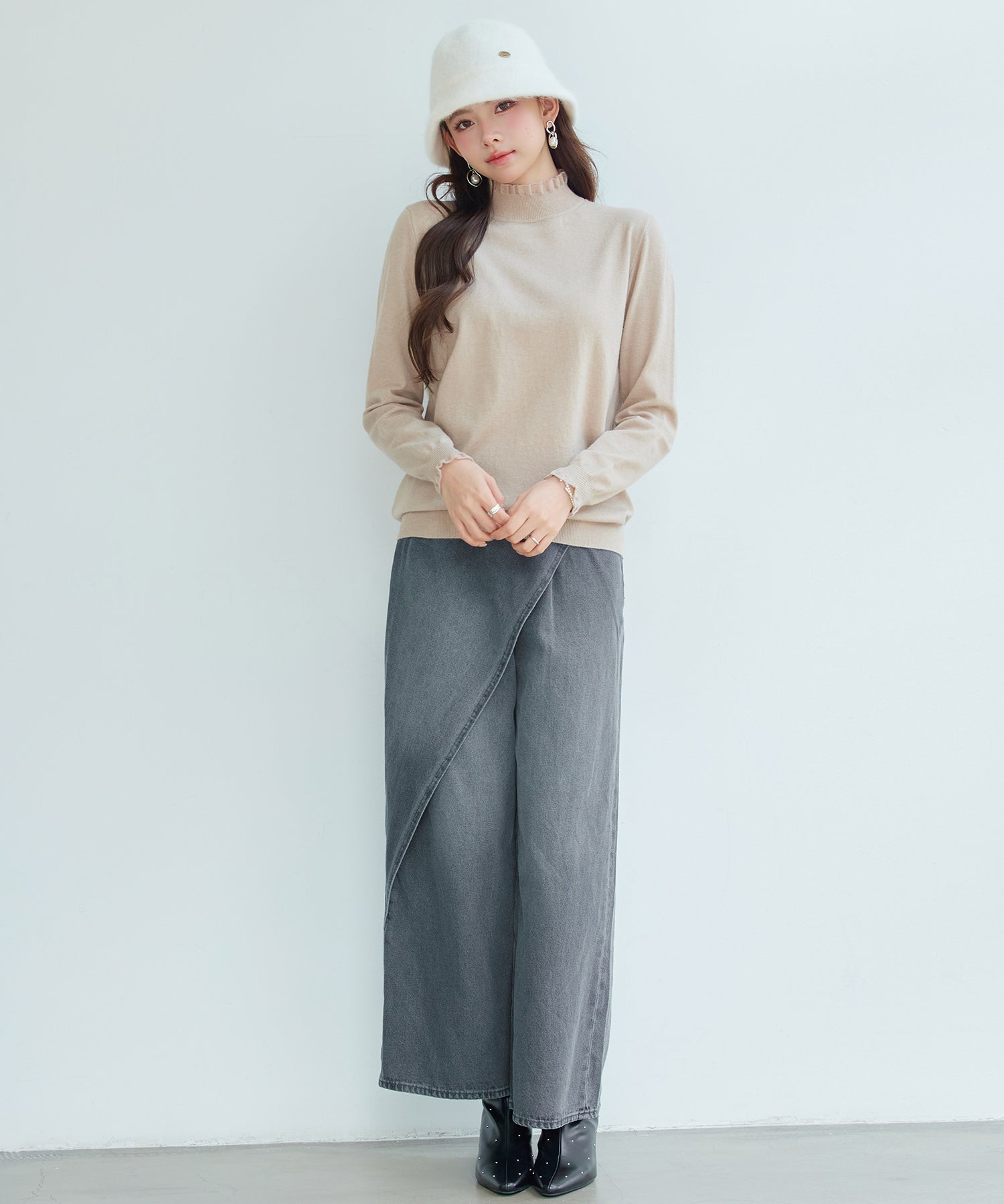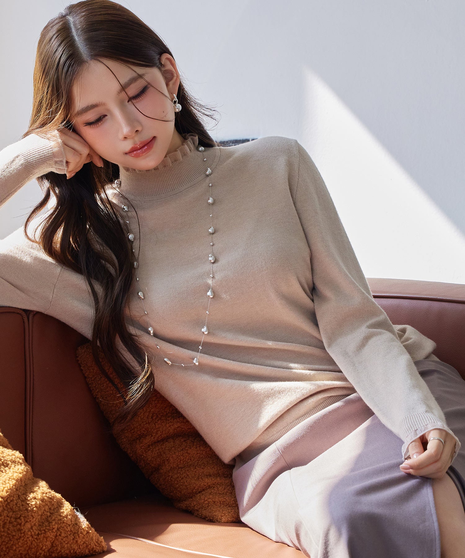 襟口と袖口のシアーフリルをドッキングした一枚でこなれ感を演出するハイネックニット。