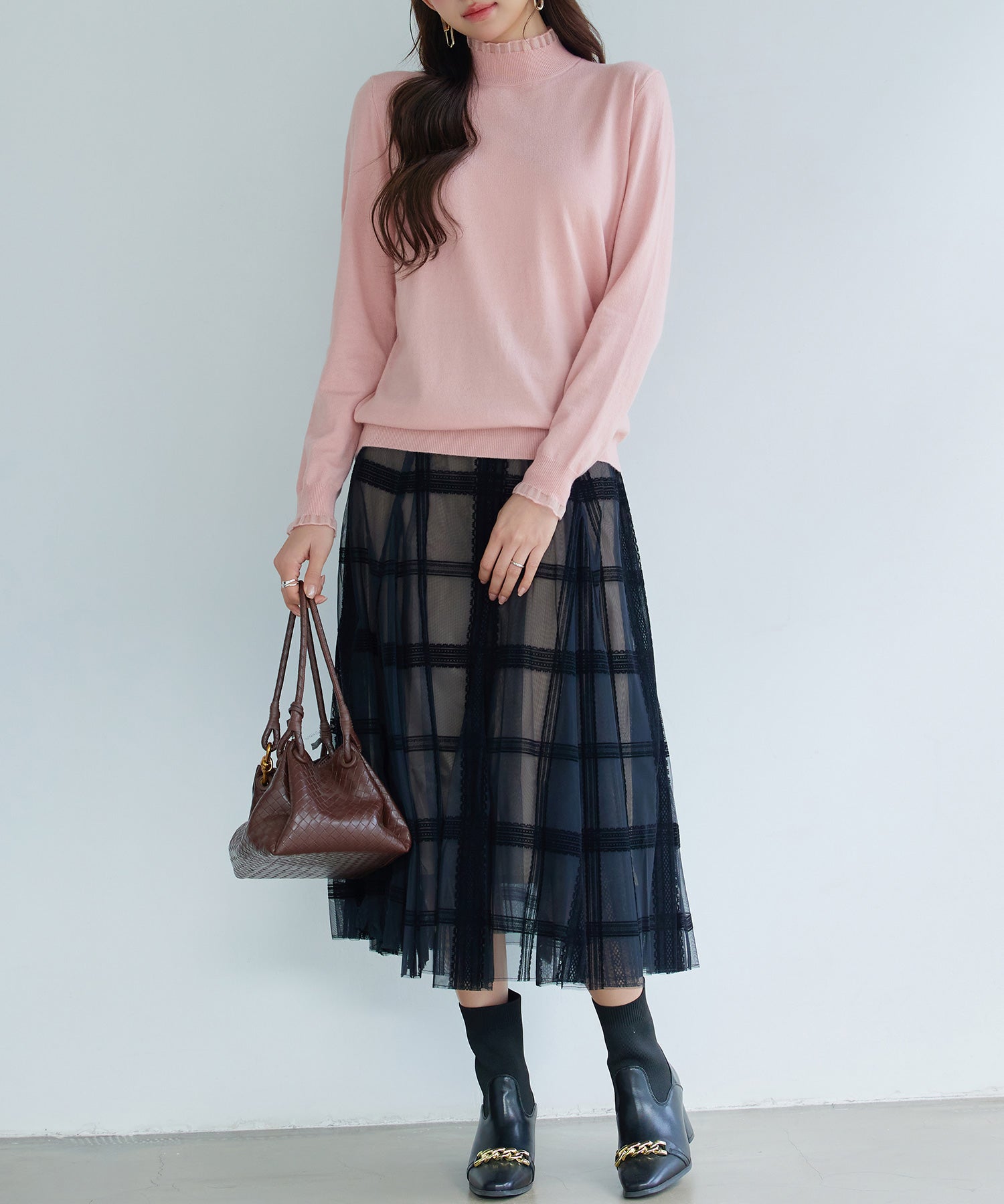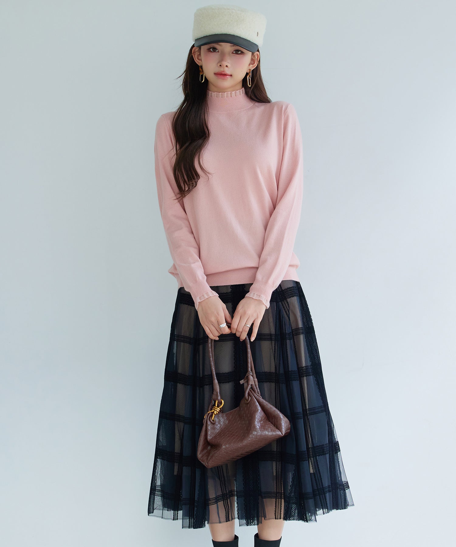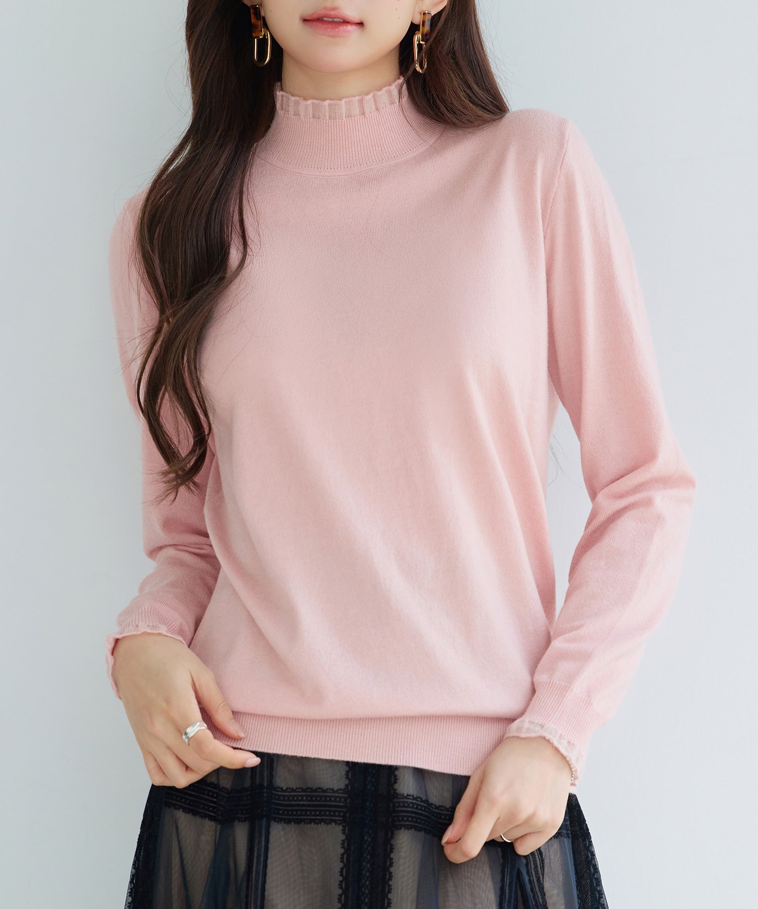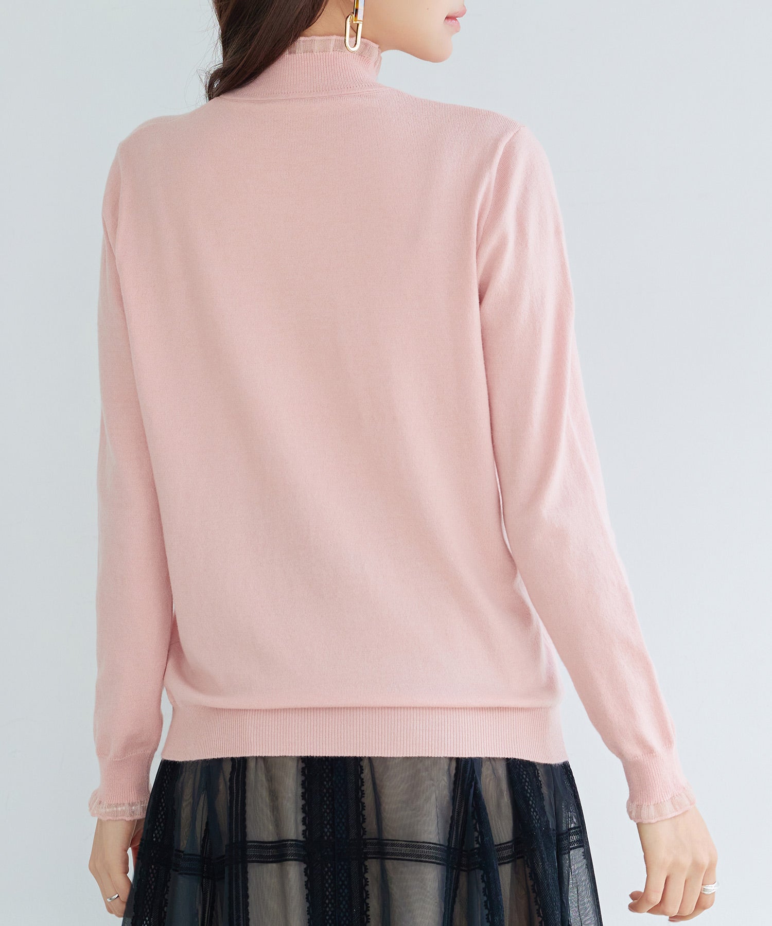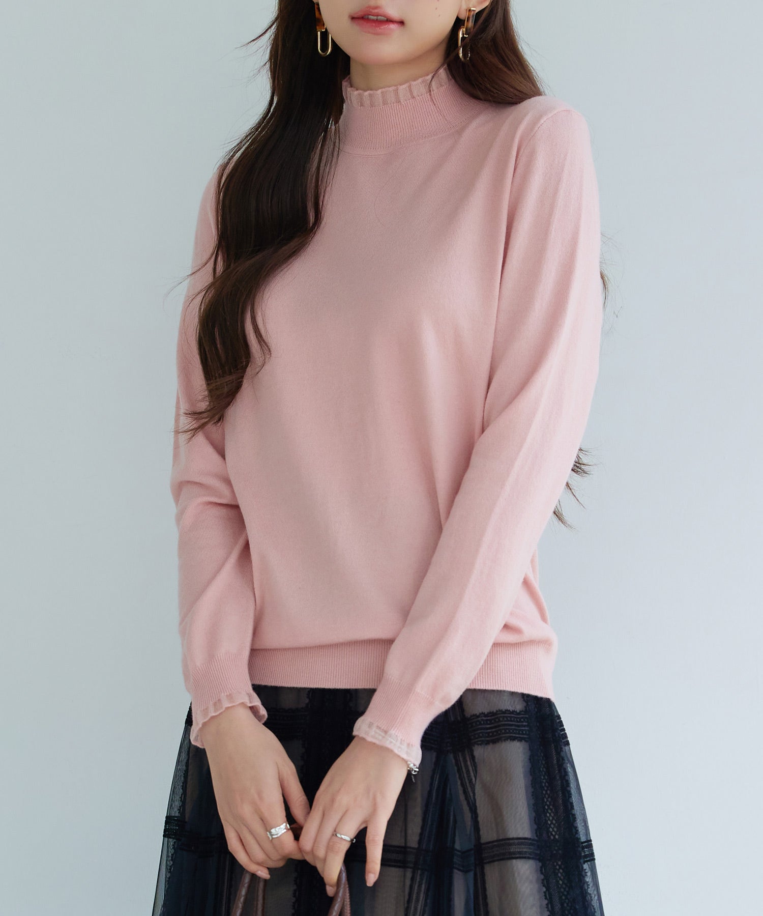 襟口と袖口のシアーフリルをドッキングした一枚でこなれ感を演出するハイネックニット。