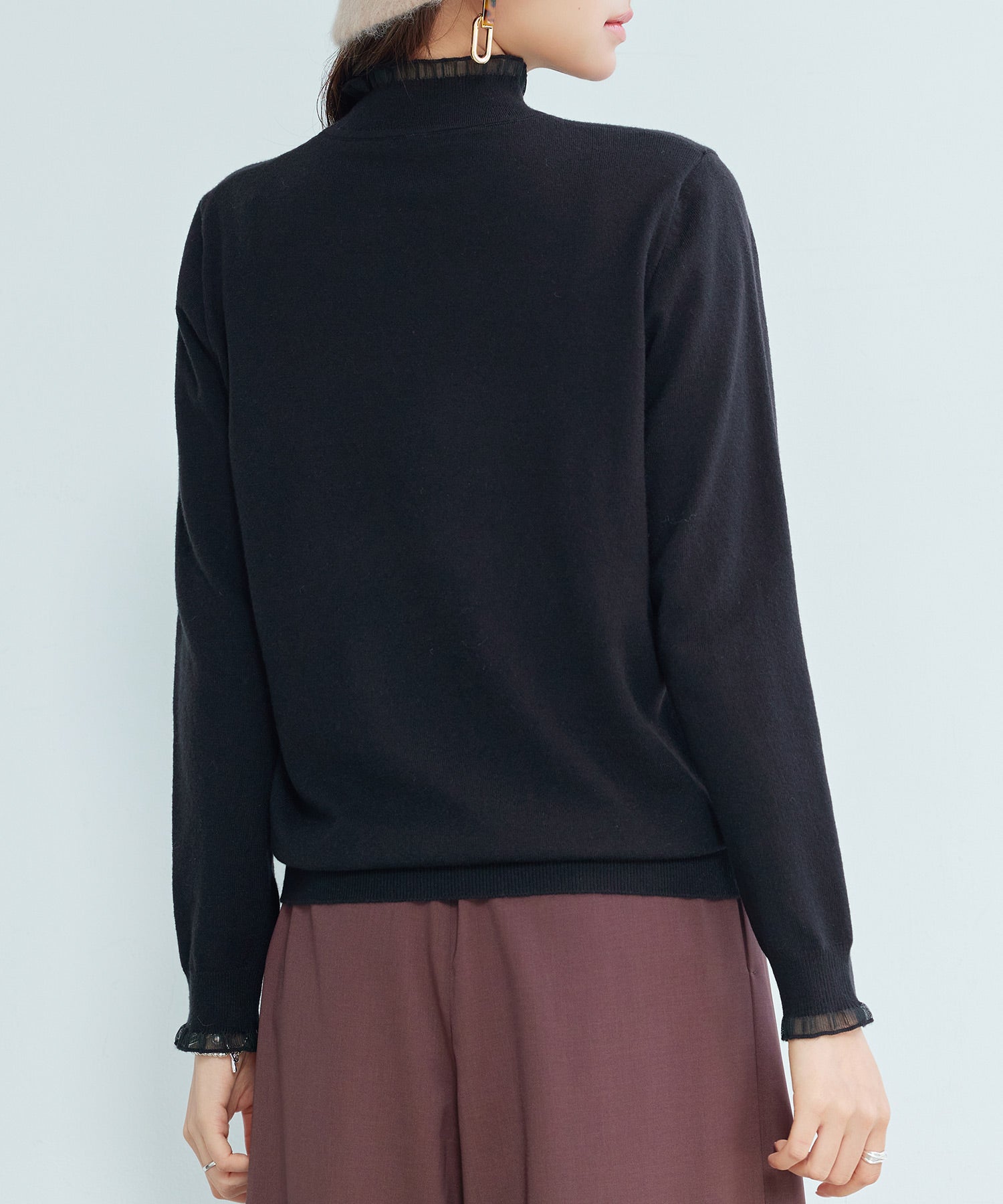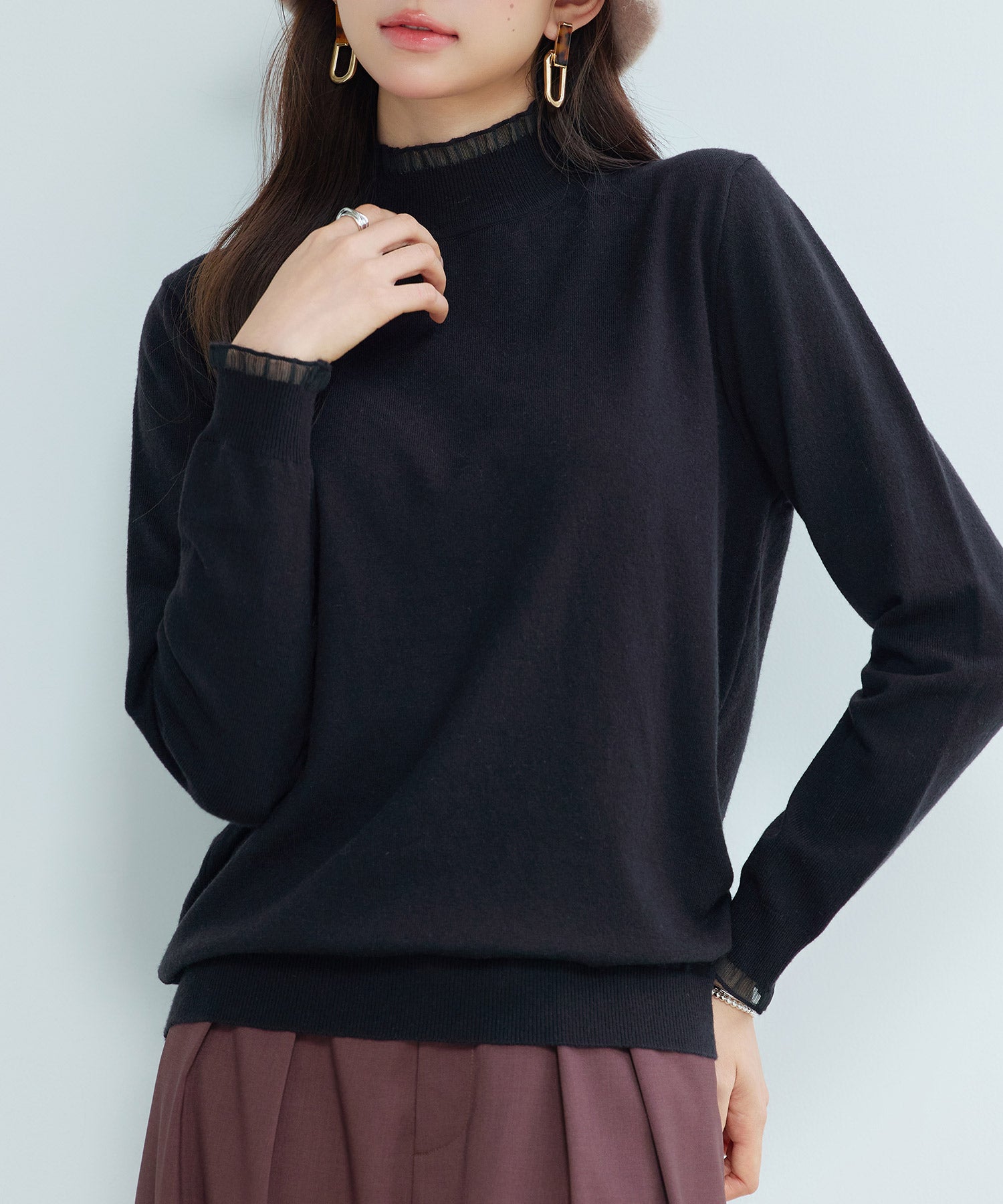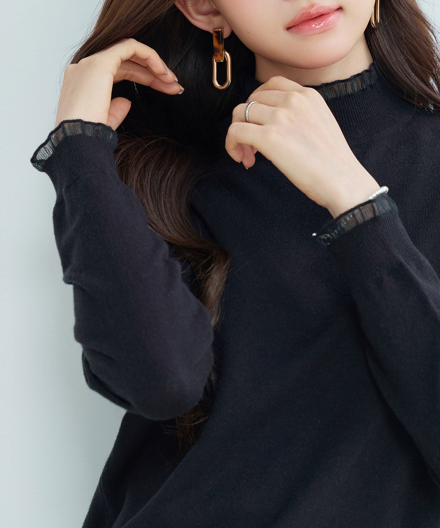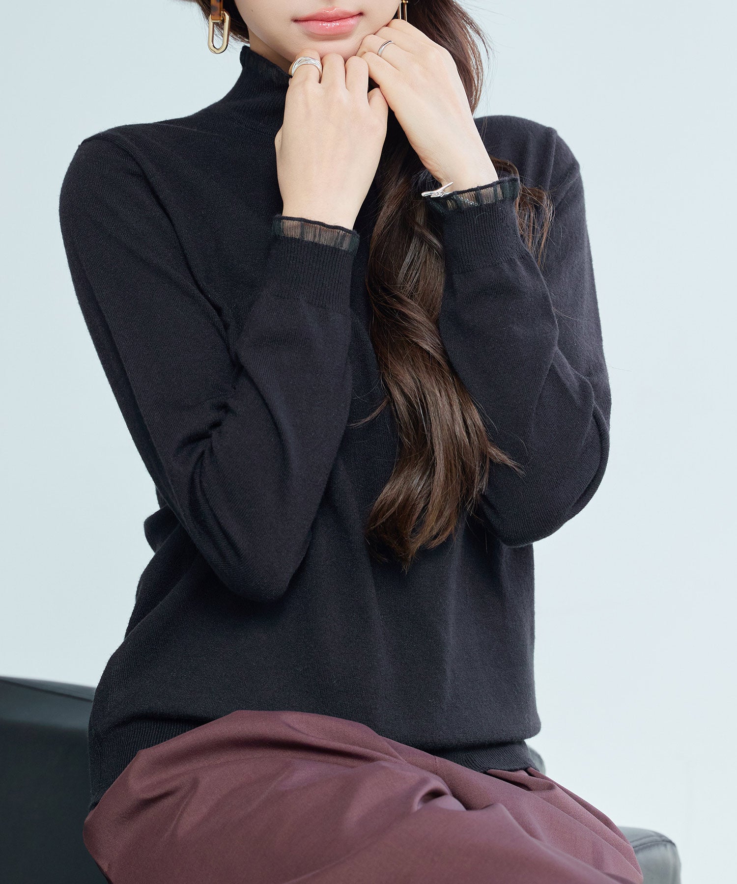 襟口と袖口のシアーフリルをドッキングした一枚でこなれ感を演出するハイネックニット。