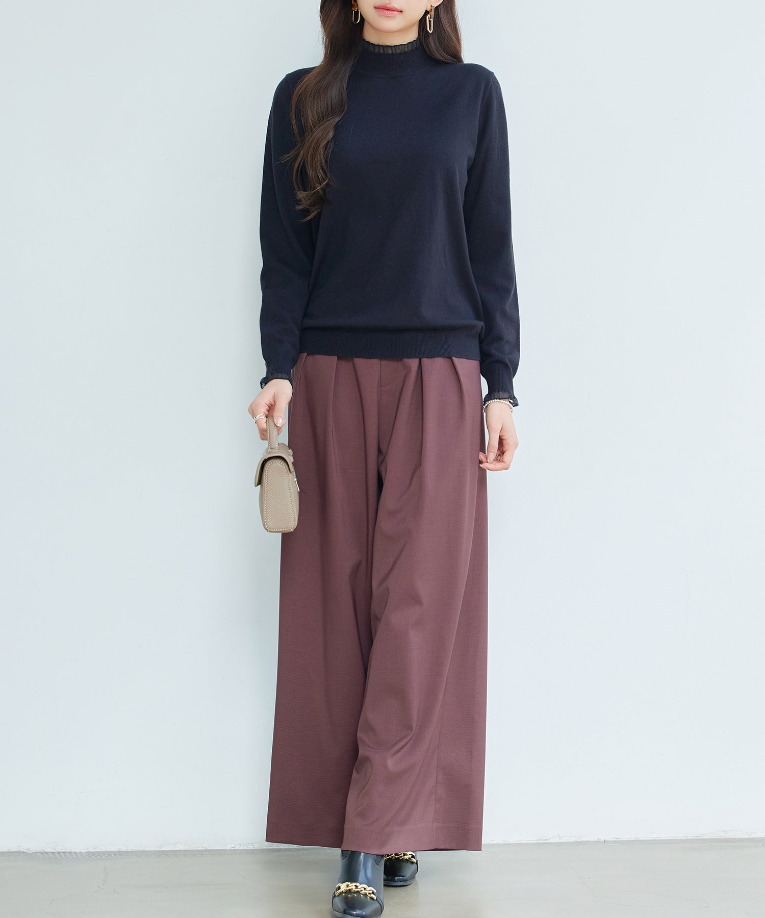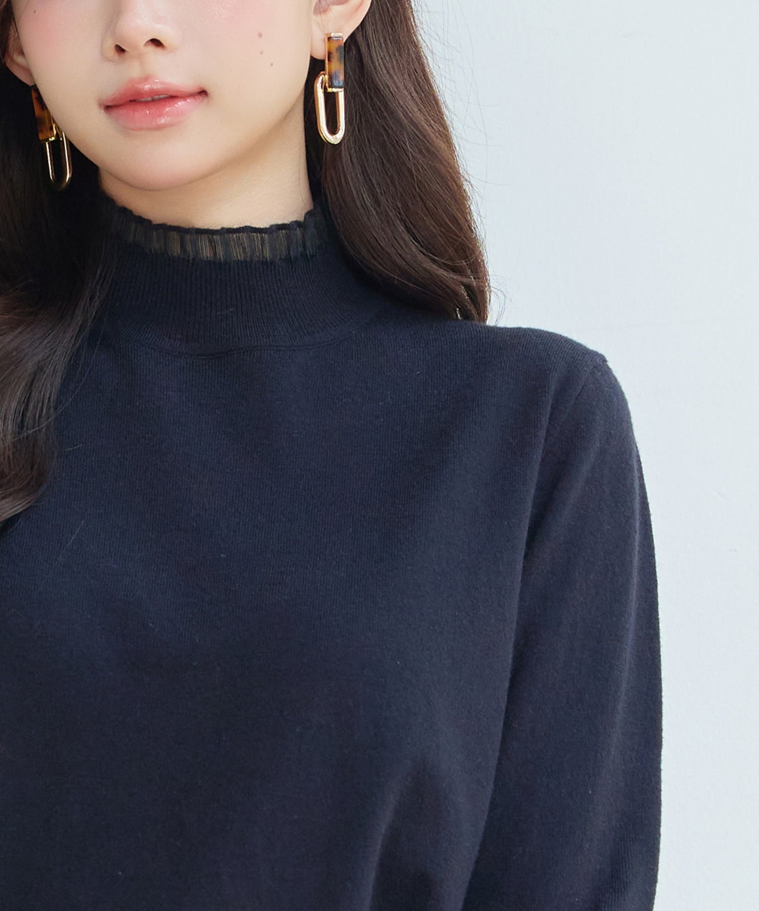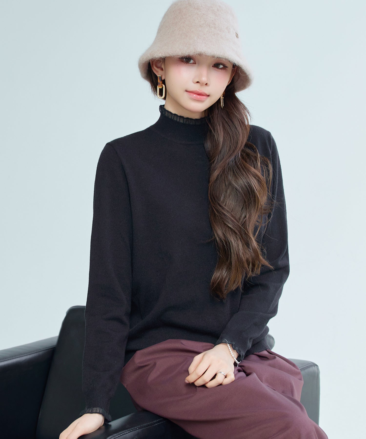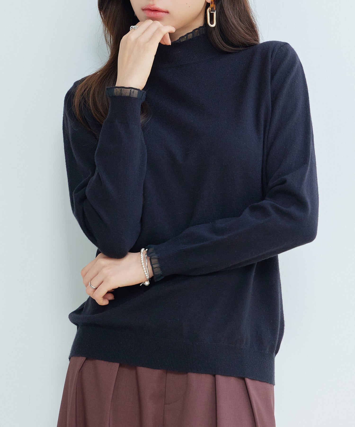 襟口と袖口のシアーフリルをドッキングした一枚でこなれ感を演出するハイネックニット。