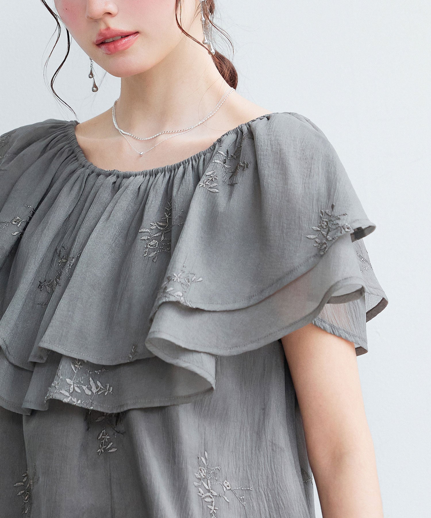 ヨーク部分はボリューム感たっぷりの2段フリル仕様。華やかな胸元で装いをガーリーに仕立てます。