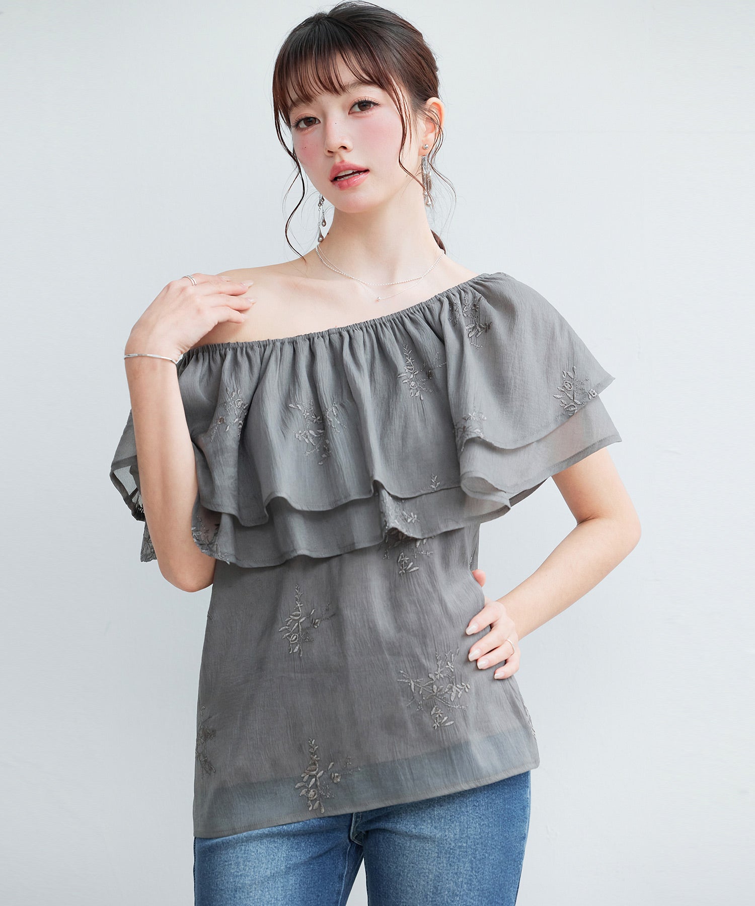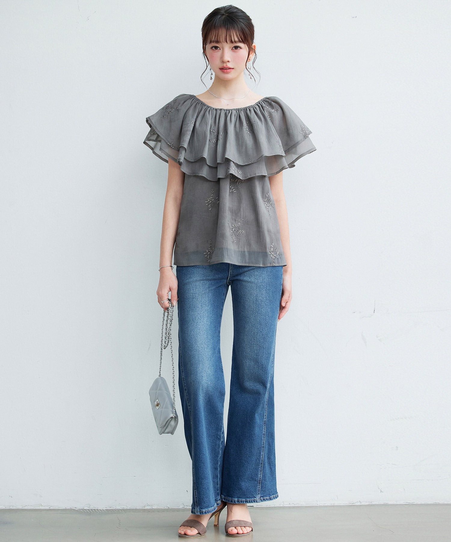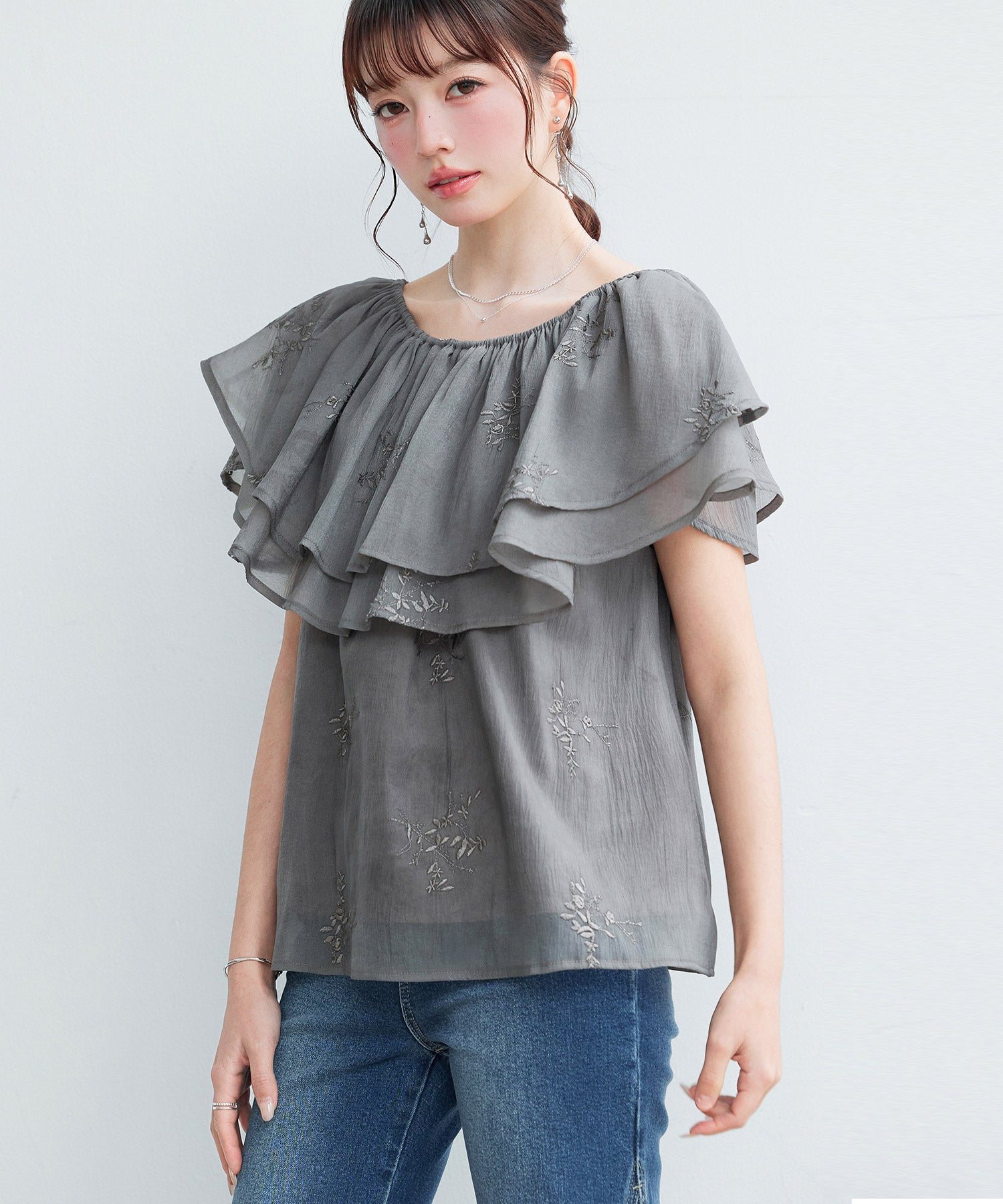 ふんわり軽いオーガンジー素材のシアーブラウスです。オーガンジーには小花柄の刺繍入りでディテールまで可愛らしく決まります。