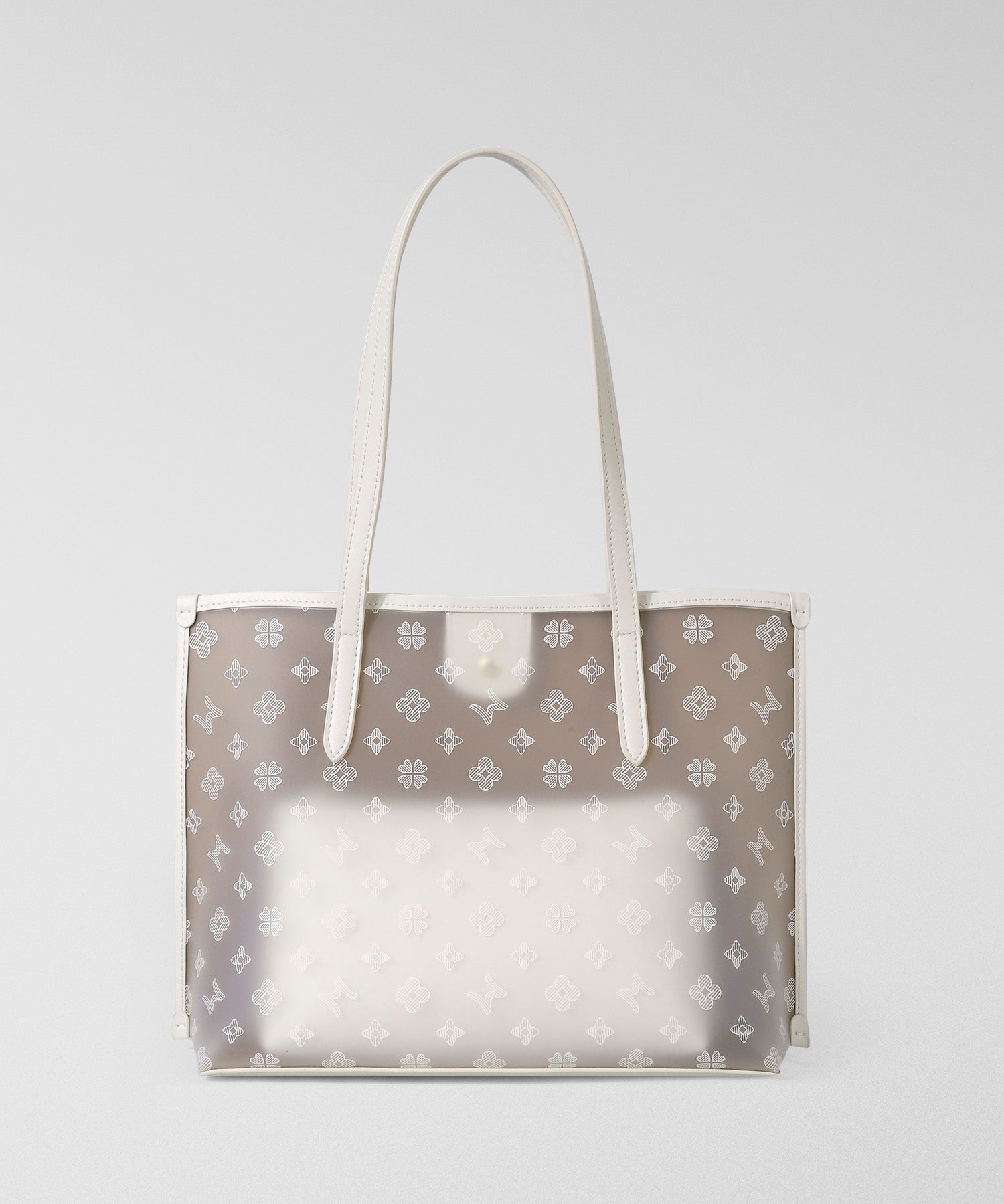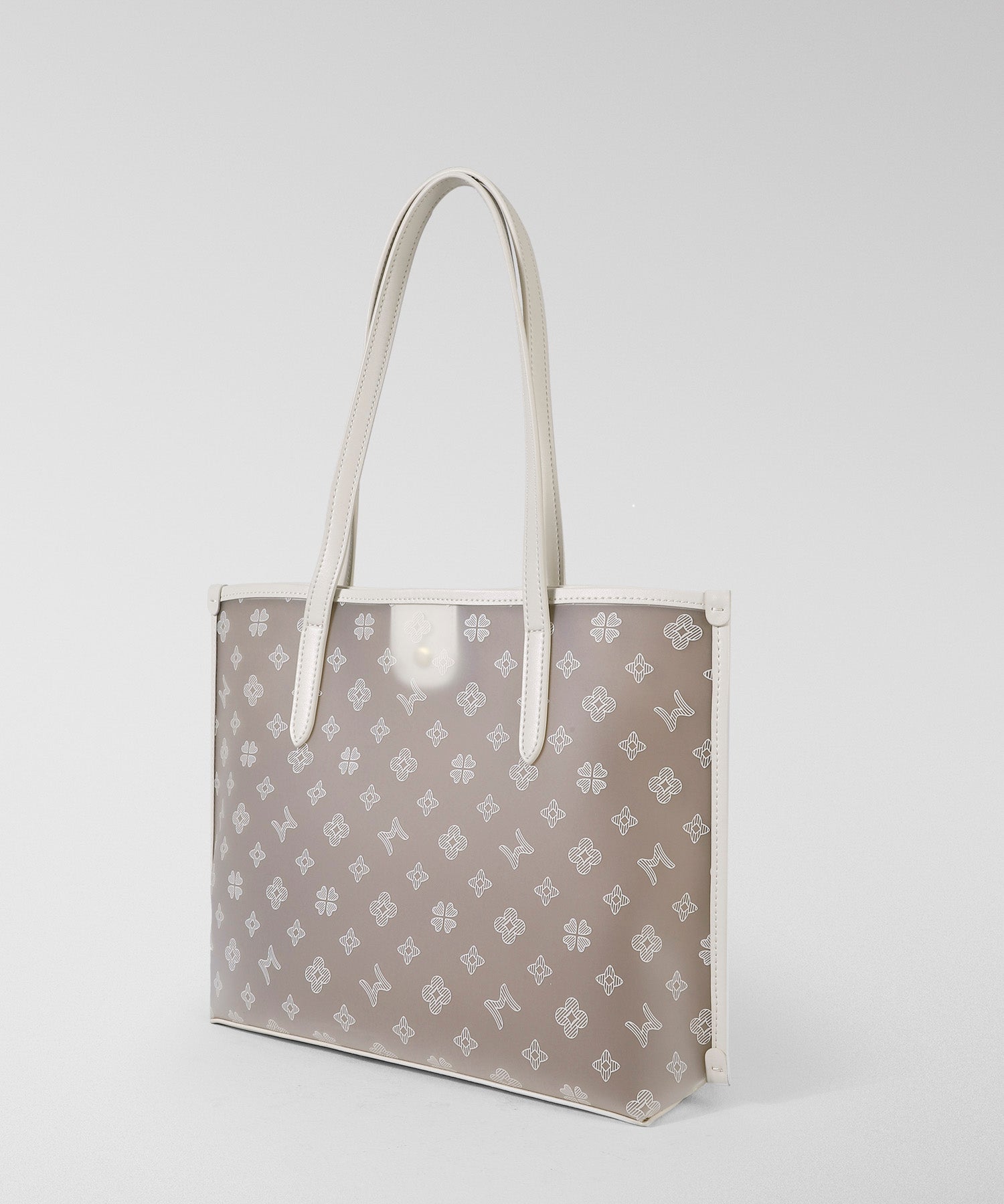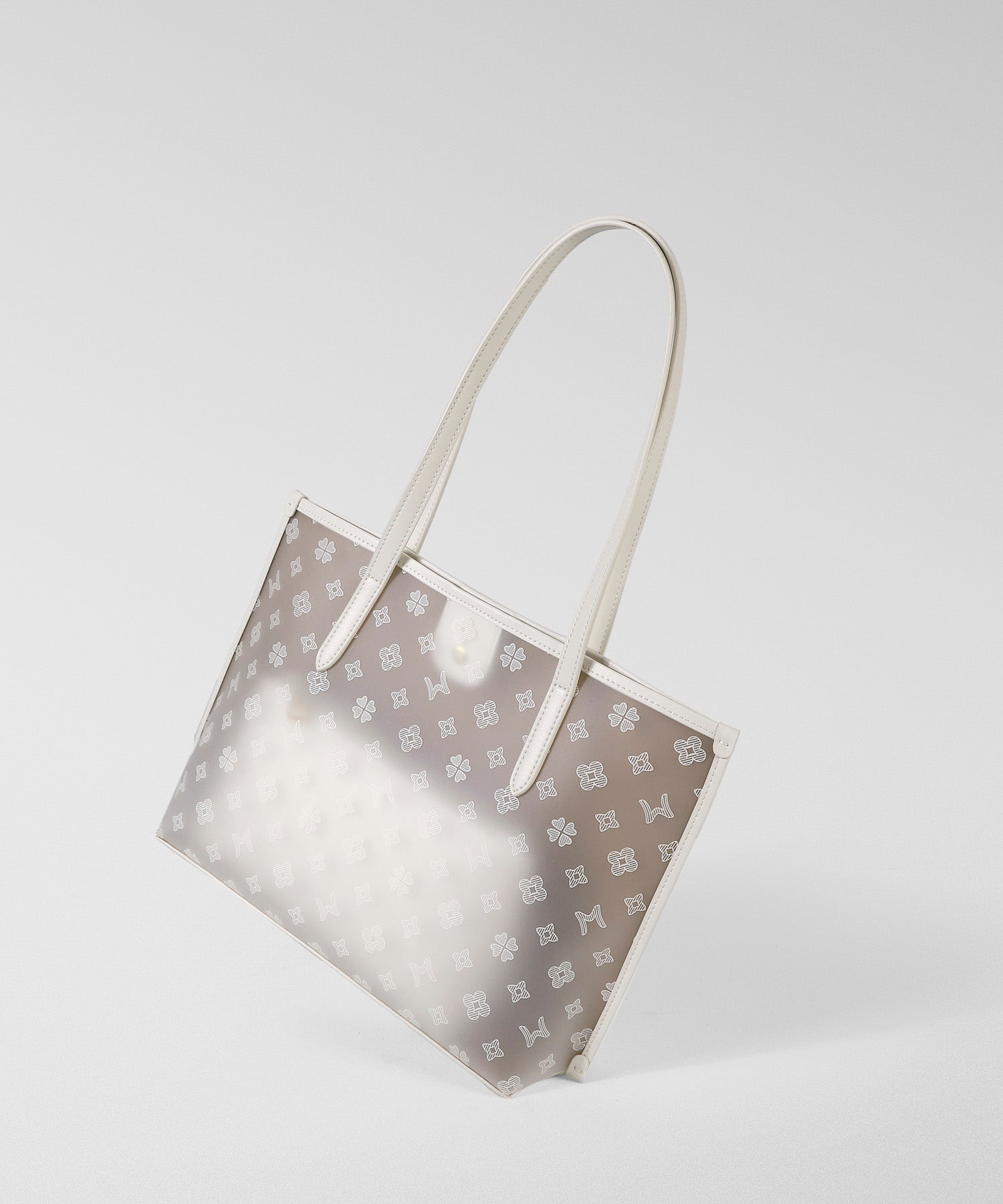 フロント部分がクリア素材になっており、透け感のあるモノグラムが華やかで目を惹きます。品よく持てるくすみピンクと、ホワイトの2色展開で、いつものコーデにプラスするだけで今年らしい鮮度の高いスタイリングが完成します。