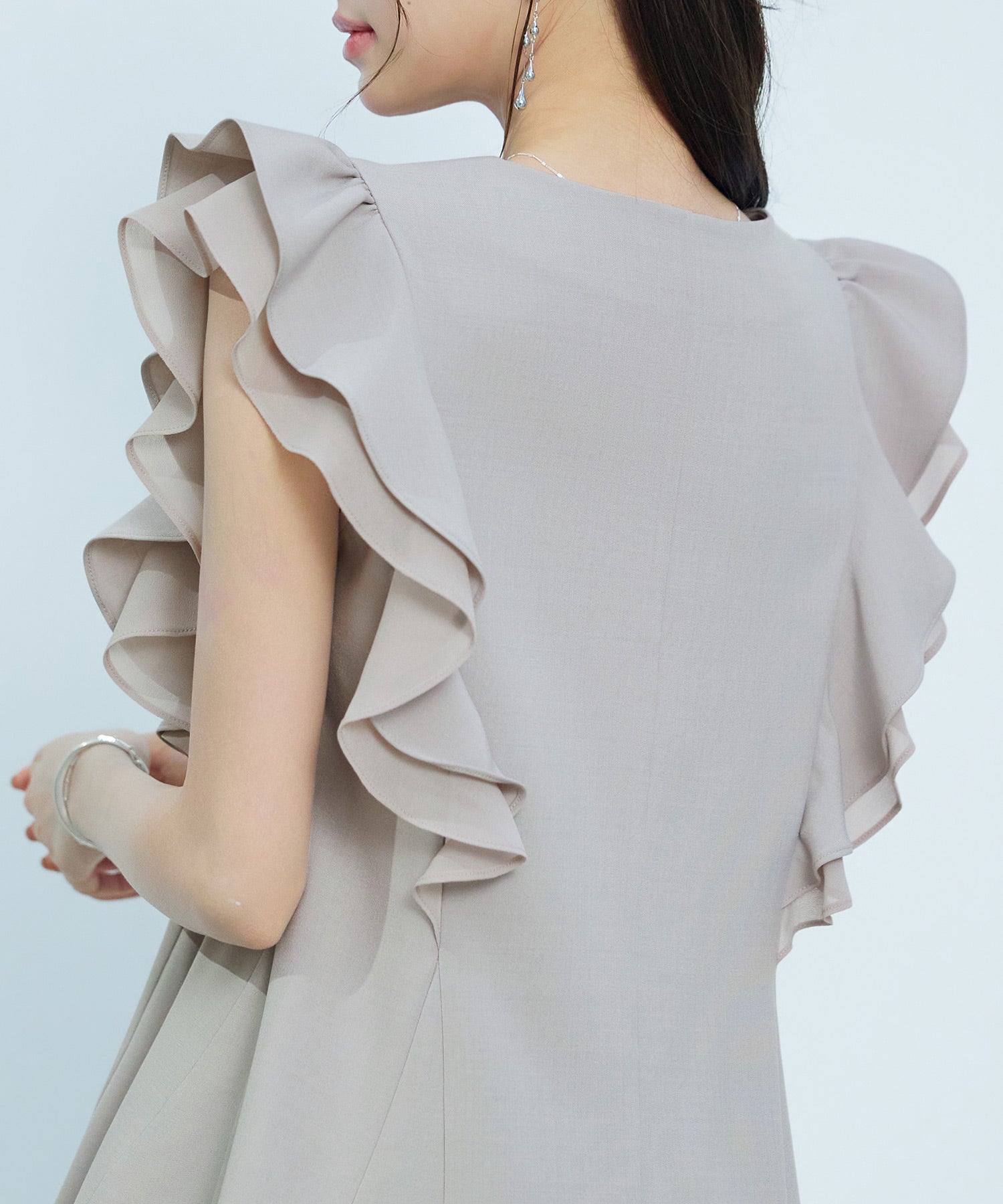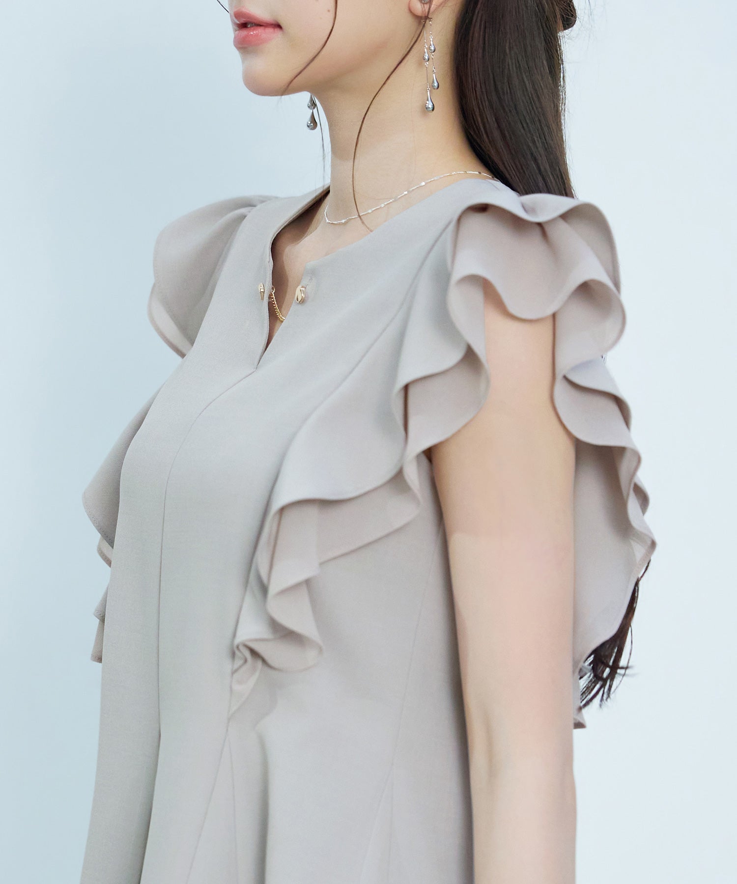 ダブルフリル仕様になったスリーブデザインです。華やかさに加え、二の腕カバーにも役立ちます。パーティーシーンに映える一枚です。二枚目フリル部分はシフォン生地で変化のあるデザインが高見えします。