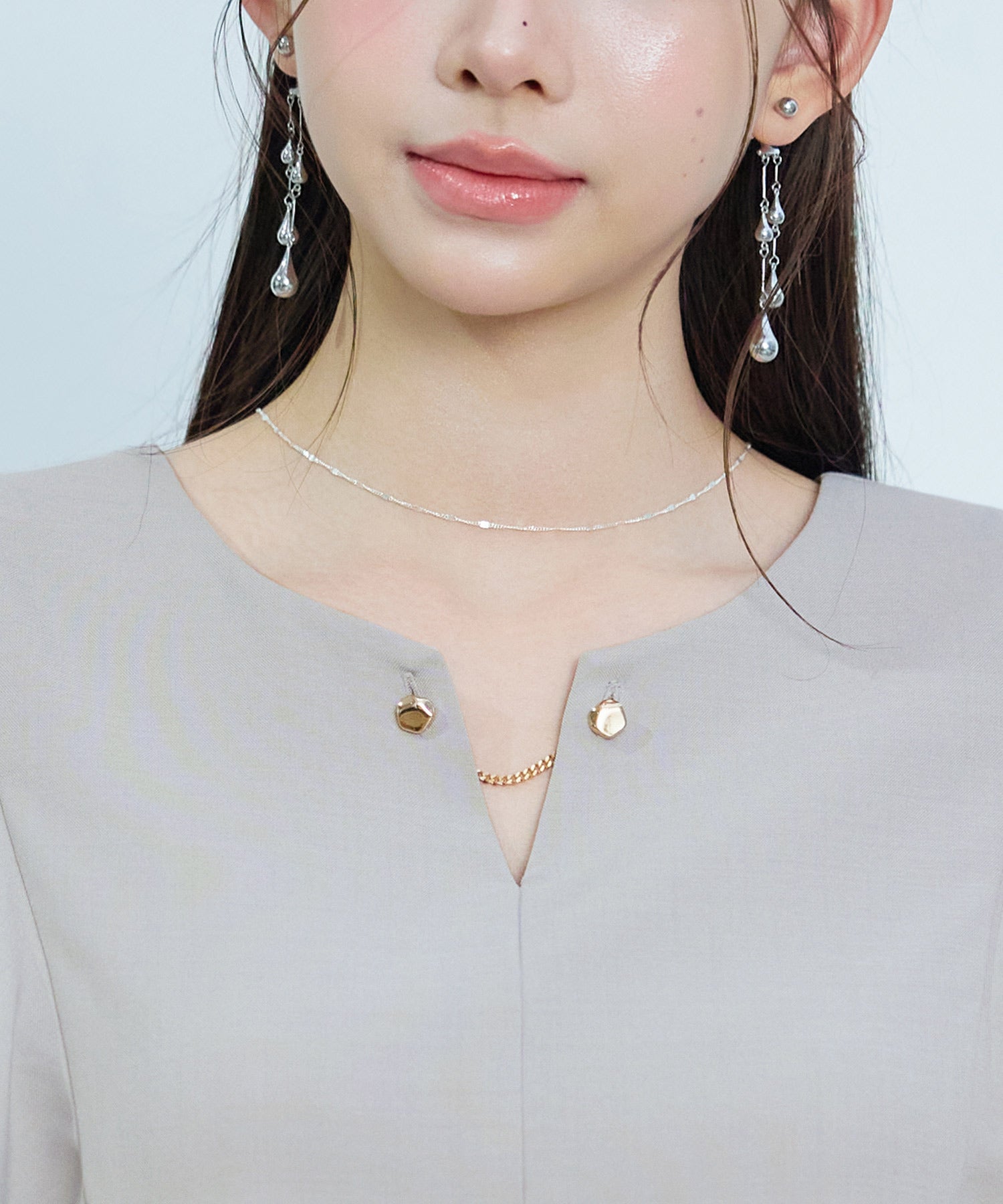 首回りがデザインされたキーネック仕様のブラウスです。くぼみ中央には金属チェーンがあしらわれ、ネックレスいらずで華やか見えします。