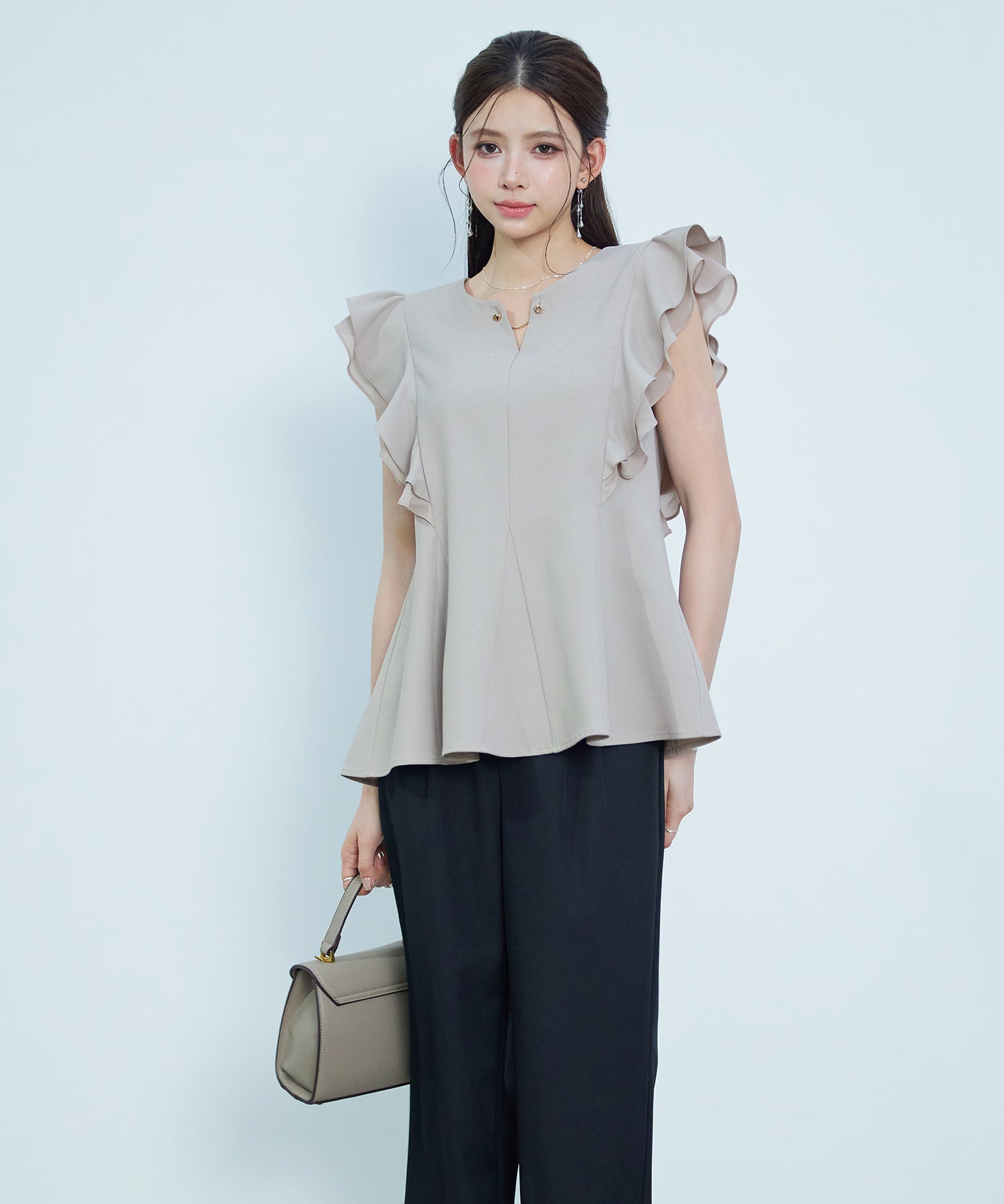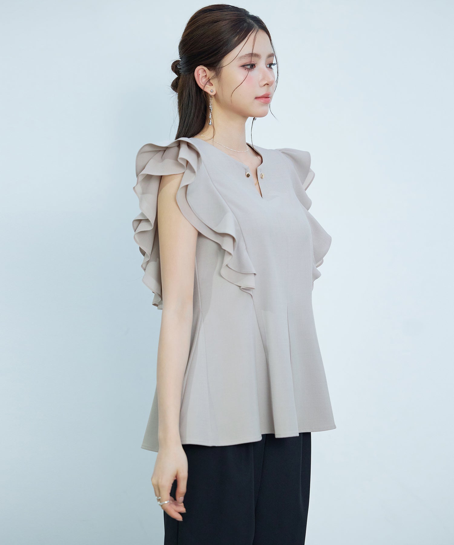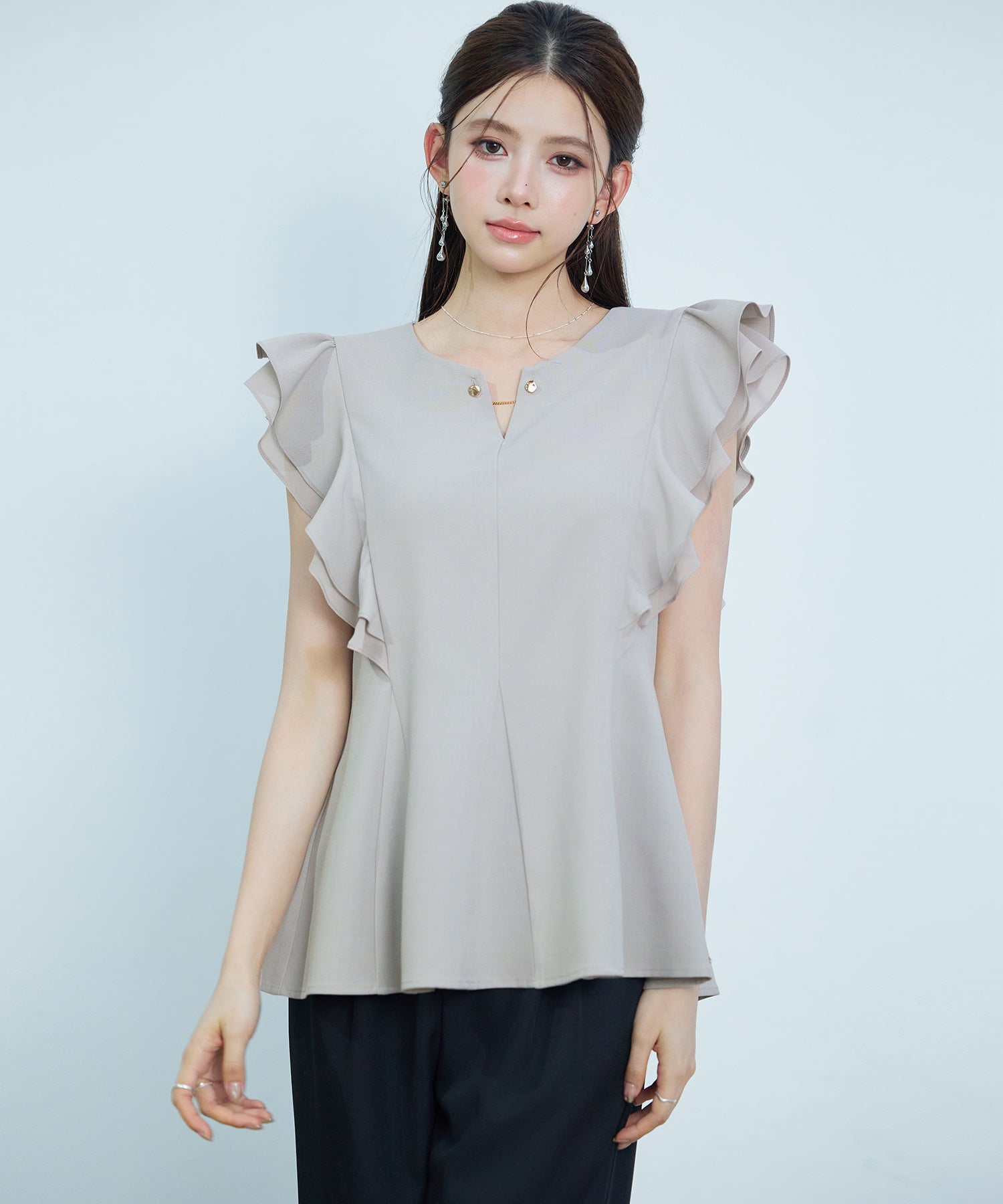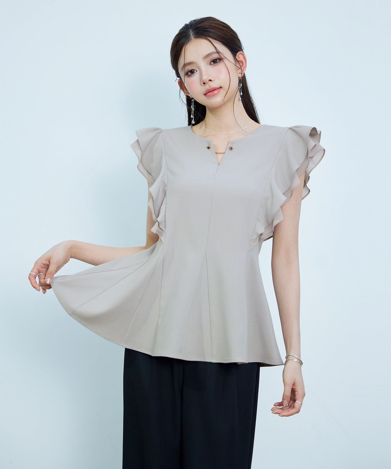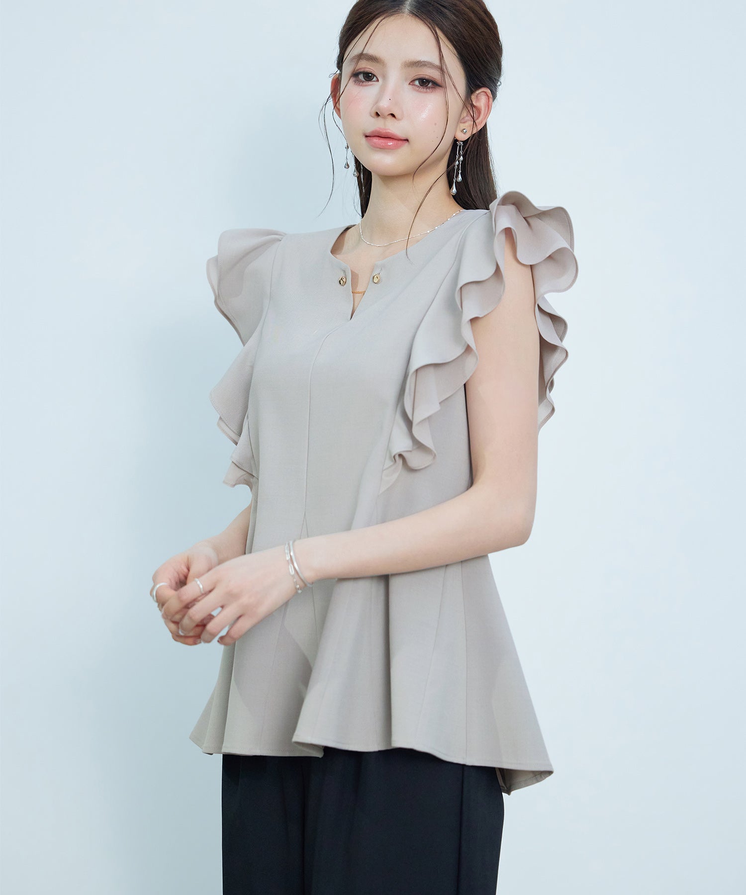 女性らしいフレアシルエットとフリルスリーブのキーネックブラウス。