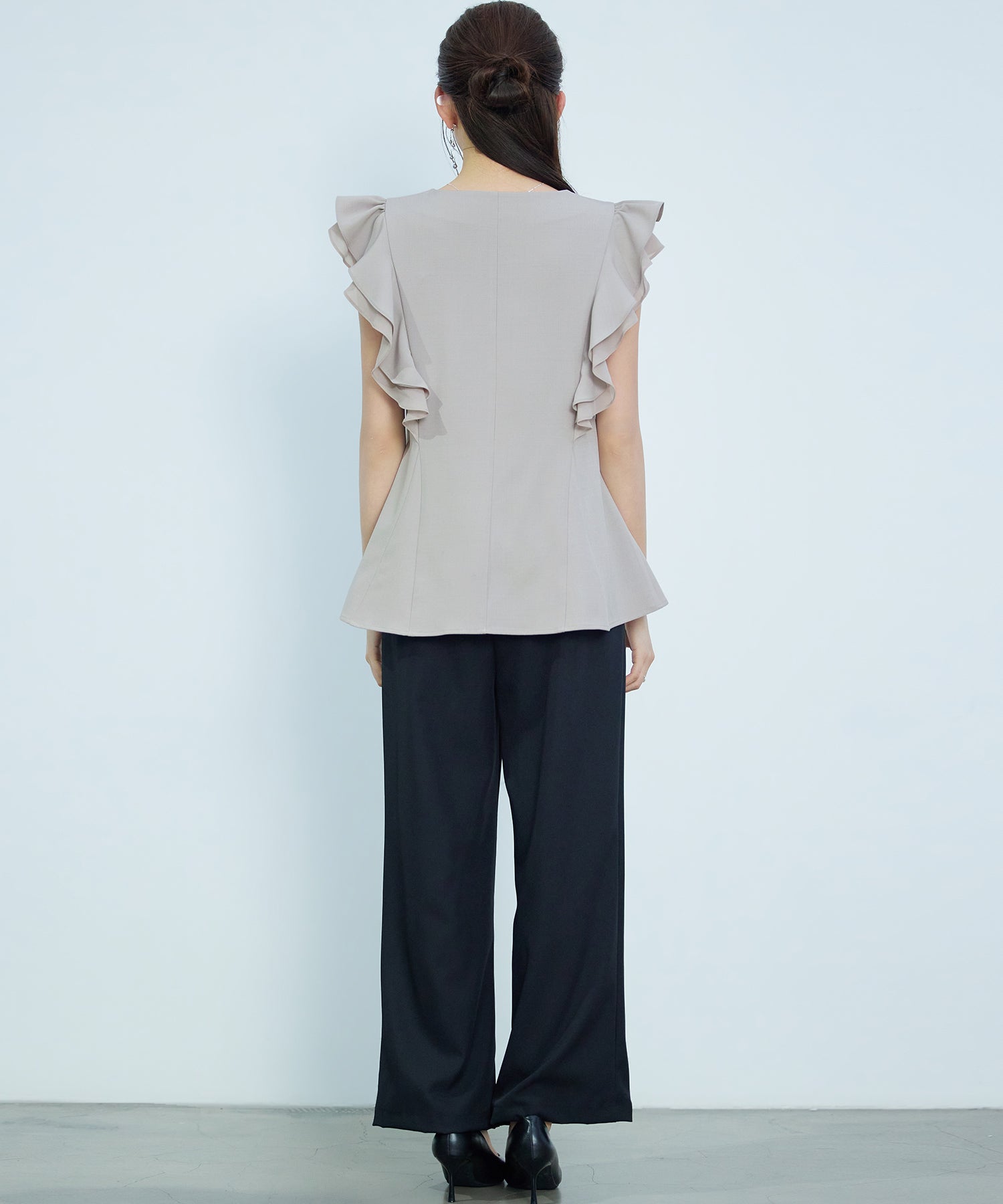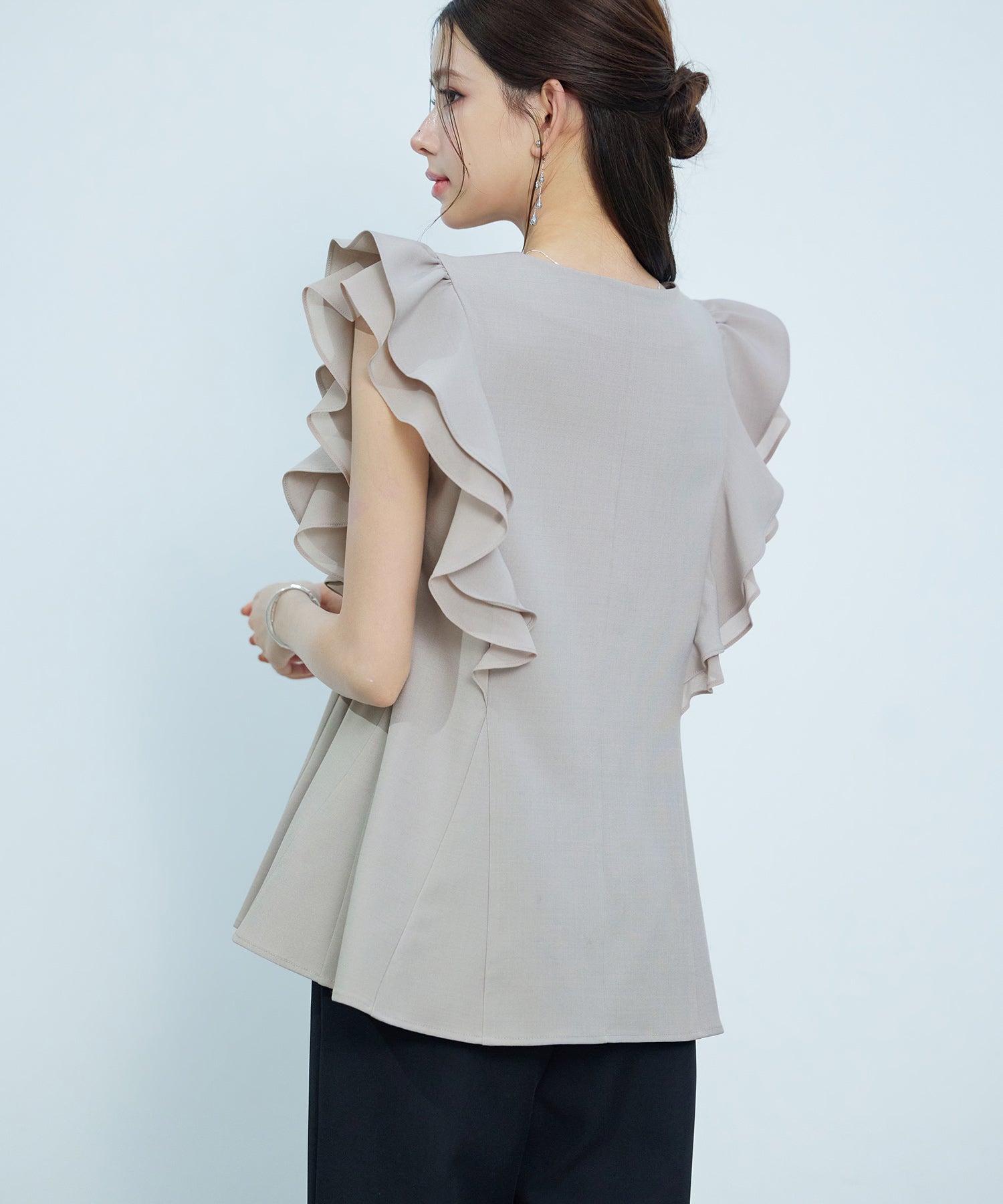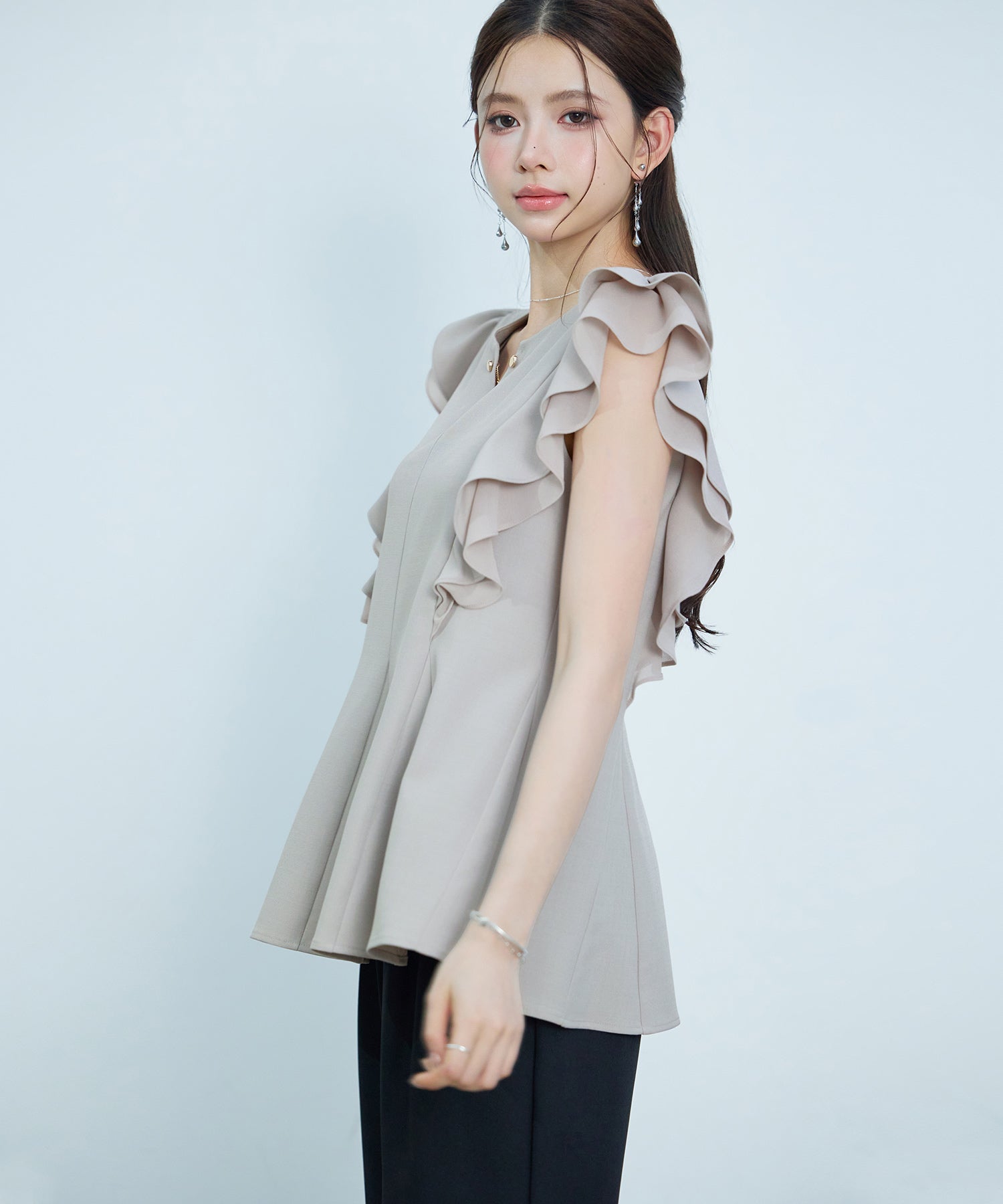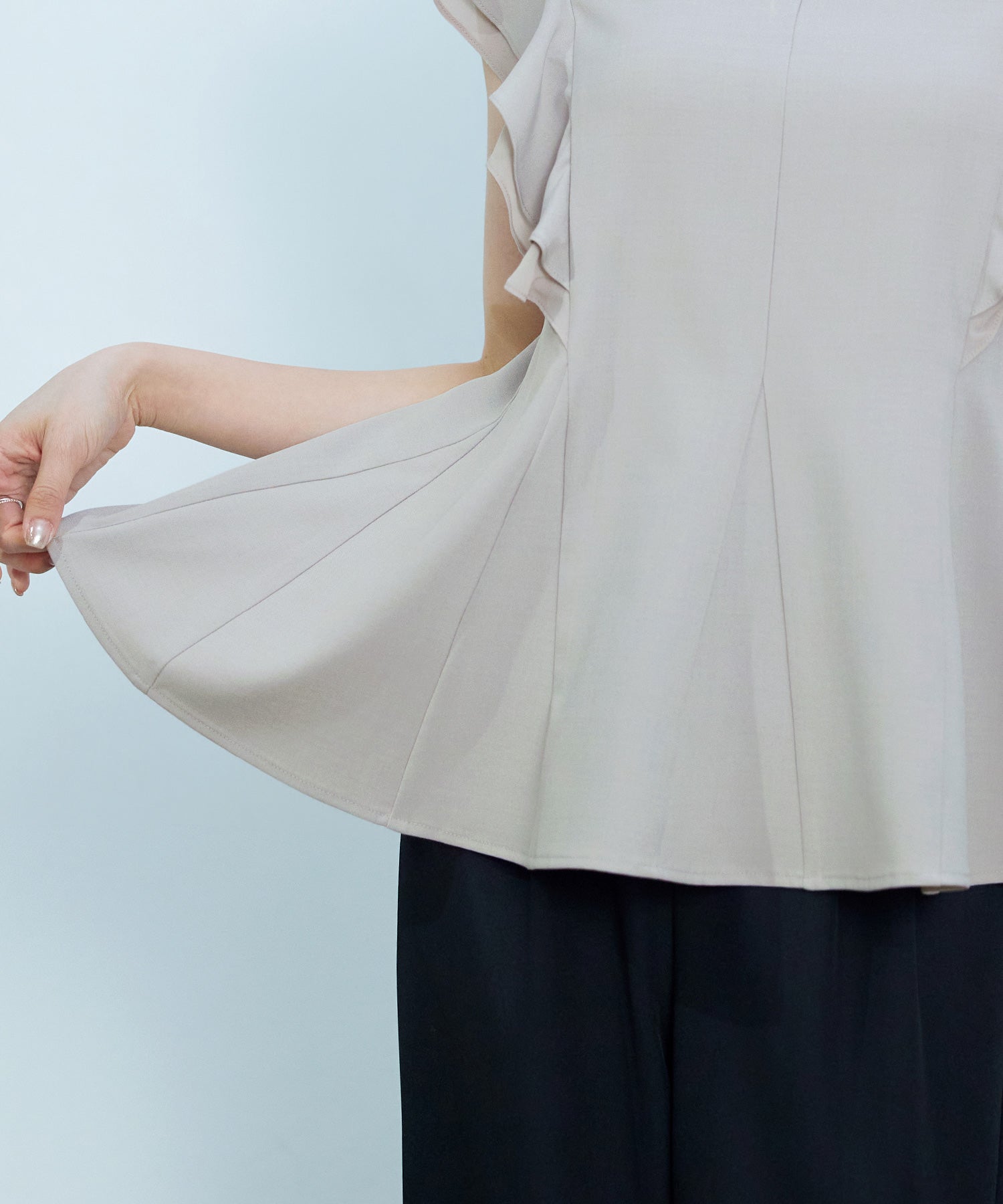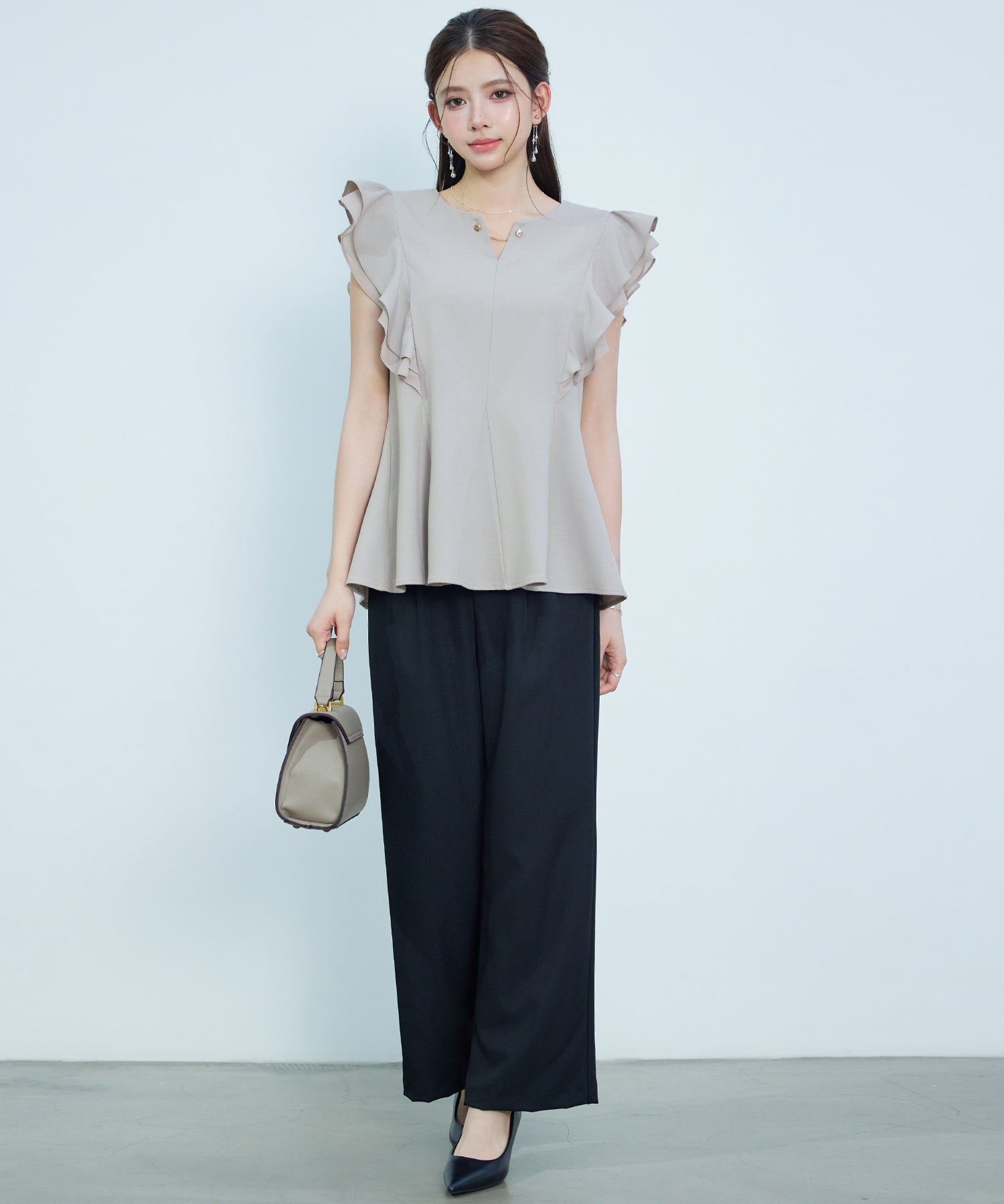 女性らしいフレアシルエットとフリルスリーブのキーネックブラウス。